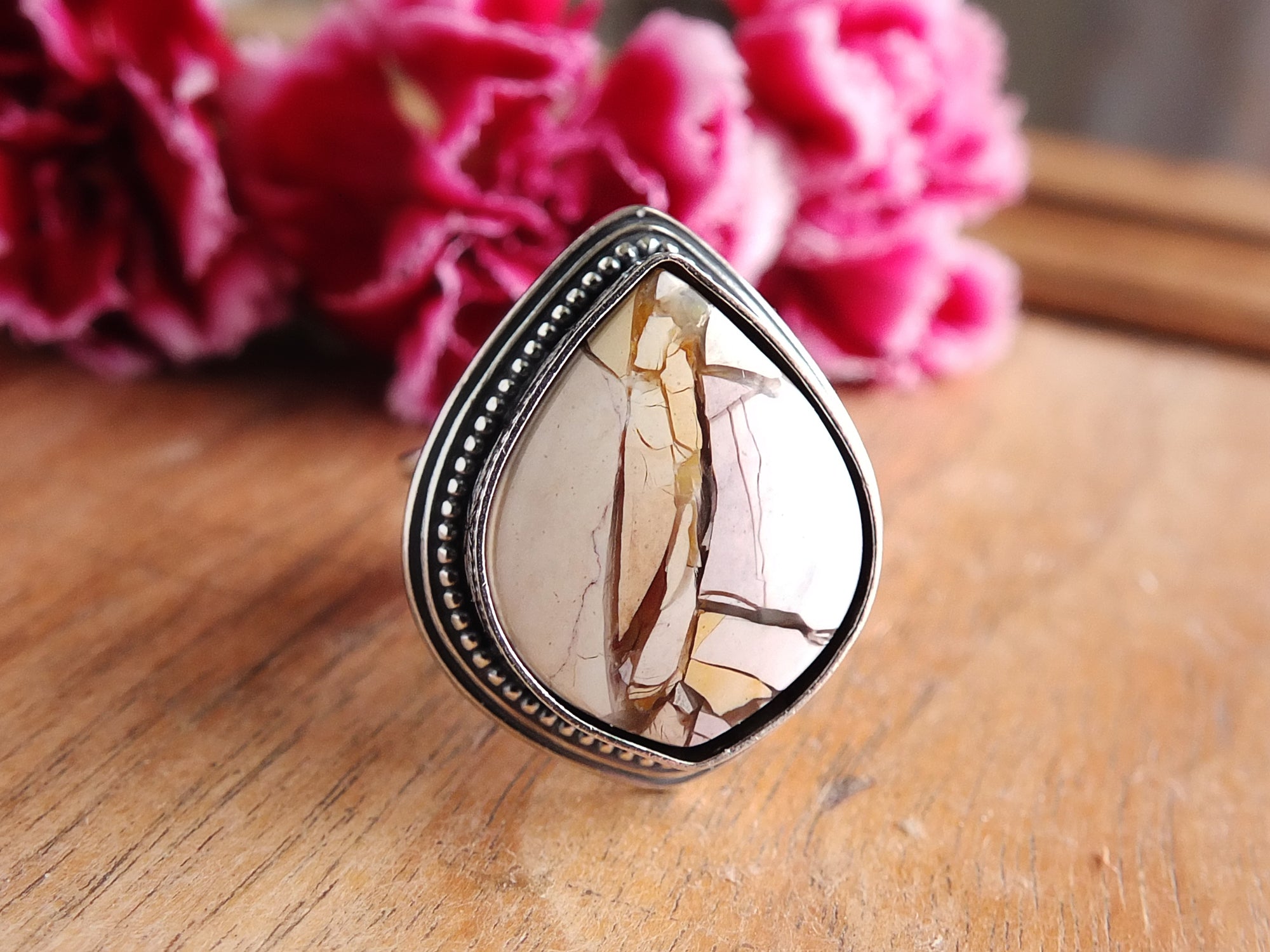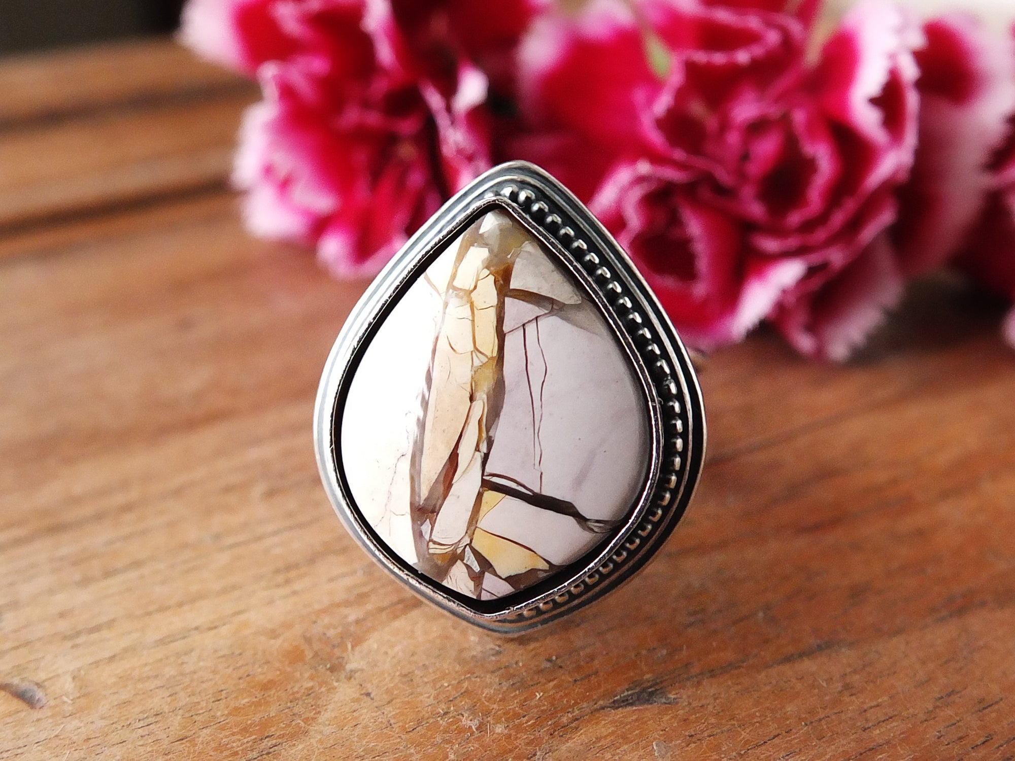 This artisan ring is available for custom sizing. The ring features a beautiful softly colored Brecciated Mookaite cabochon. The ring photographed is a mock-up of the final design. The stone is currently floating in the setting. When finished and properly set, the ring will have a much cleaner look. Additionally, the band design can be modified to your preference.