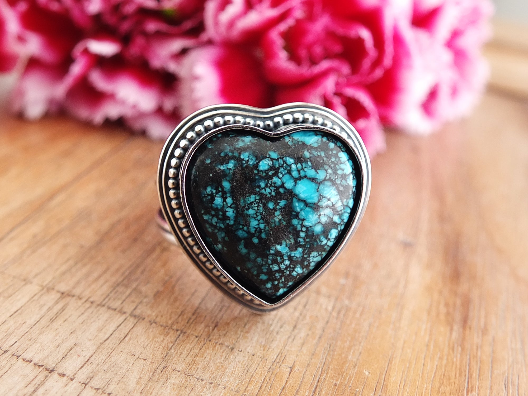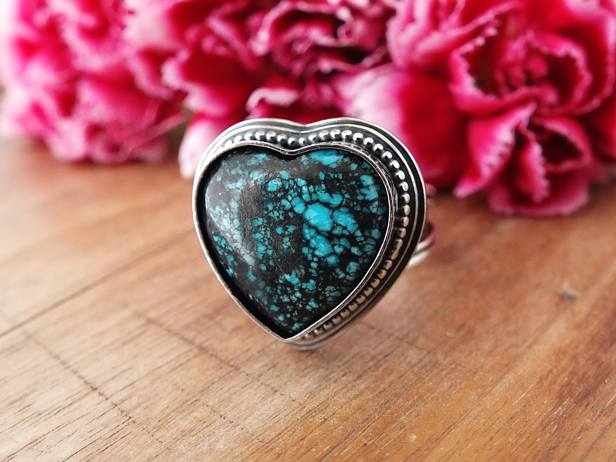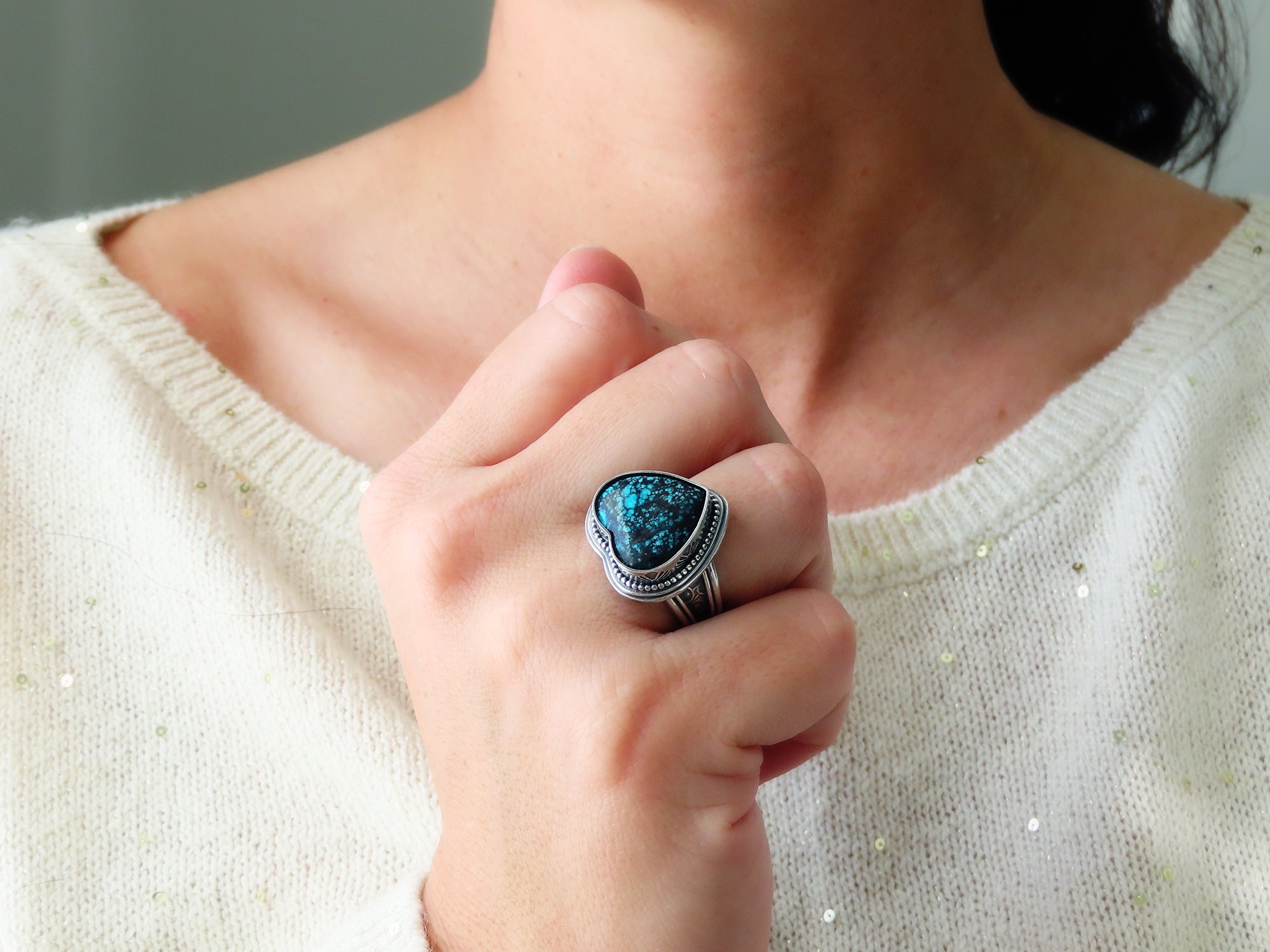 This artisan ring is available for custom sizing. The ring features a gorgeous green webbed Hubei Turquoise cabochon. The ring photographed is a mock-up of the final design. The stone is currently floating in the setting. When finished and properly set, the ring will have a much cleaner look. Additionally, the band design can be modified to your preference.