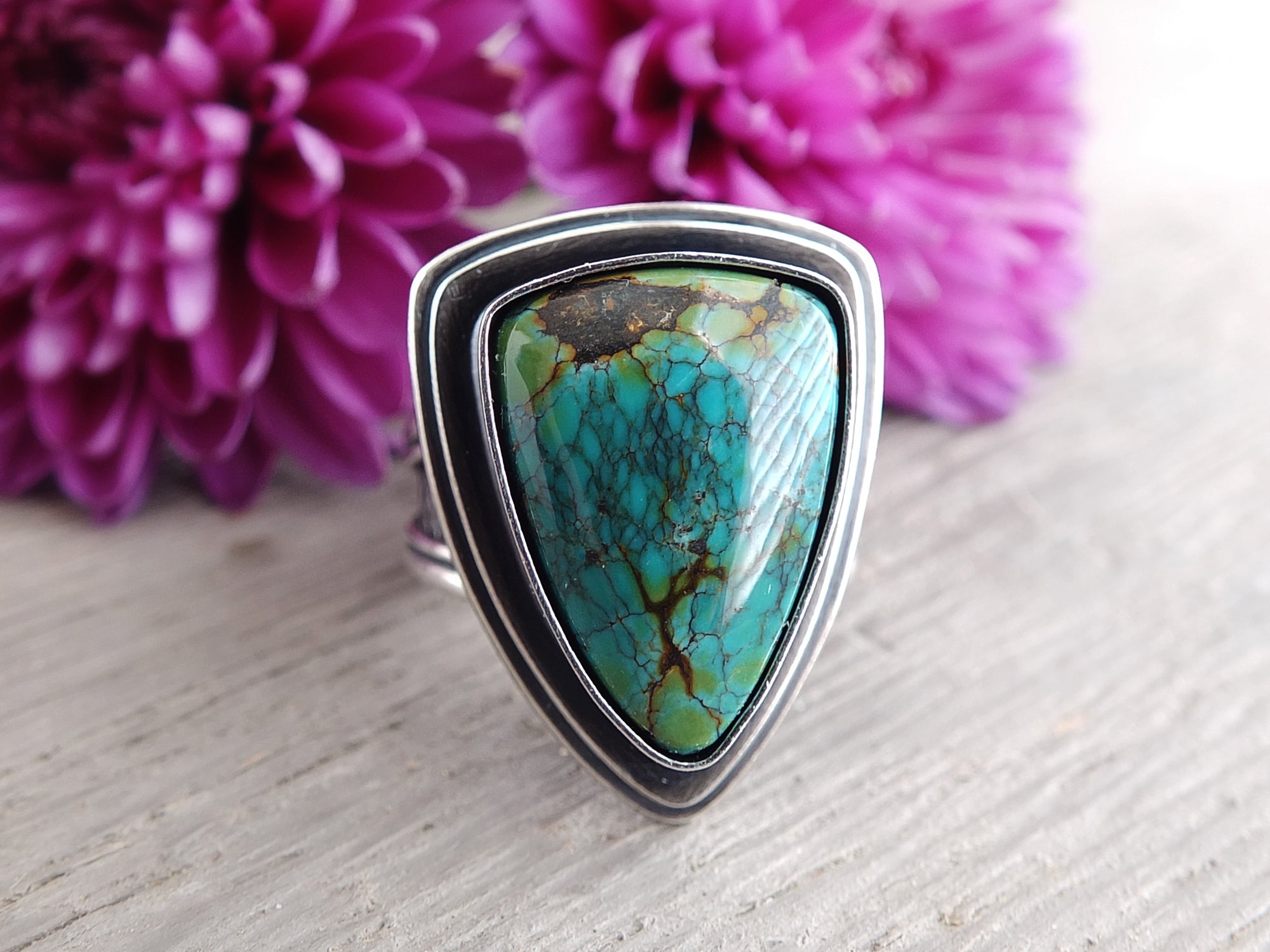 This artisan ring is available for custom sizing. The ring features a gorgeous teal green Hubei Turquoise cabochon. The ring photographed is a mock-up of the final design. The stone is currently floating in the setting. When finished and properly set, the ring will have a much cleaner look. Additionally, the band design can be modified to your preference.