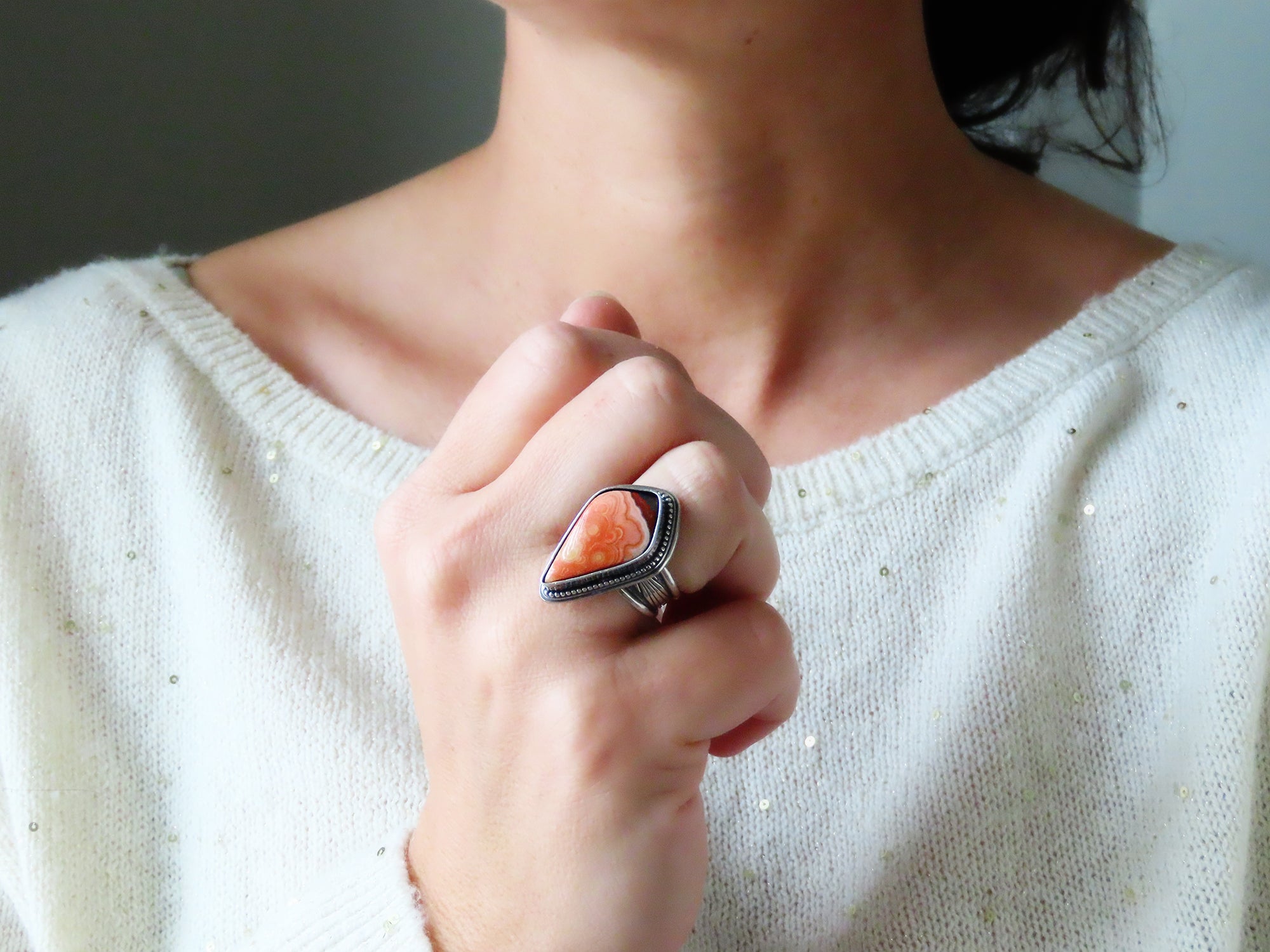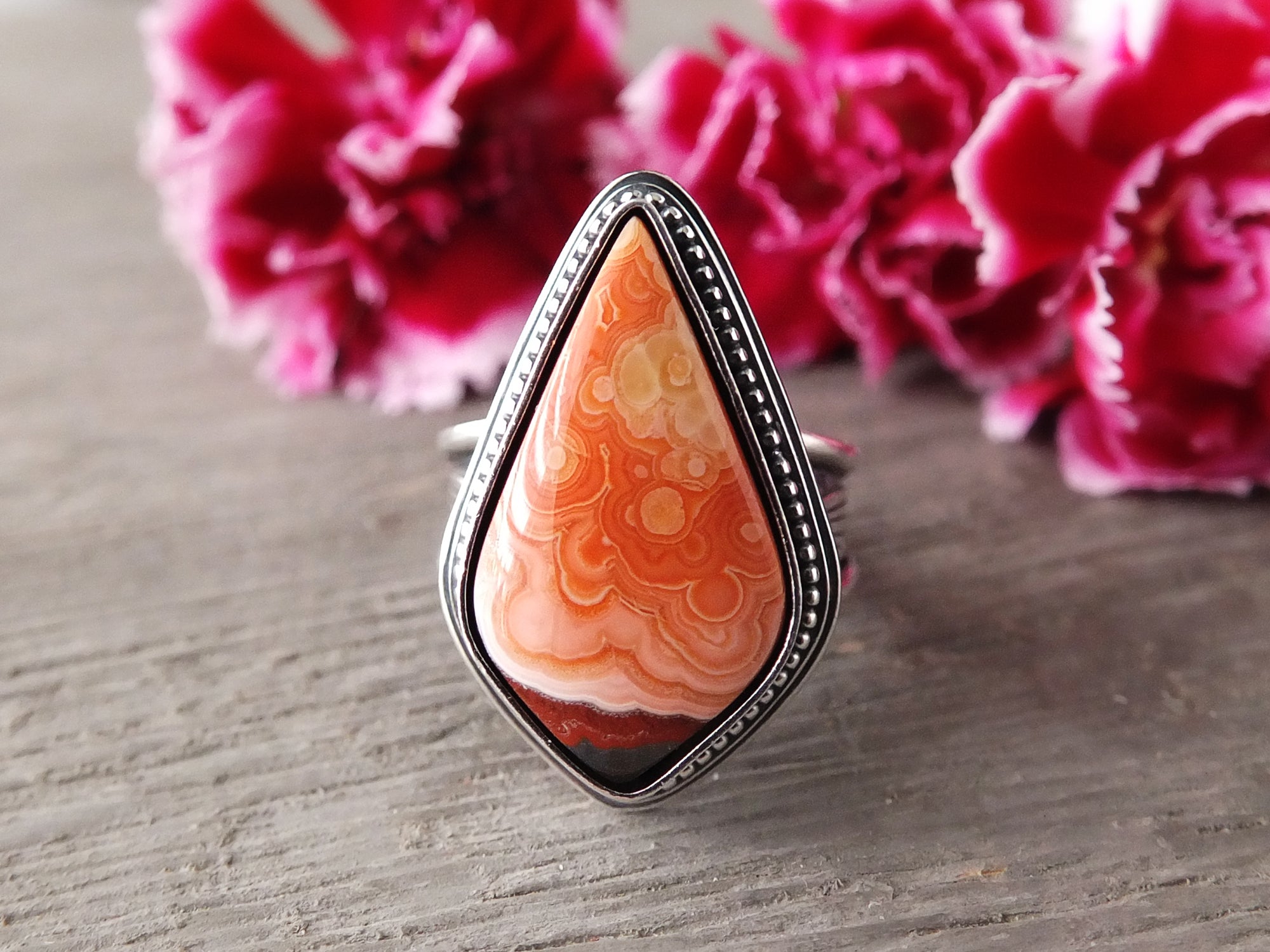 This artisan ring is available for custom sizing. The ring features a beautiful orby Laguna Lace agate cabochon. The ring photographed is a mock-up of the final design. The stone is currently floating in the setting. When finished and properly set, the ring will have a much cleaner look. Additionally, the band design can be modified to your preference.