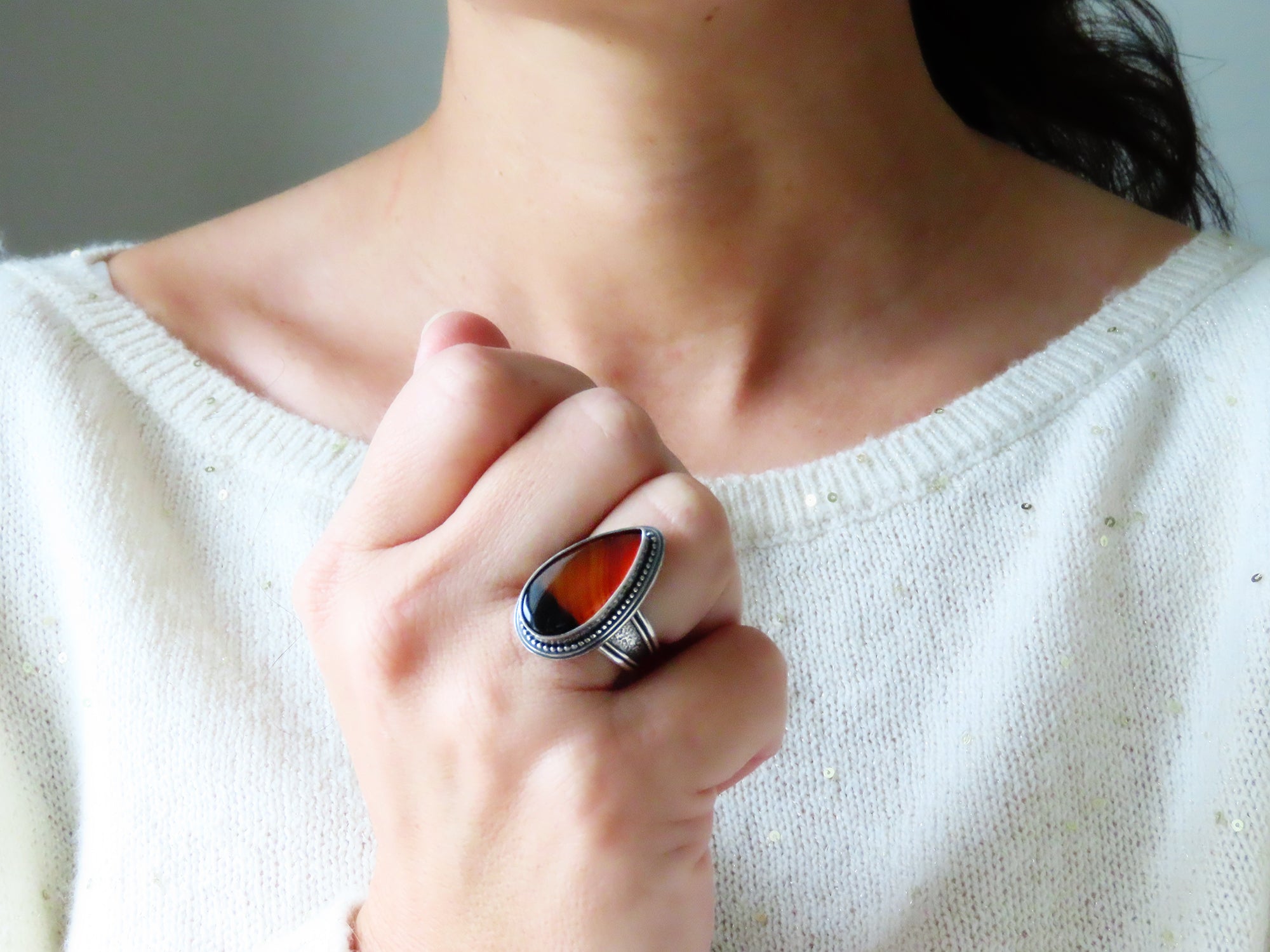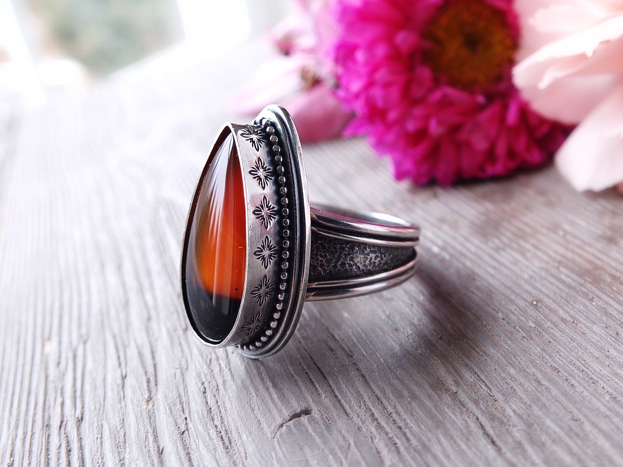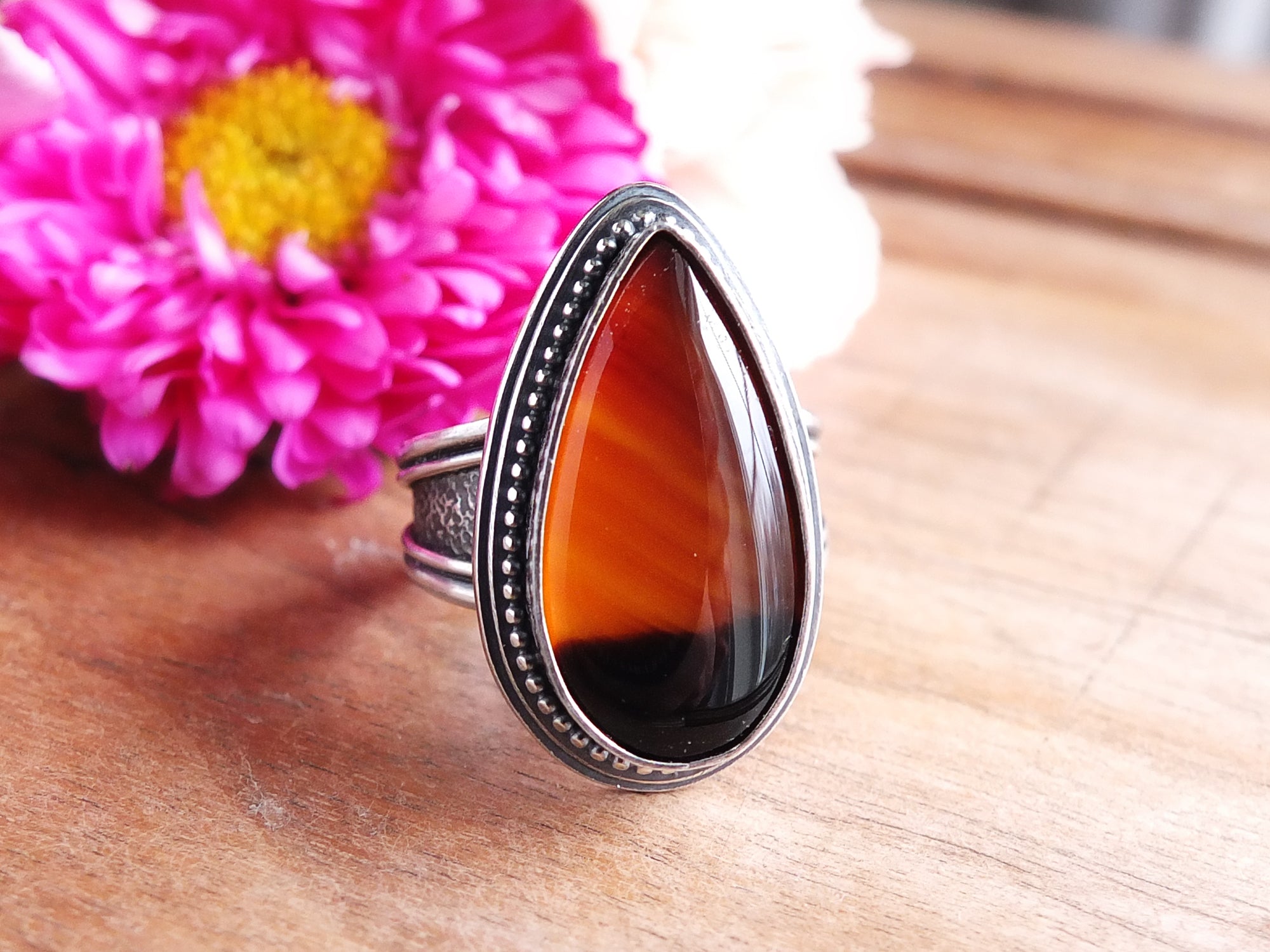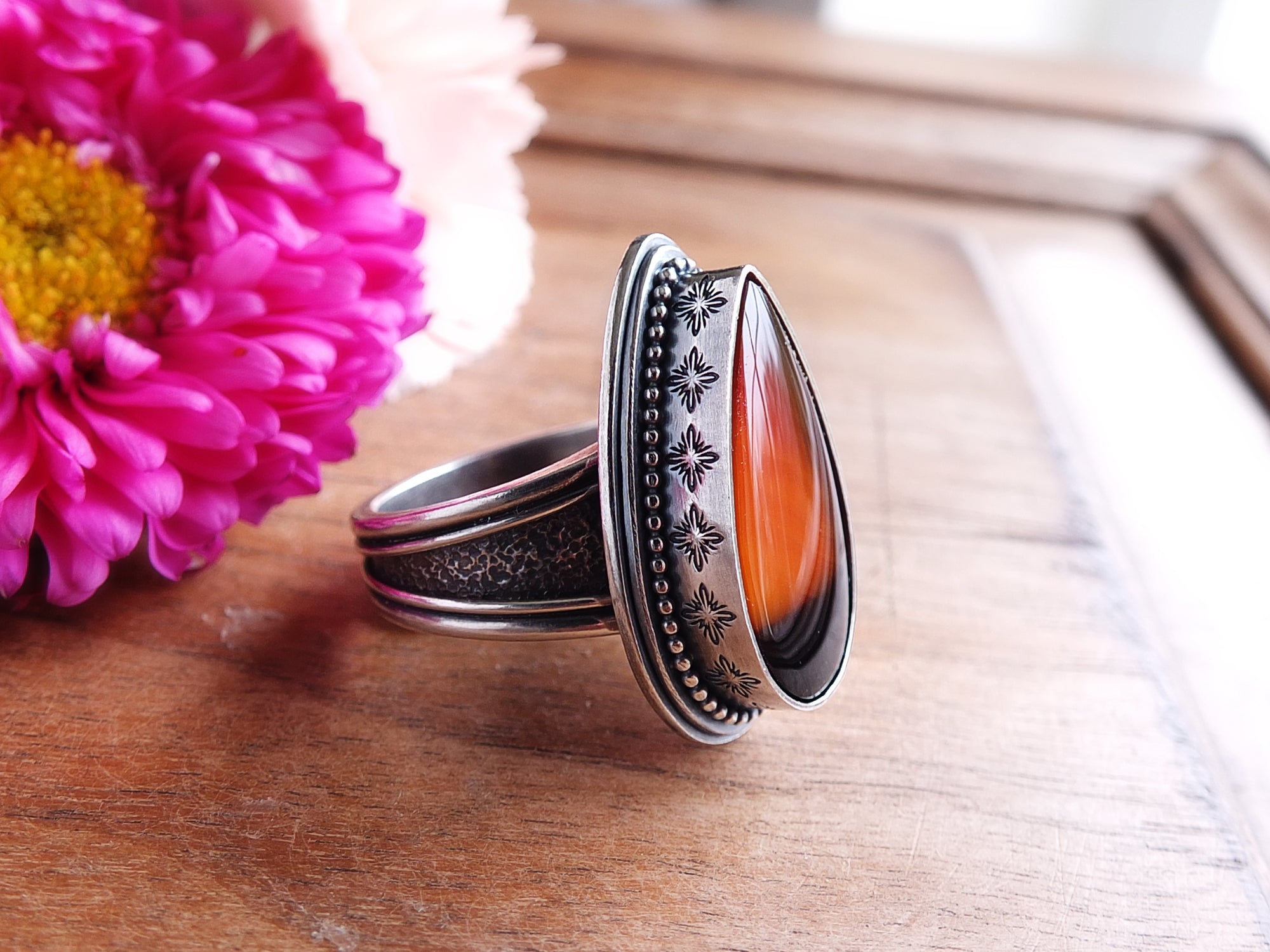 This artisan ring is available for custom sizing. The ring features a gorgeous and glowing Montana agate cabochon. The ring photographed is a mock-up of the final design. The stone is currently floating in the setting. When finished and properly set, the ring will have a much cleaner look. Additionally, the band design can be modified to your preference.