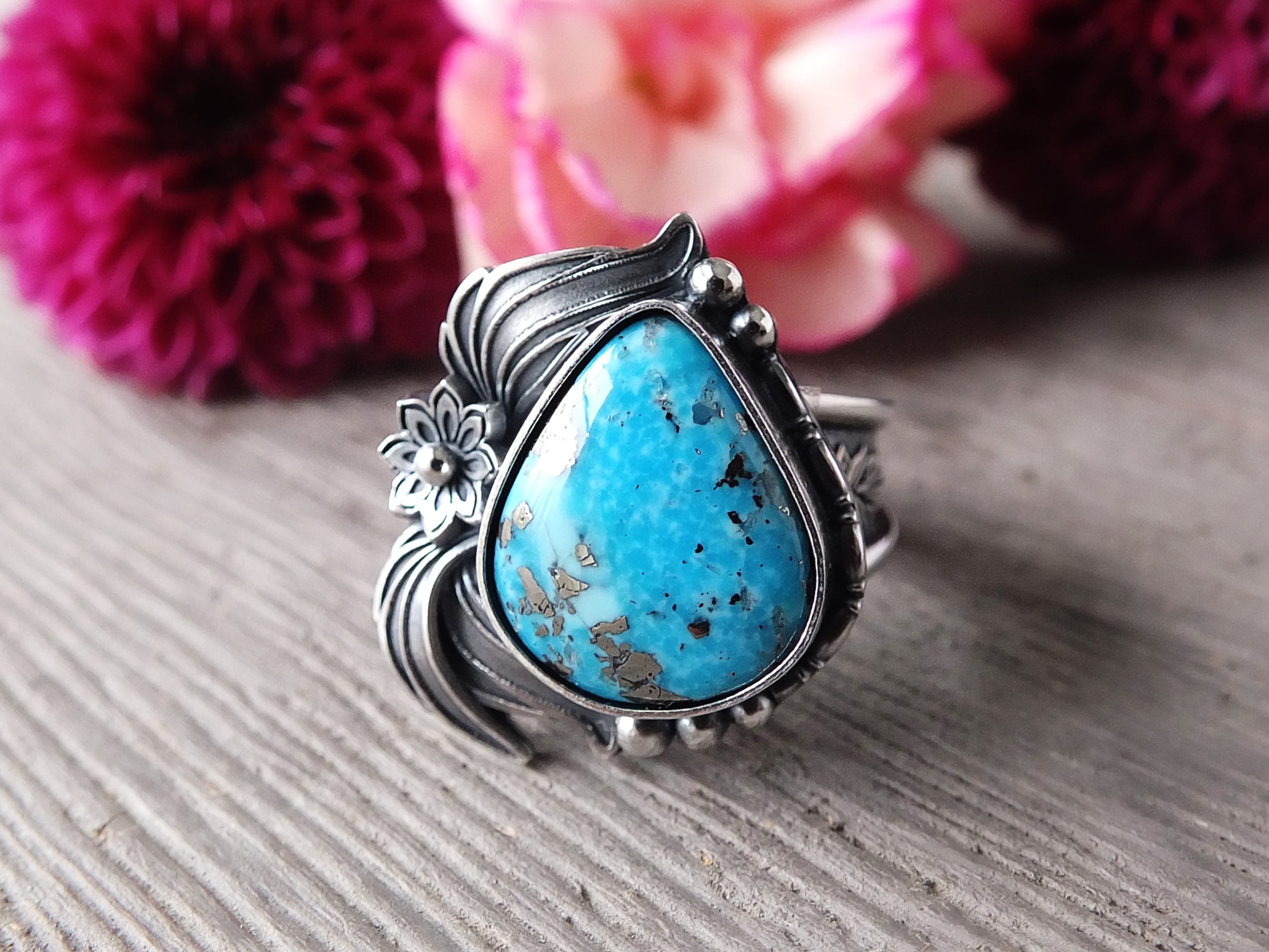 This design features a moderately sized stone previously mentioned nestled in an embellished setting of sterling silver. The band shown is a tapered style band with a minimum width of 6 mm. Overall, the setting and band have been lightly oxidized and polished to a gorgeous shine.