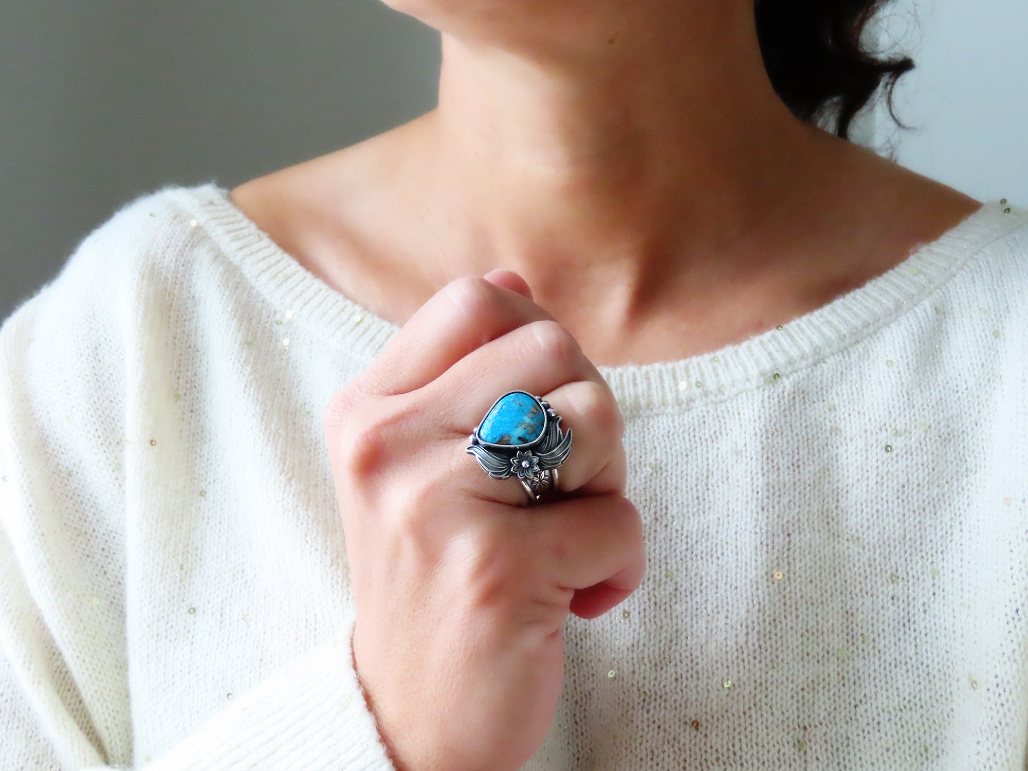 This artisan ring is available for custom sizing. The ring features a beautiful blue Persian Turquoise with Pyrite cabochon. The ring photographed is a mock-up of the final design. The stone is currently floating in the setting. When finished and properly set, the ring will have a much cleaner look. Additionally, the band design can be modified to your preference.