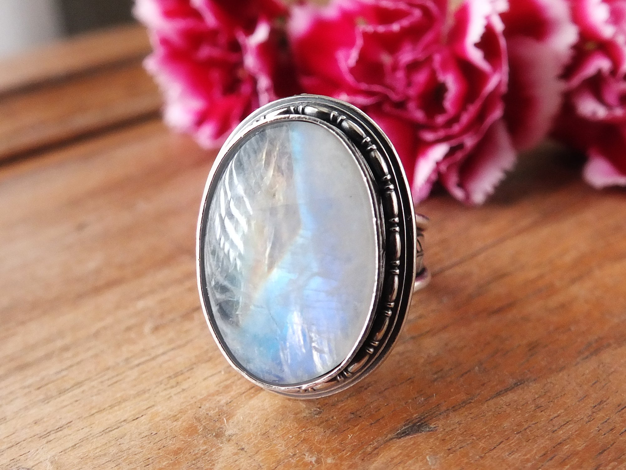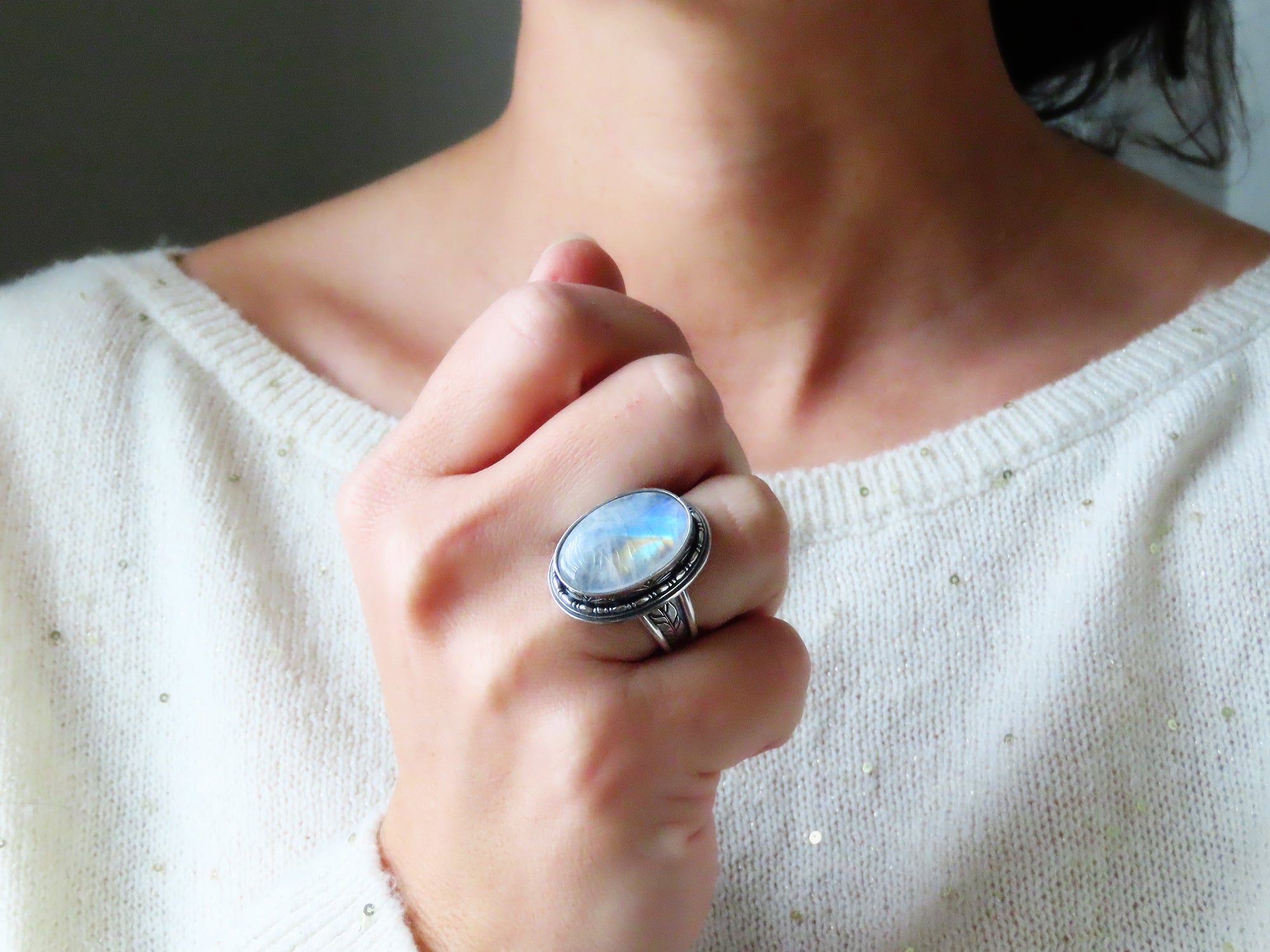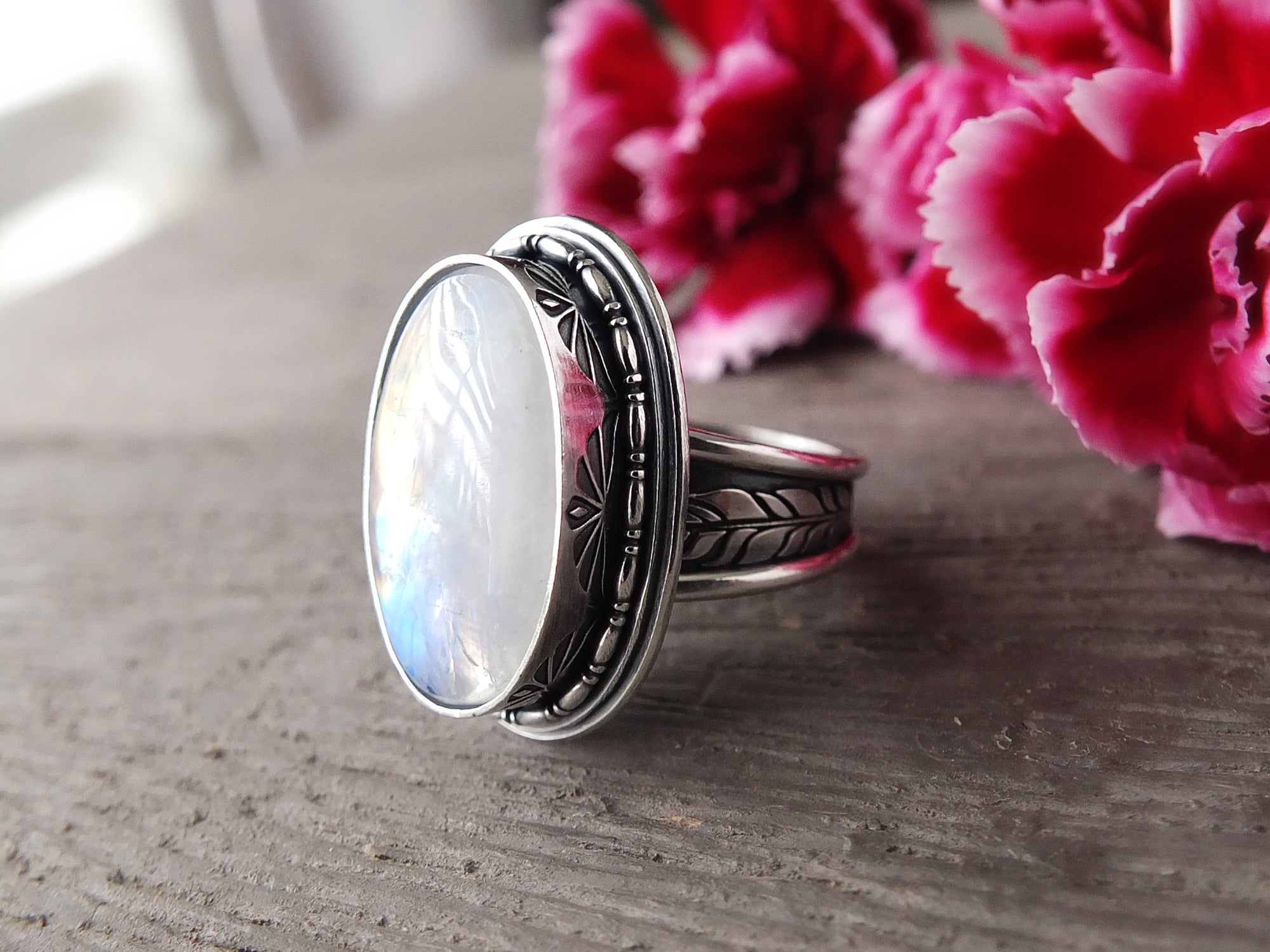 This artisan ring is available for custom sizing. The ring features a beautiful multicolored Rainbow Moonstone cabochon. The ring photographed is a mock-up of the final design. The stone is currently floating in the setting. When finished and properly set, the ring will have a much cleaner look. Additionally, the band design can be modified to your preference.