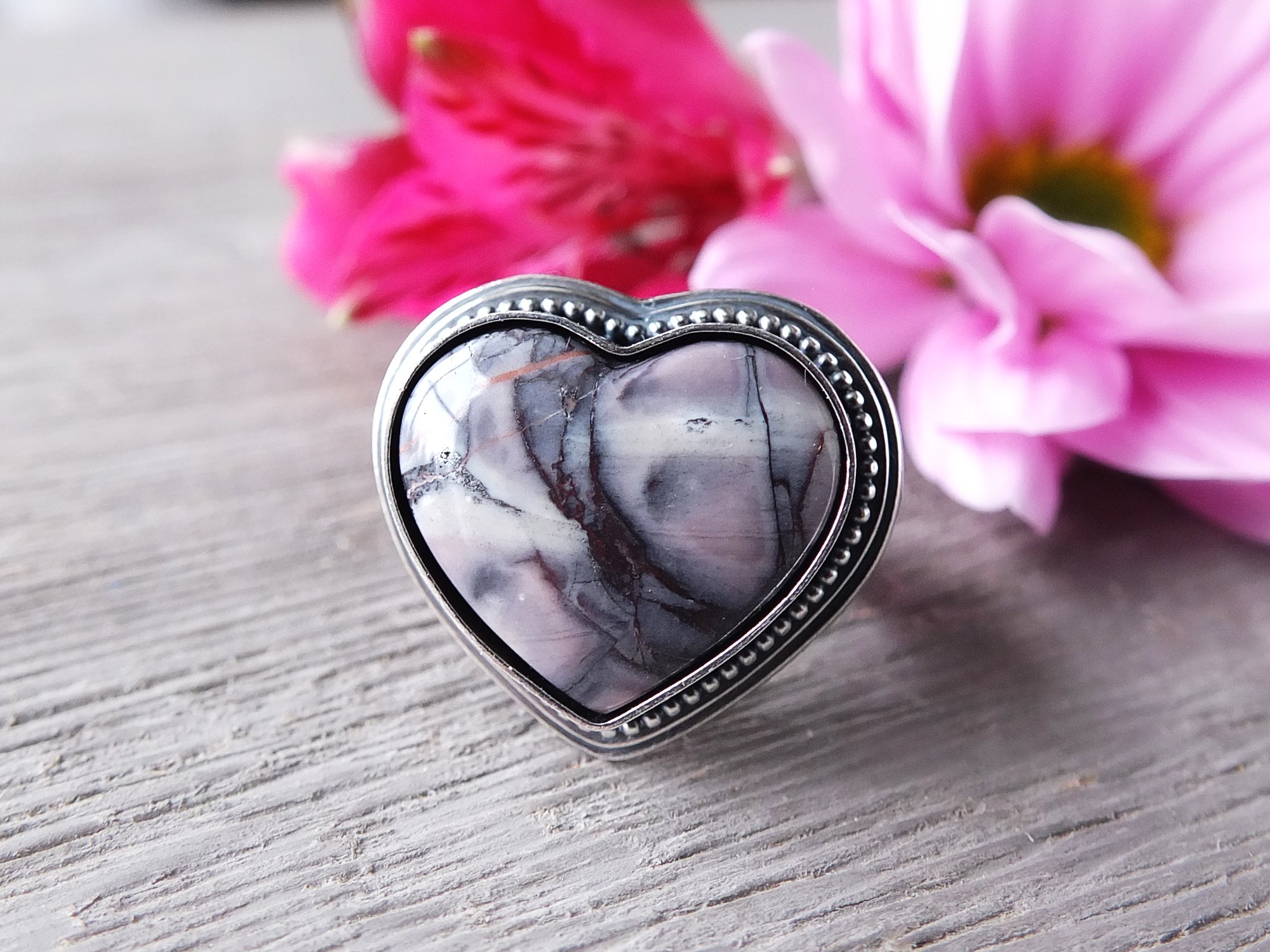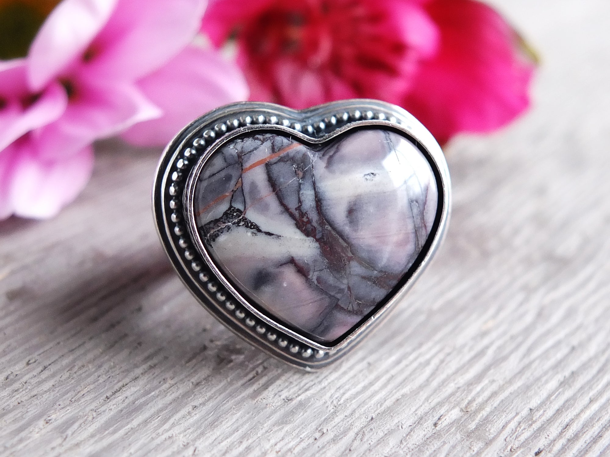 This artisan ring is available for custom sizing. The ring features a gorgeous Sci-fi/Exotica jasper cabochon. The ring photographed is a mock-up of the final design. The stone is currently floating in the setting. When finished and properly set, the ring will have a much cleaner look. Additionally, the band design can be modified to your preference.