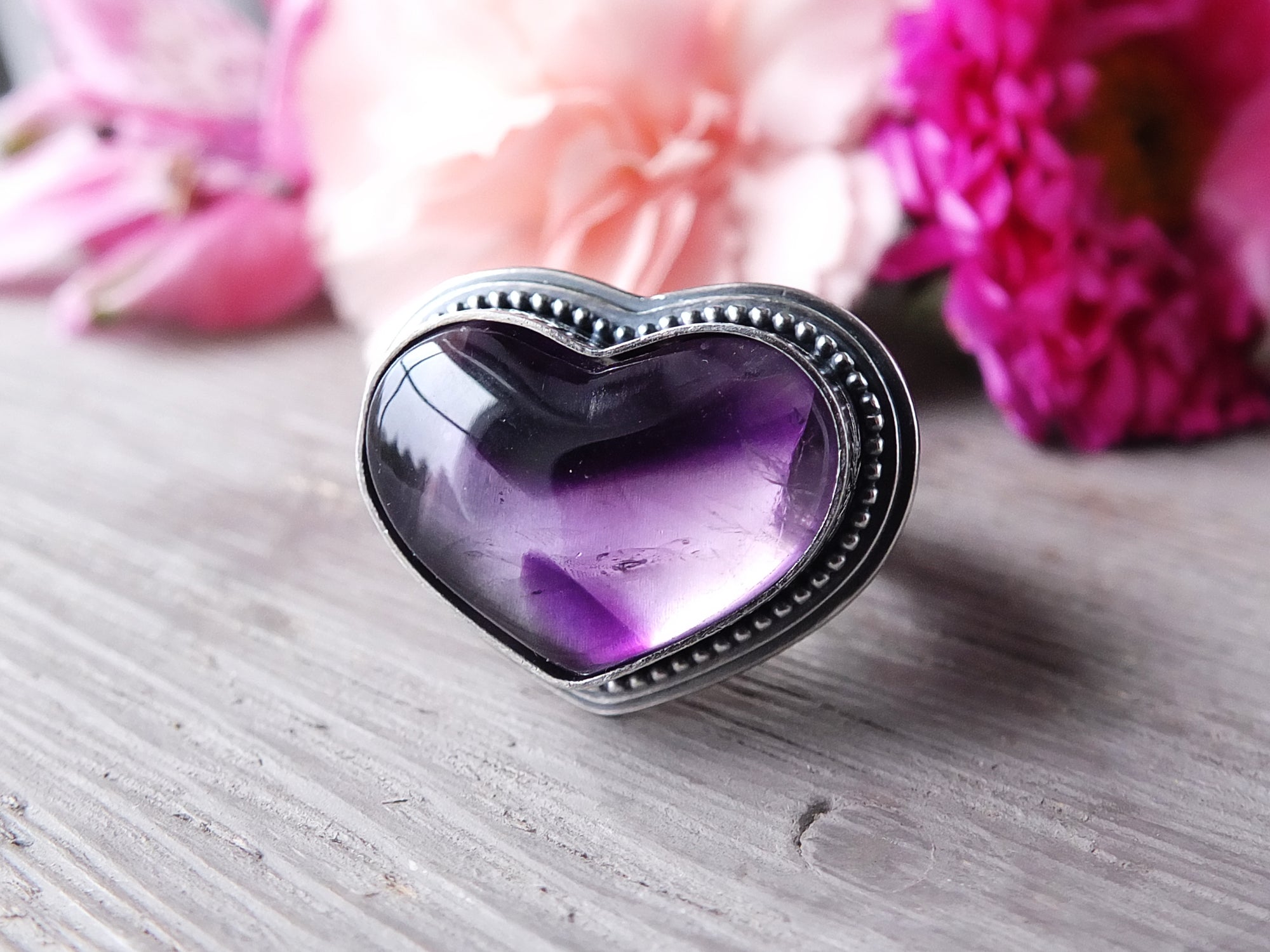 This artisan ring is available for custom sizing. The ring features a pretty purple Trapiche Amethyst heart shaped cabochon. The ring photographed is a mock-up of the final design. The stone is currently floating in the setting. When finished and properly set, the ring will have a much cleaner look. Additionally, the band design can be modified to your preference.