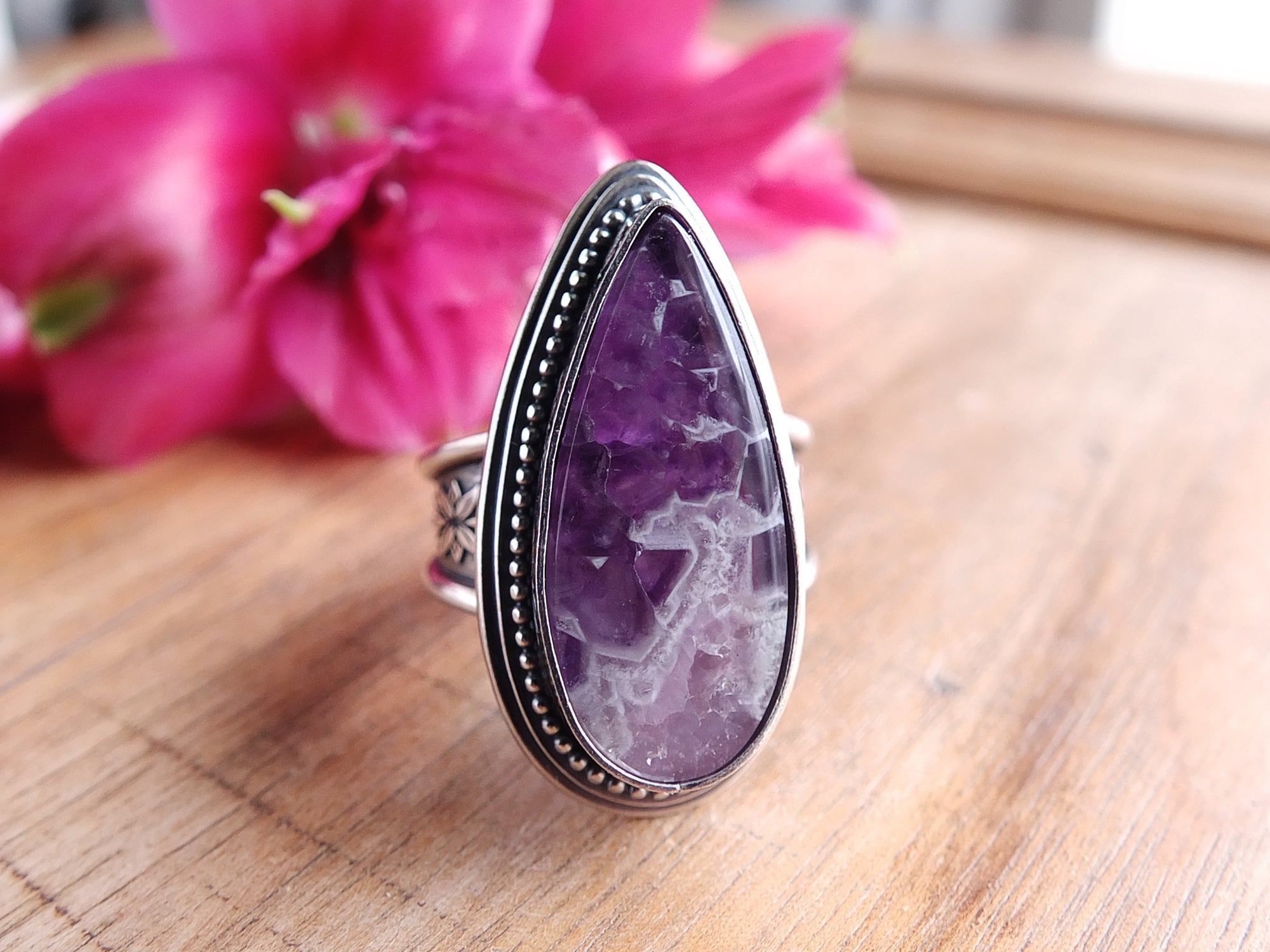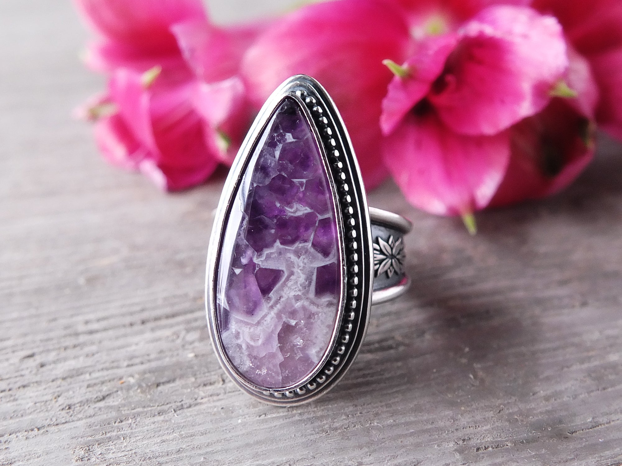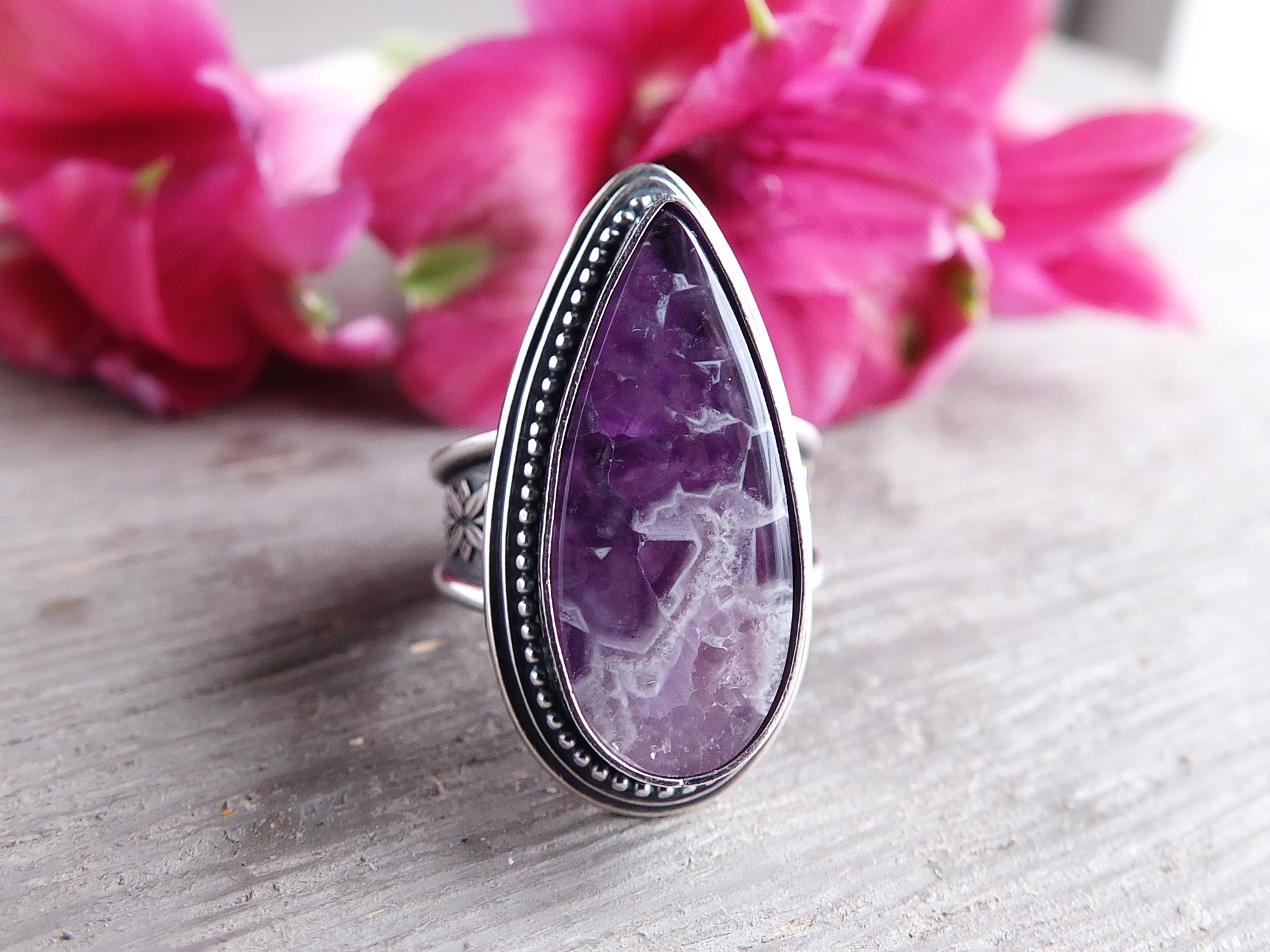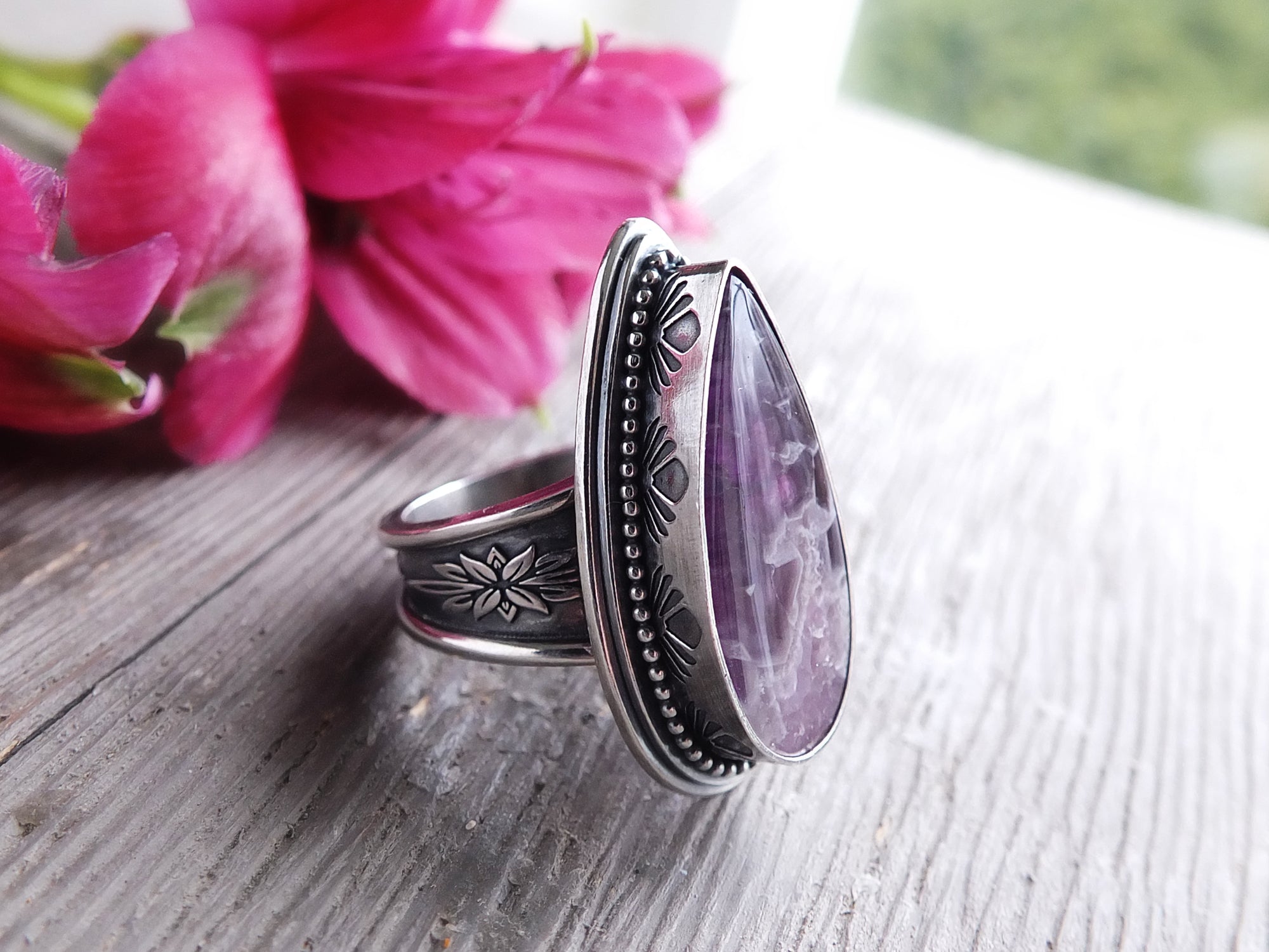 This artisan ring is available for custom sizing. The ring features a stunning purple Amethyst Lace agate cabochon. The ring photographed is a mock-up of the final design. The stone is currently floating in the setting. When finished and properly set, the ring will have a much cleaner look. Additionally, the band design can be modified to your preference.