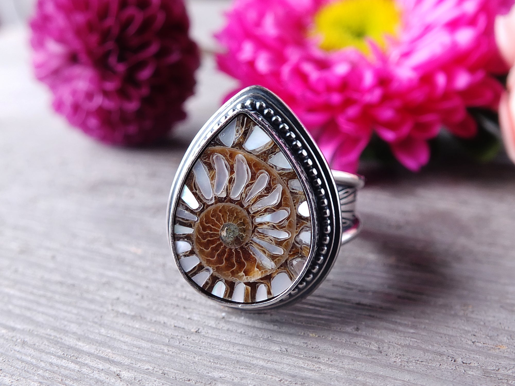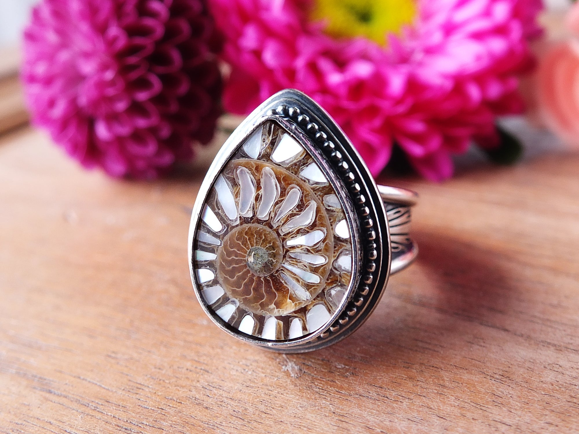 This artisan ring is available for custom sizing. The ring features a lovely Ammonite cabochon featuring Mother of Pearl inlay. The ring photographed is a mock-up of the final design. The stone is currently floating in the setting. When finished and properly set, the ring will have a much cleaner look. Additionally, the band design can be modified to your preference.