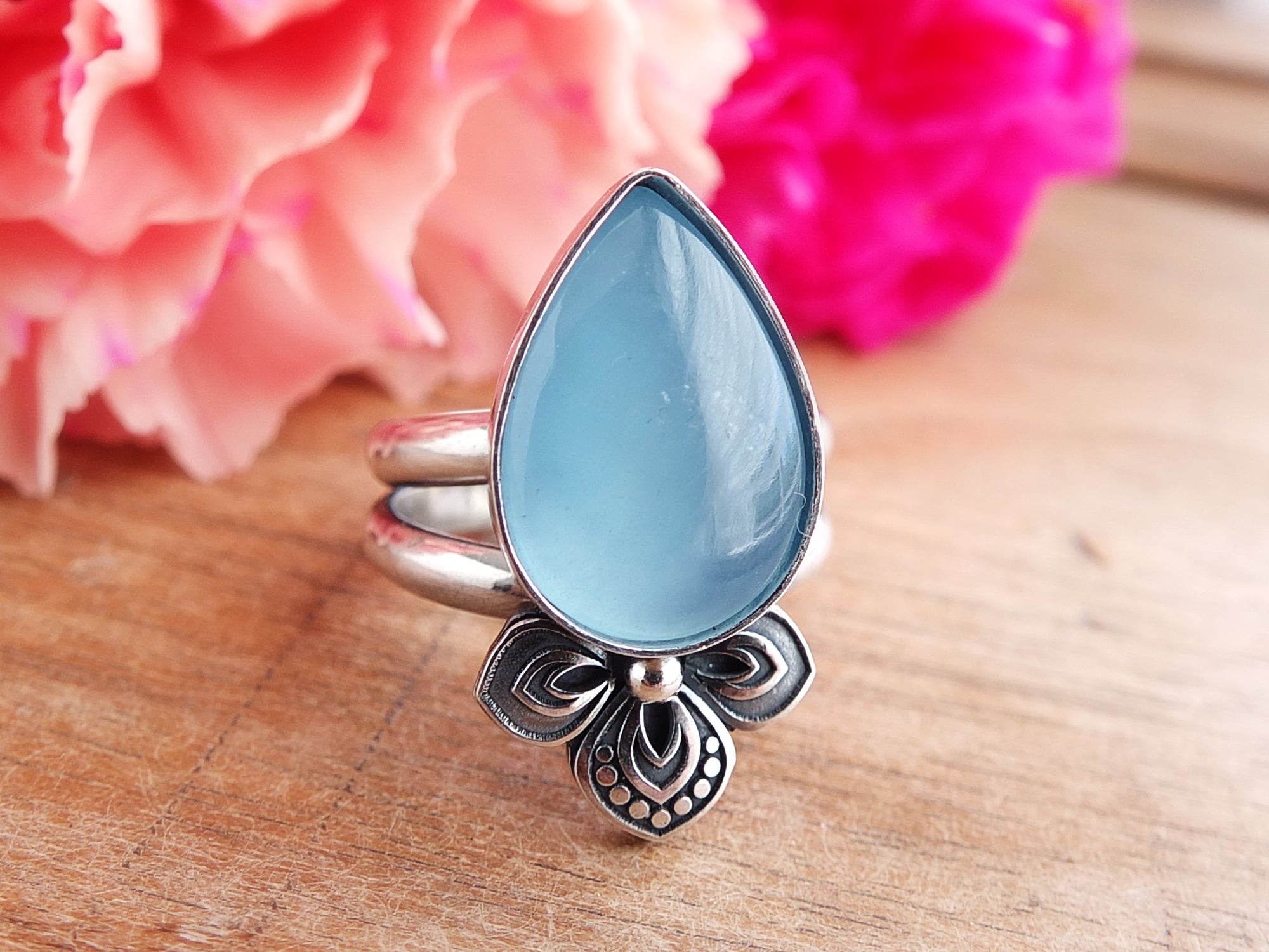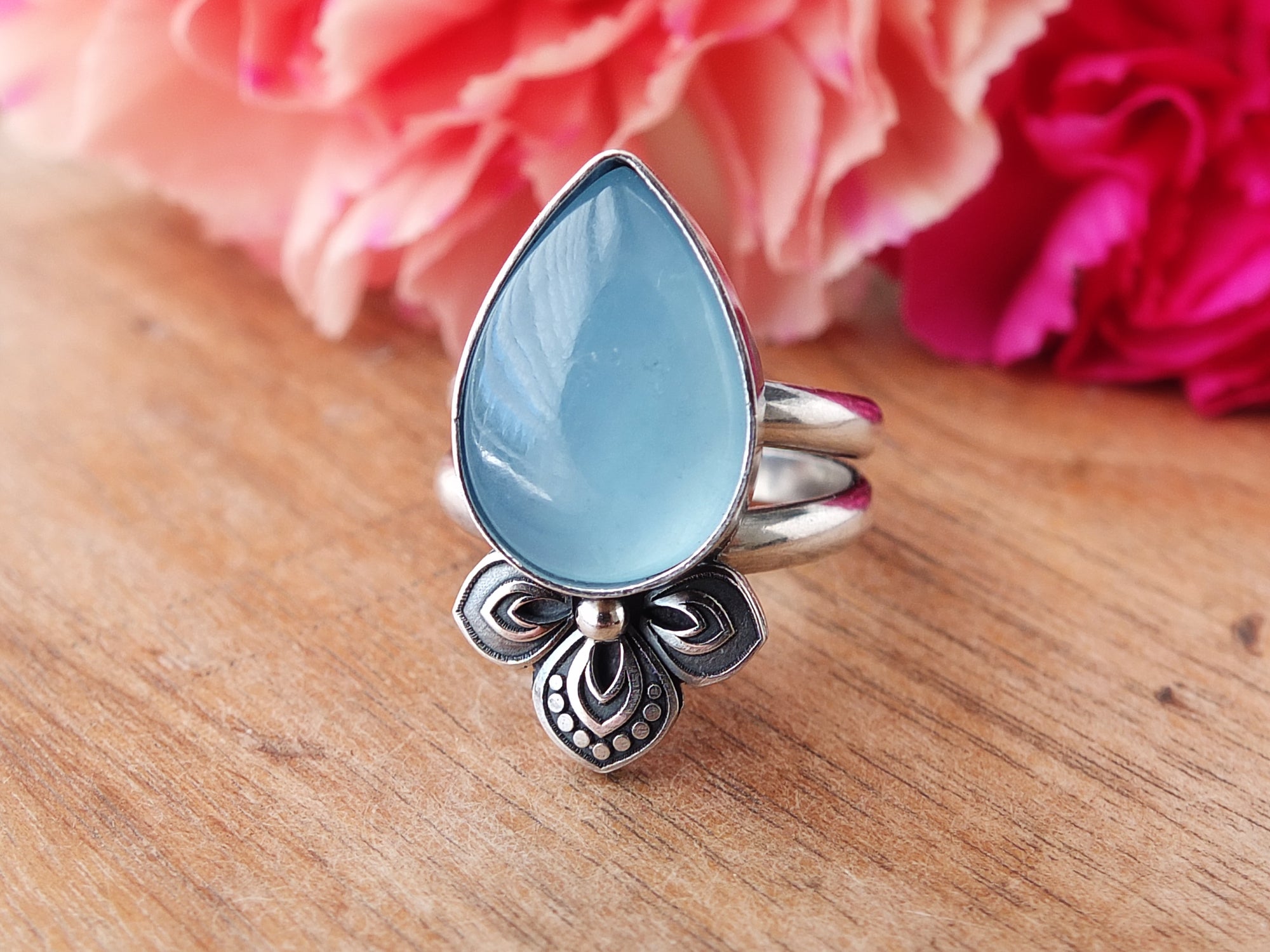 This artisan ring is available for custom sizing. The ring features a gorgeous blue Aquamarine cabochon. The ring photographed is a mock-up of the final design. The stone is currently floating in the setting. When finished and properly set, the ring will have a much cleaner look. Additionally, the band design can be modified to your preference.