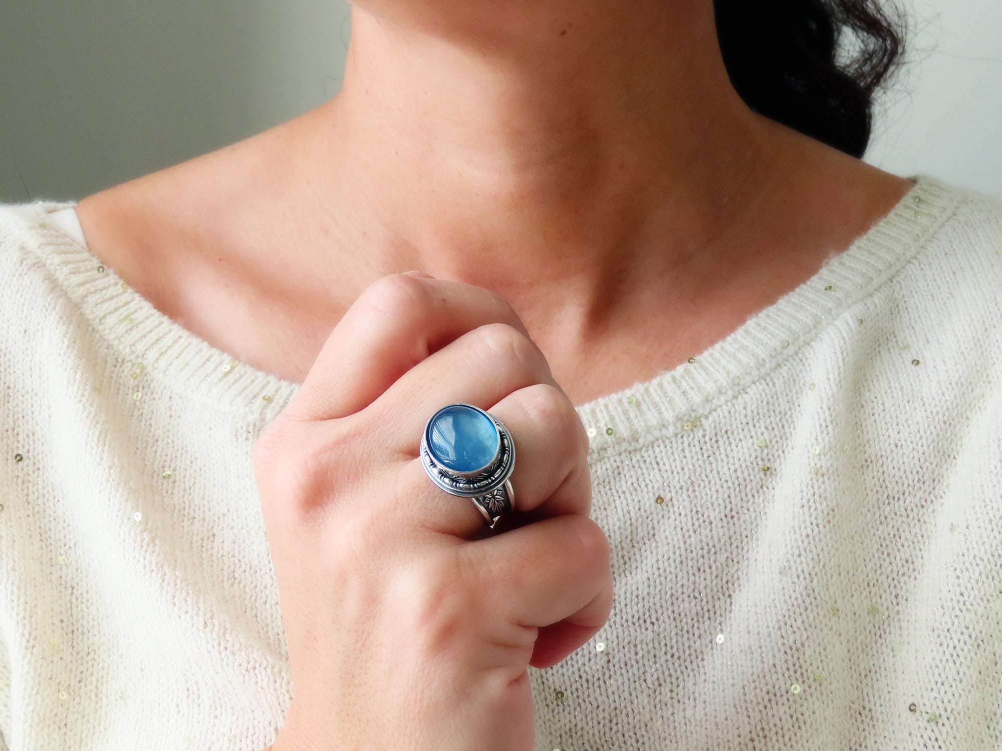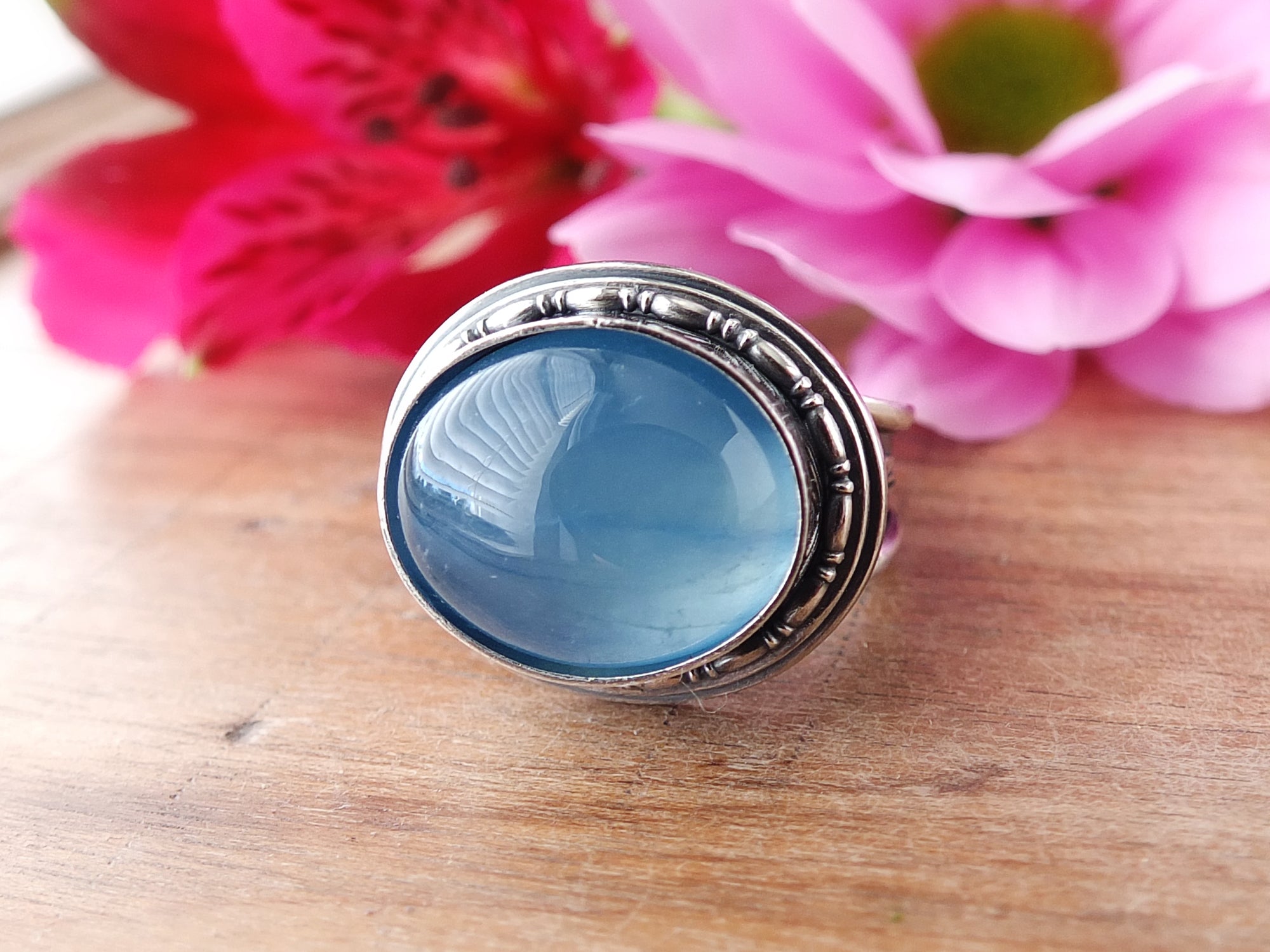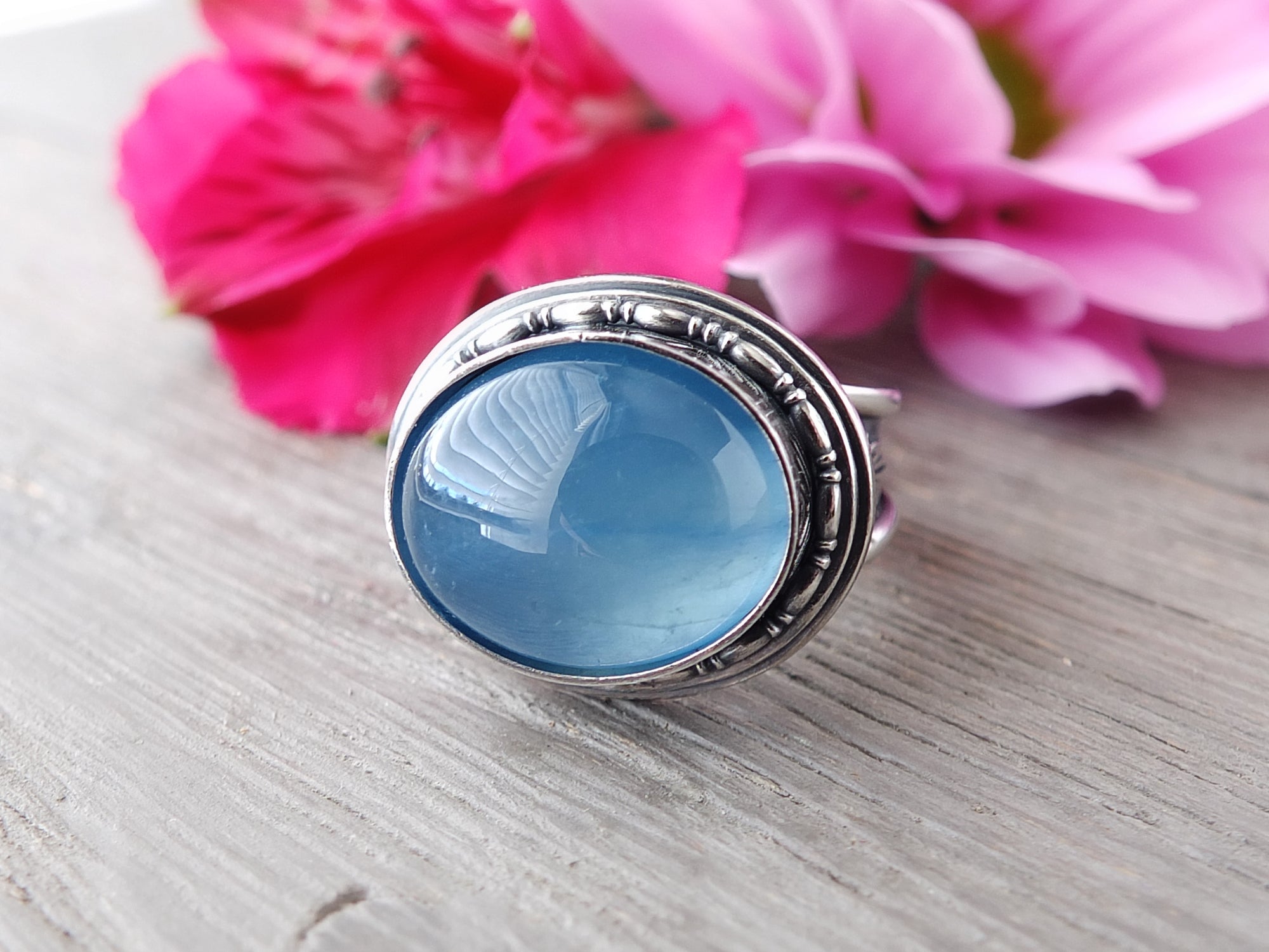 This artisan ring is available for custom sizing. The ring features a beautiful blue Aquamarine cabochon. The ring photographed is a mock-up of the final design. The stone is currently floating in the setting. When finished and properly set, the ring will have a much cleaner look. Additionally, the band design can be modified to your preference.