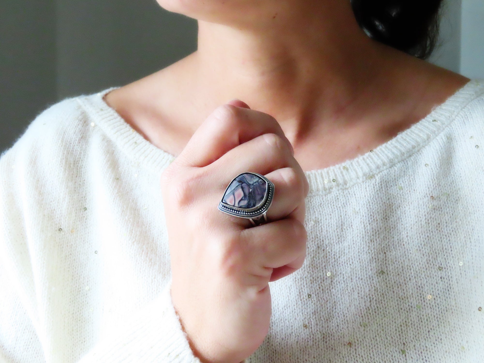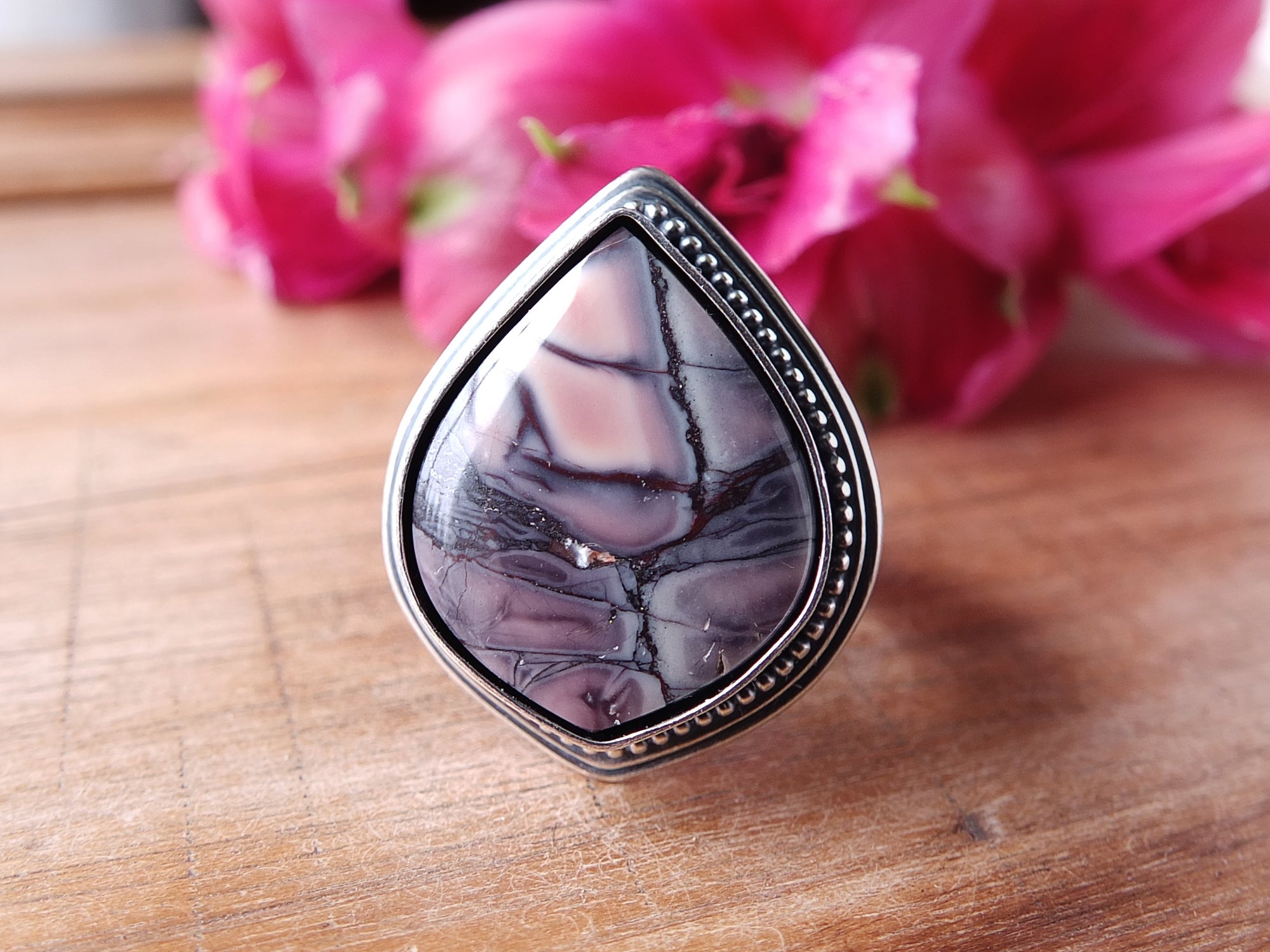 This design features a moderately sized stone previously mentioned nestled in an embellished setting of sterling silver. The band shown is a tapered style band with a minimum width of 6 mm. Overall, the setting and band have been lightly oxidized and polished to a gorgeous shine.