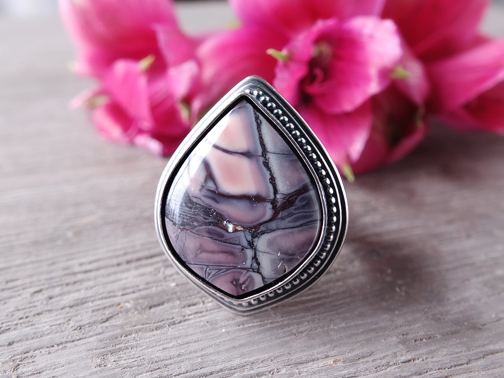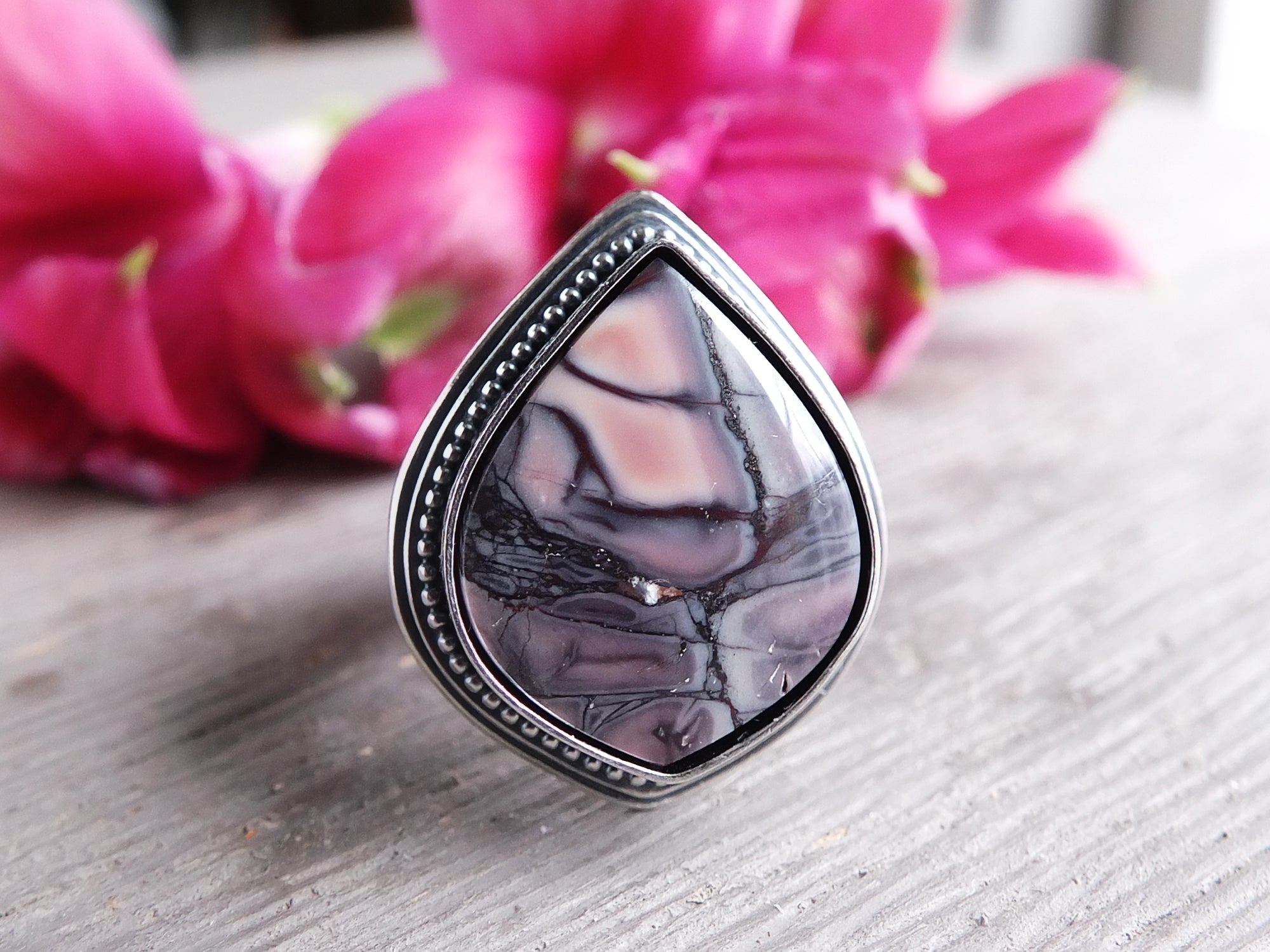 This artisan ring is available for custom sizing. The ring features a gorgeous Exotica/Sci-Fi jasper cabochon. The ring photographed is a mock-up of the final design. The stone is currently floating in the setting. When finished and properly set, the ring will have a much cleaner look. Additionally, the band design can be modified to your preference.