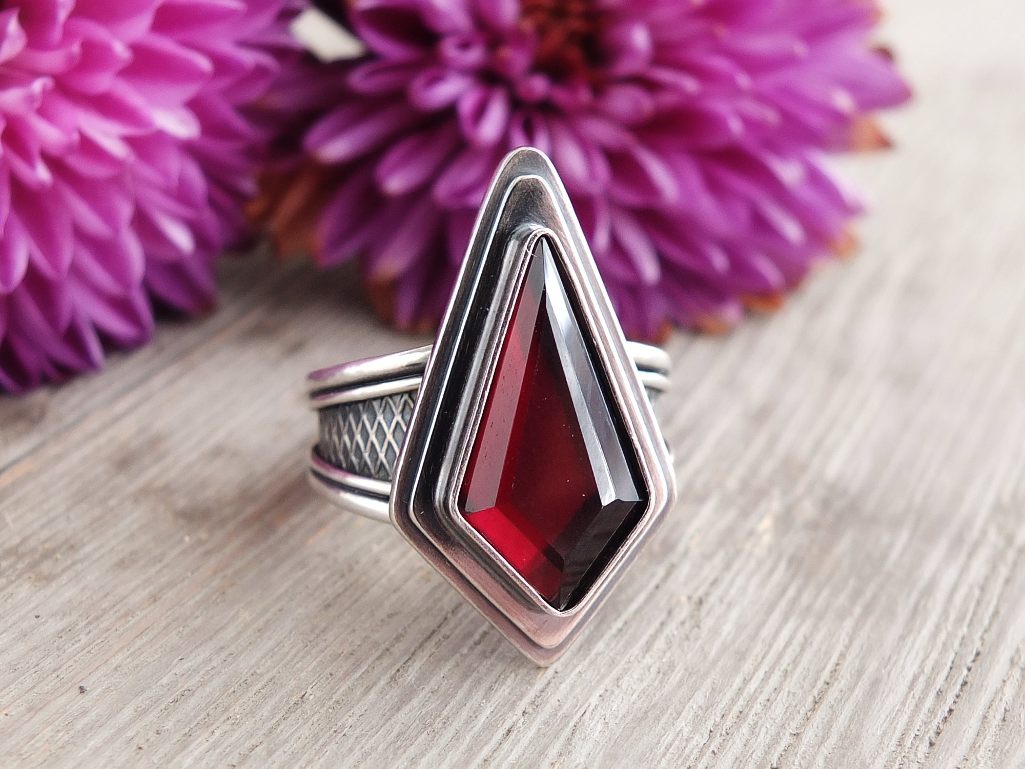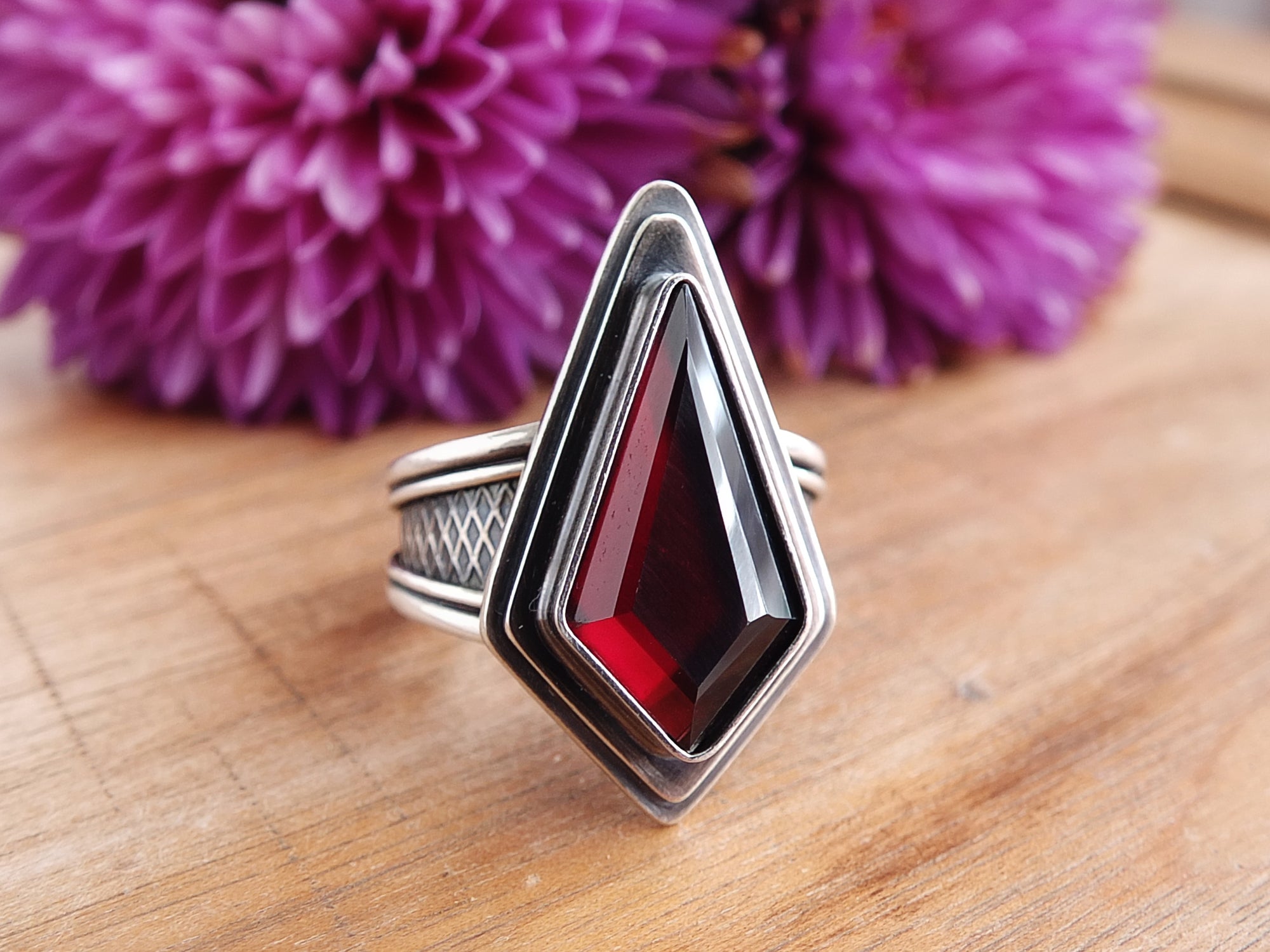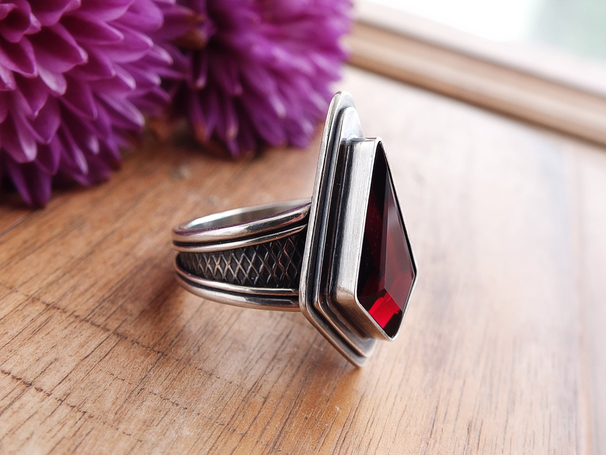 This artisan ring is available for custom sizing. The ring features a luscious red Garnet cabochon. The ring photographed is a mock-up of the final design. The stone is currently floating in the setting. When finished and properly set, the ring will have a much cleaner look. Additionally, the band design can be modified to your preference.