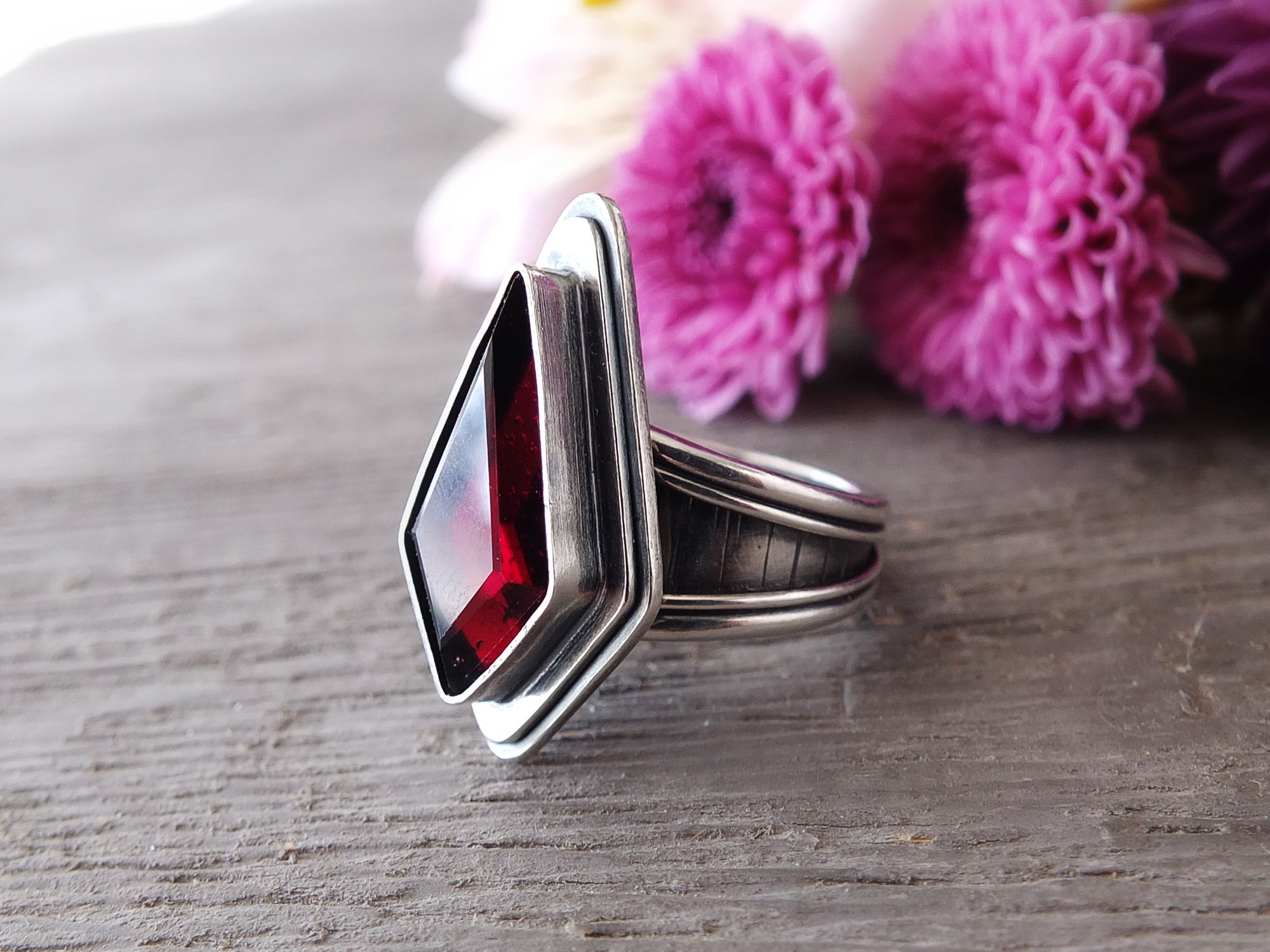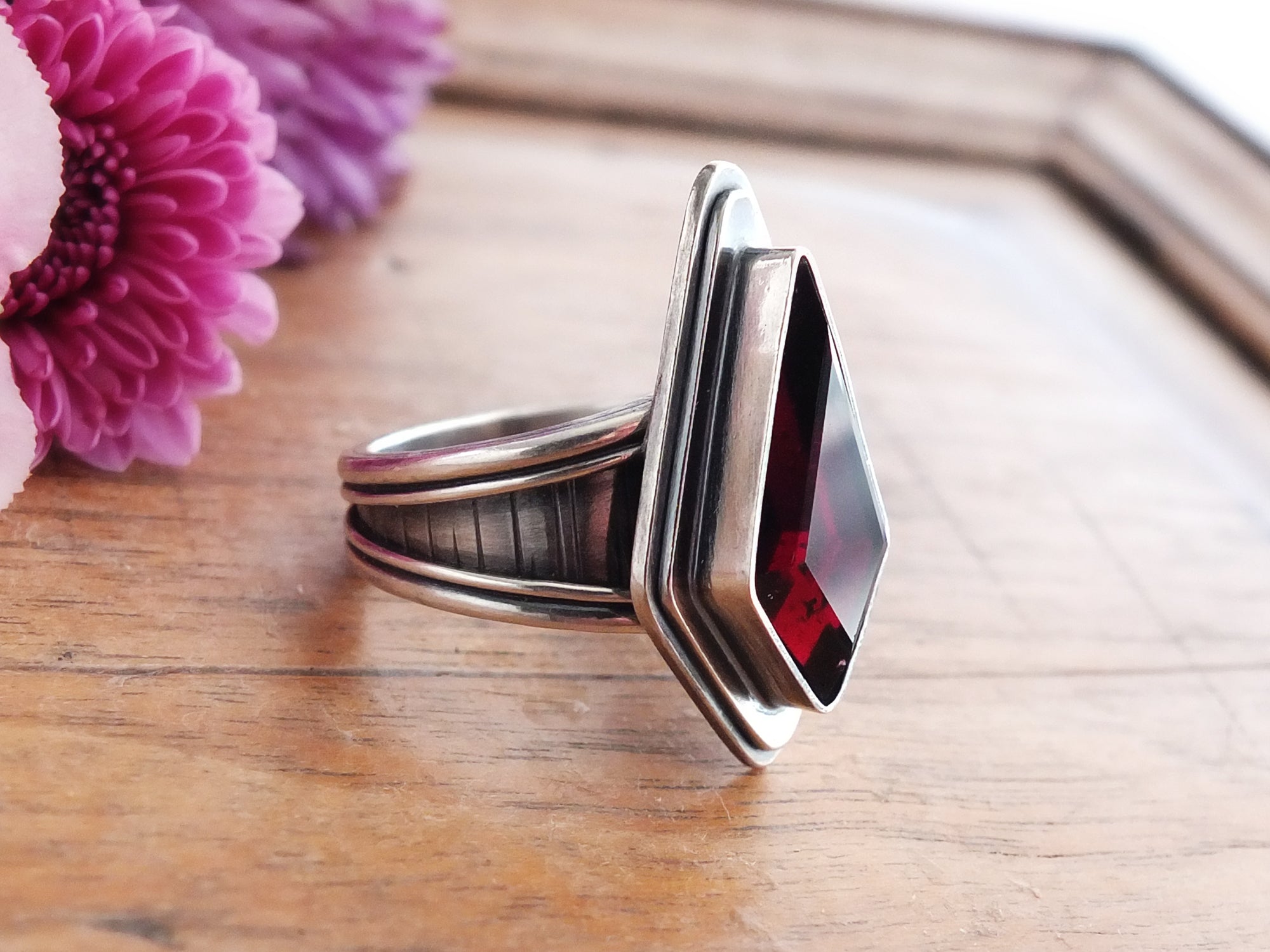 This artisan ring is available for custom sizing. The ring features a luscious red Garnet cabochon. The ring photographed is a mock-up of the final design. The stone is currently floating in the setting. When finished and properly set, the ring will have a much cleaner look. Additionally, the band design can be modified to your preference.