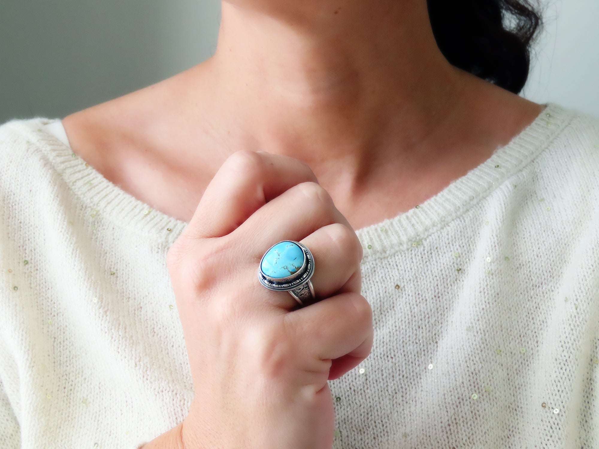 This artisan ring is available for custom sizing. The ring features a lovely blue Golden Hills Turquoise cabochon. The ring photographed is a mock-up of the final design. The stone is currently floating in the setting. When finished and properly set, the ring will have a much cleaner look. Additionally, the band design can be modified to your preference.