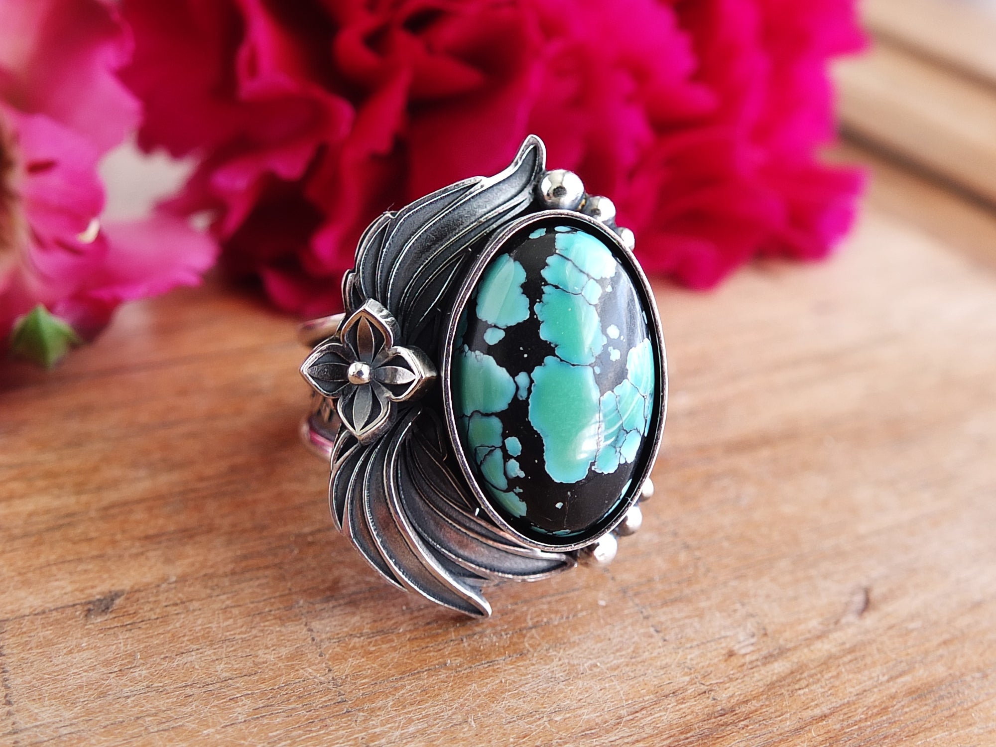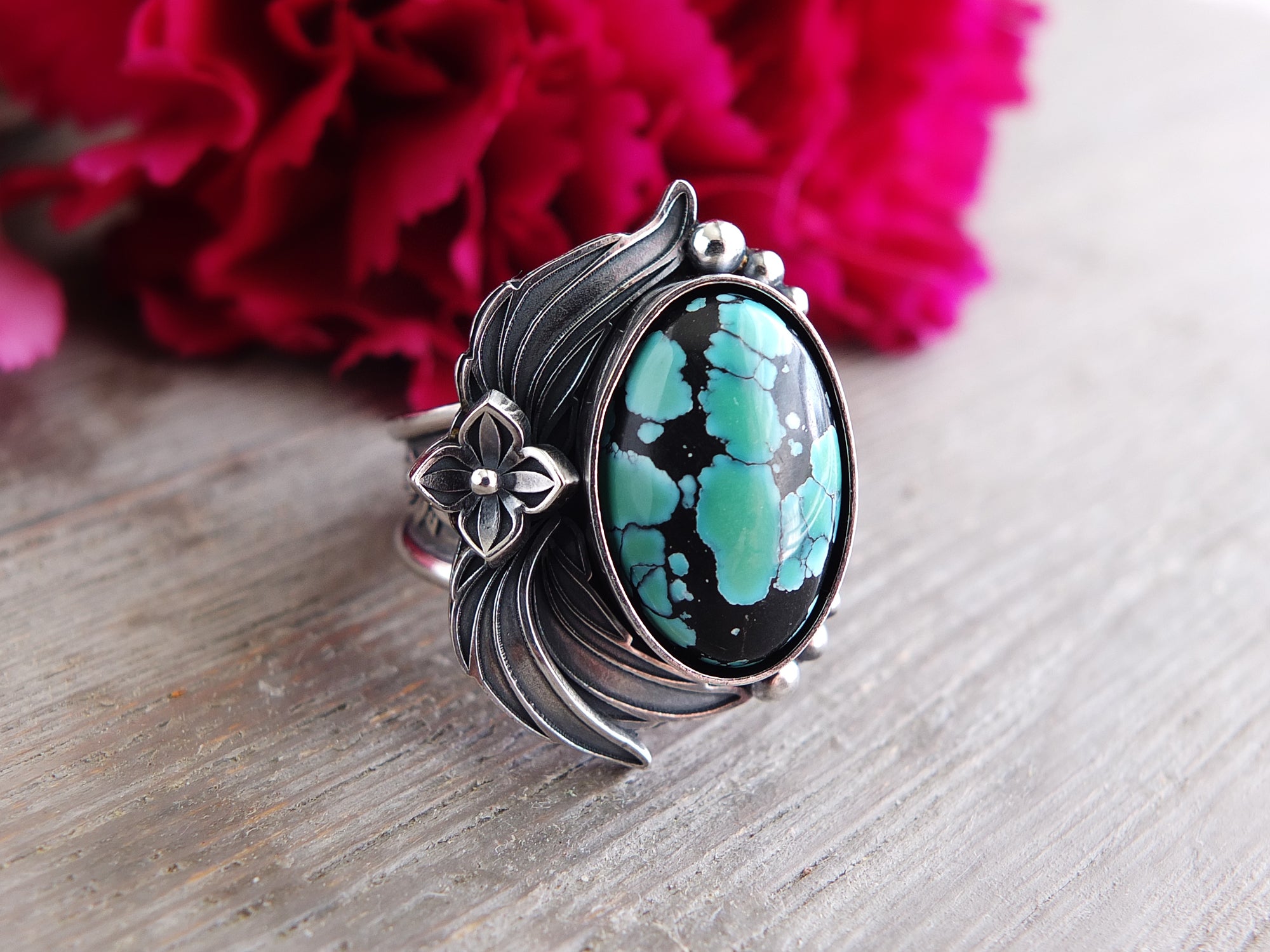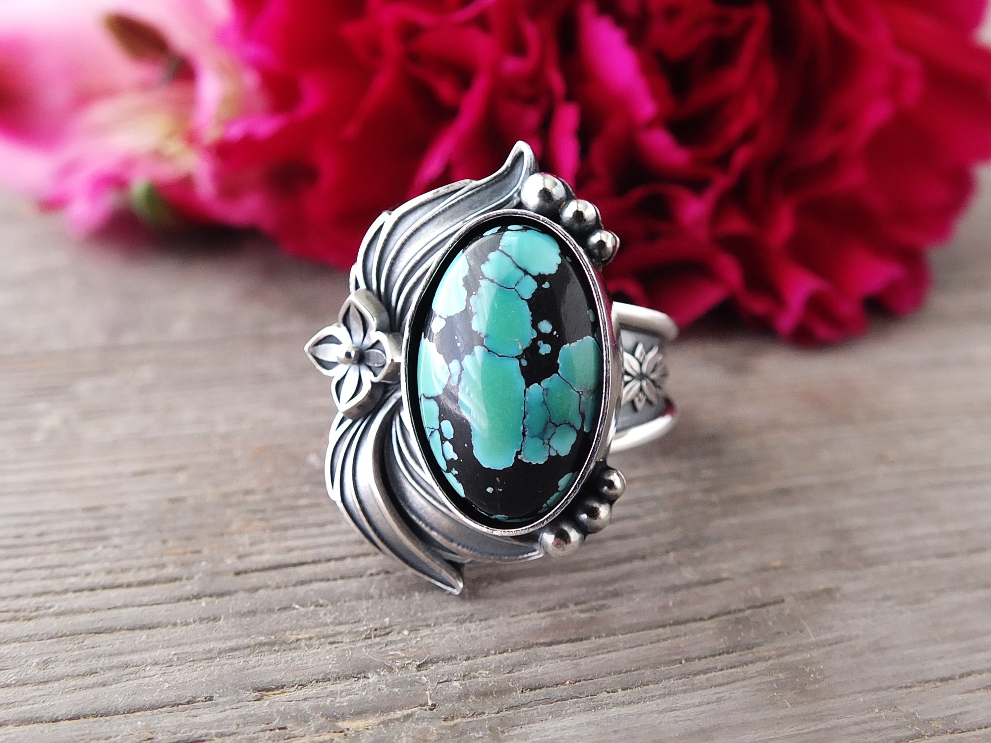 This design features a moderately sized stone previously mentioned nestled in an embellished setting of sterling silver. The band shown is a tapered style band with a minimum width of 6 mm. Overall, the setting and band have been lightly oxidized and polished to a gorgeous shine.