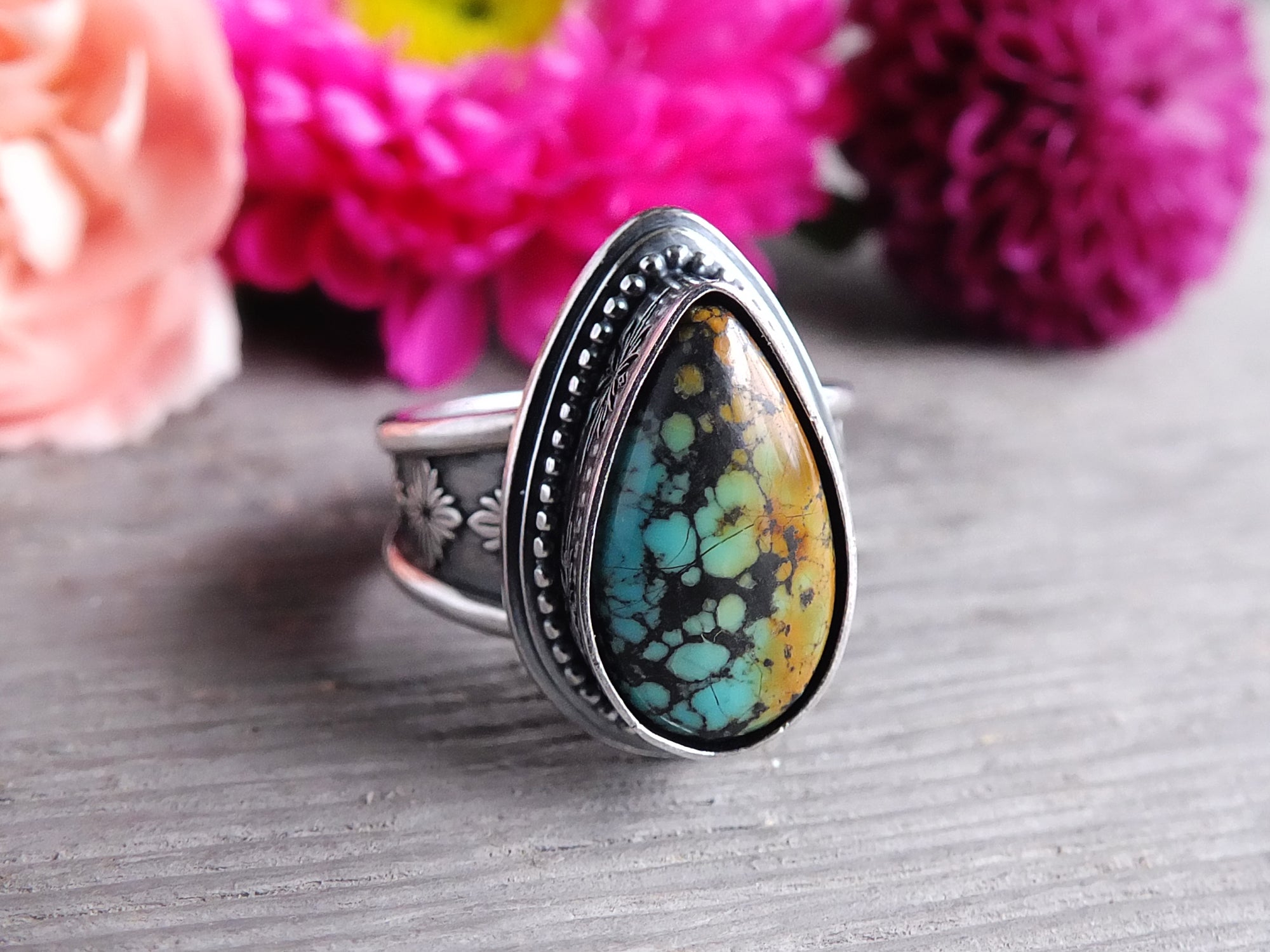 This artisan ring is available for custom sizing. The ring features a beautiful polychrome Hubei turquoise cabochon. The ring photographed is a mock-up of the final design. The stone is currently floating in the setting. When finished and properly set, the ring will have a much cleaner look. Additionally, the band design can be modified to your preference.