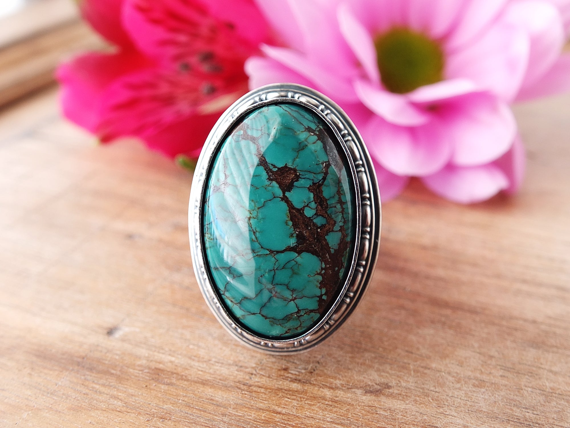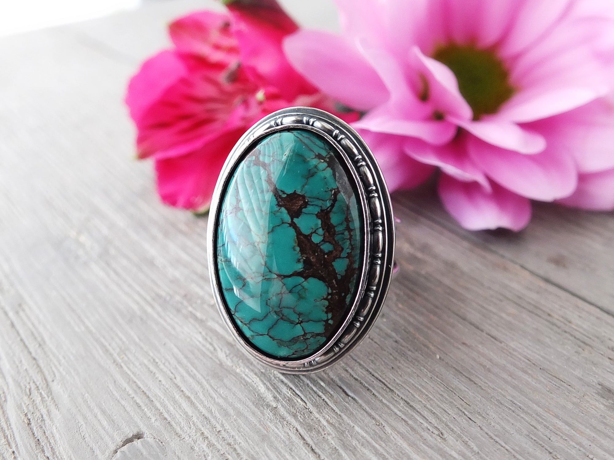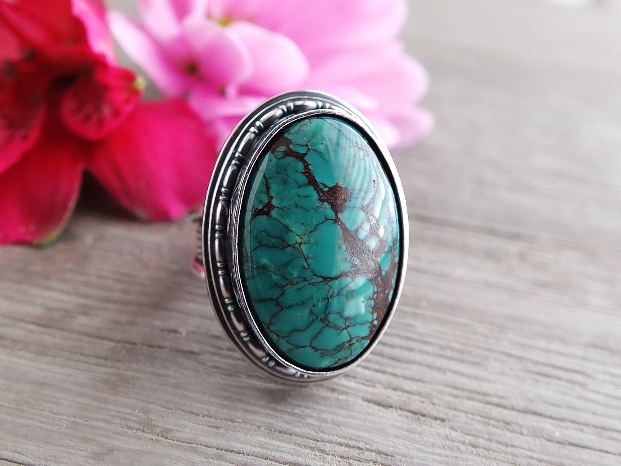 This artisan ring is available for custom sizing. The ring features a large gorgeous green Hubei Turquoise cabochon. The ring photographed is a mock-up of the final design. The stone is currently floating in the setting. When finished and properly set, the ring will have a much cleaner look. Additionally, the band design can be modified to your preference.