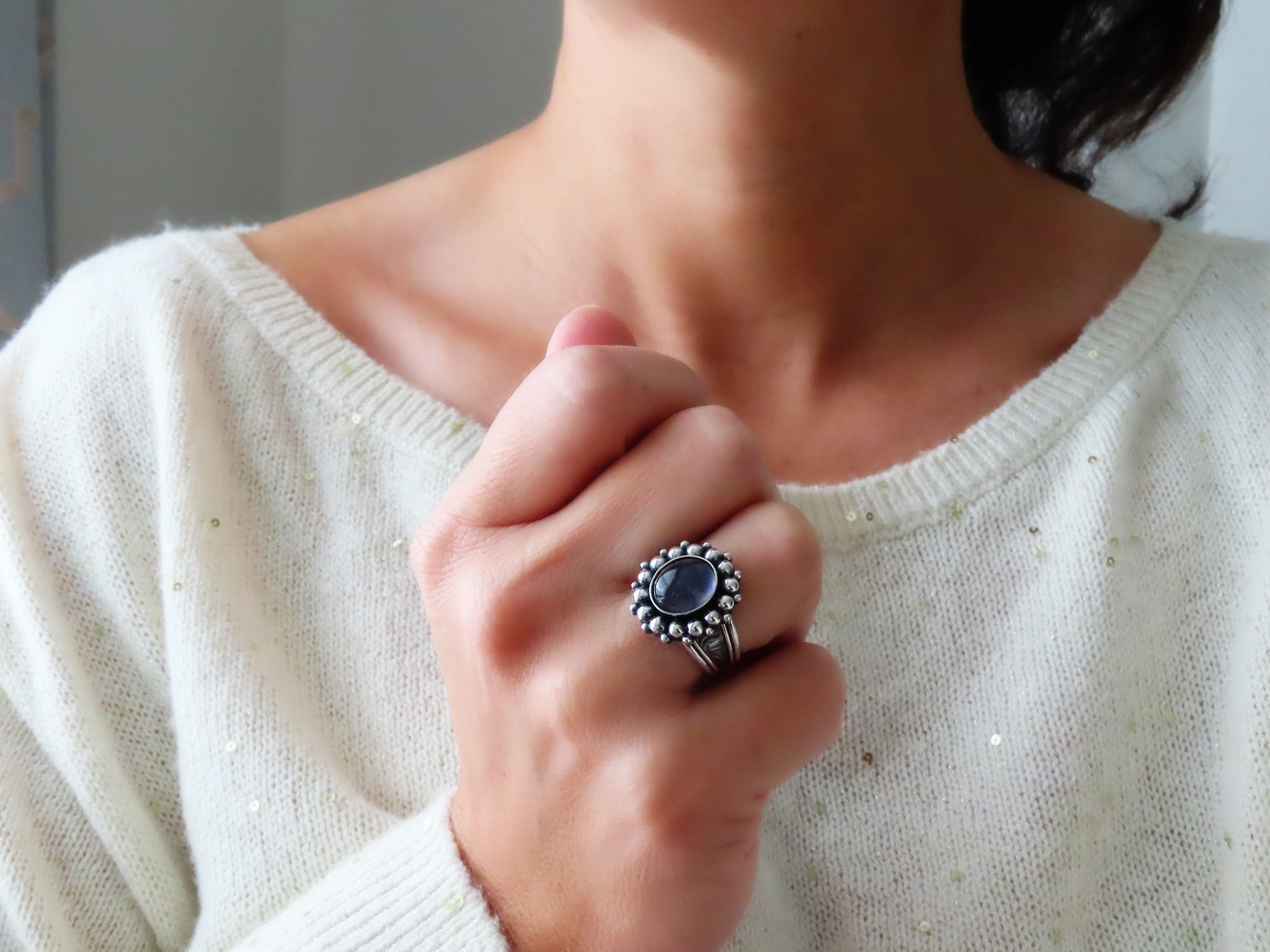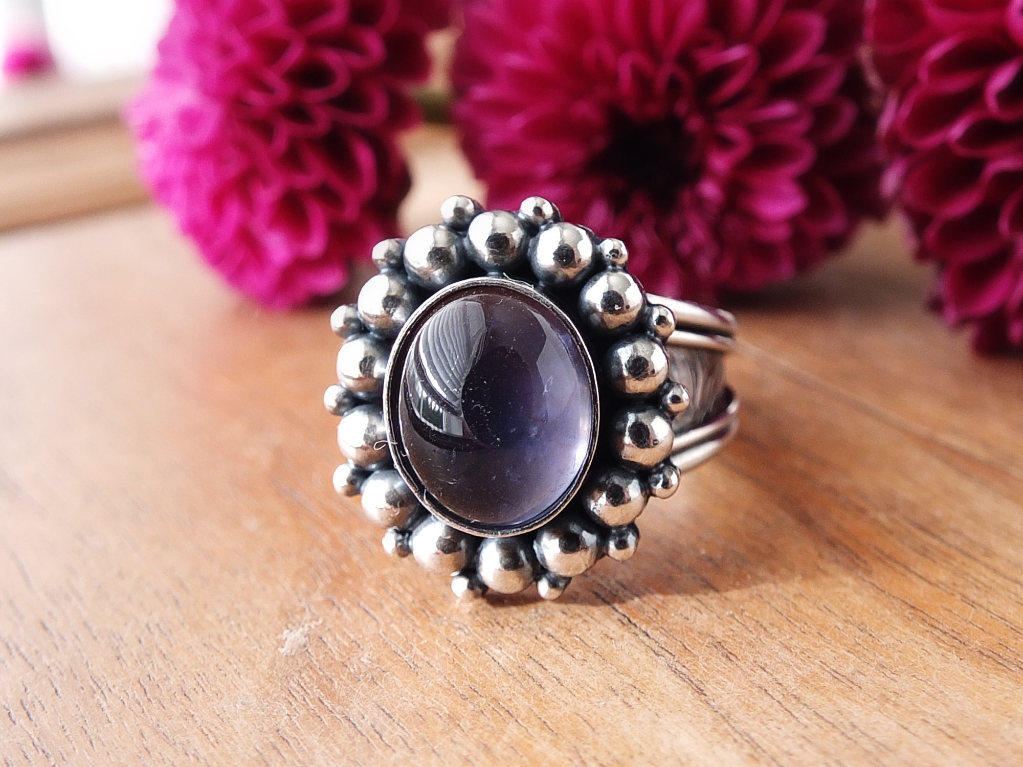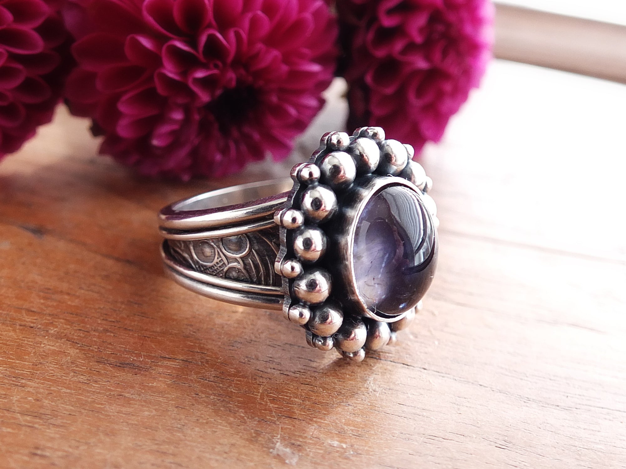 This artisan ring is available for custom sizing. The ring features a beautiful petite Iolite cabochon. The ring photographed is a mock-up of the final design. The stone is currently floating in the setting. When finished and properly set, the ring will have a much cleaner look. Additionally, the band design can be modified to your preference.