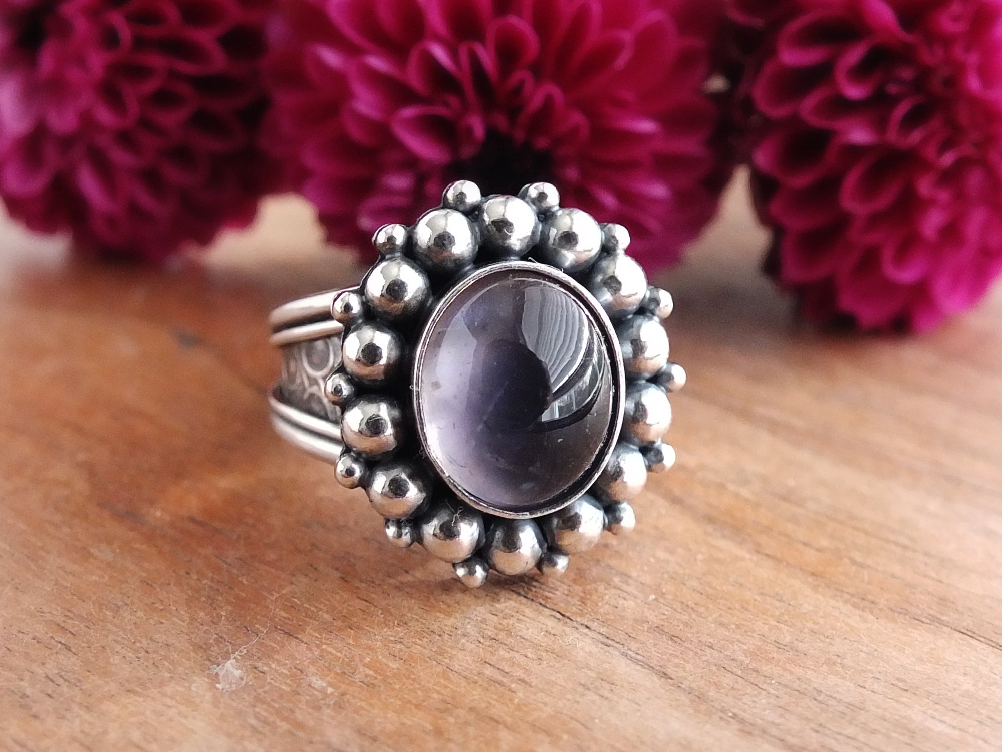 This design features a moderately sized stone previously mentioned nestled in an embellished setting of sterling silver. The band shown is a tapered style band with a minimum width of 6 mm. Overall, the setting and band have been lightly oxidized and polished to a gorgeous shine.