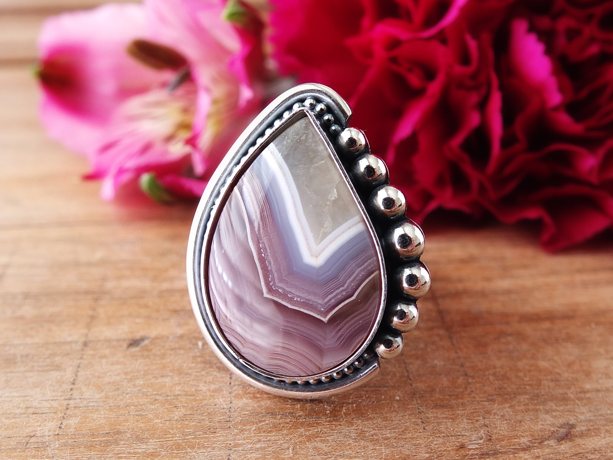 This artisan ring is available for custom sizing. The ring features a stunning purple Laguna agate cabochon. The ring photographed is a mock-up of the final design. The stone is currently floating in the setting. When finished and properly set, the ring will have a much cleaner look. Additionally, the band design can be modified to your preference.