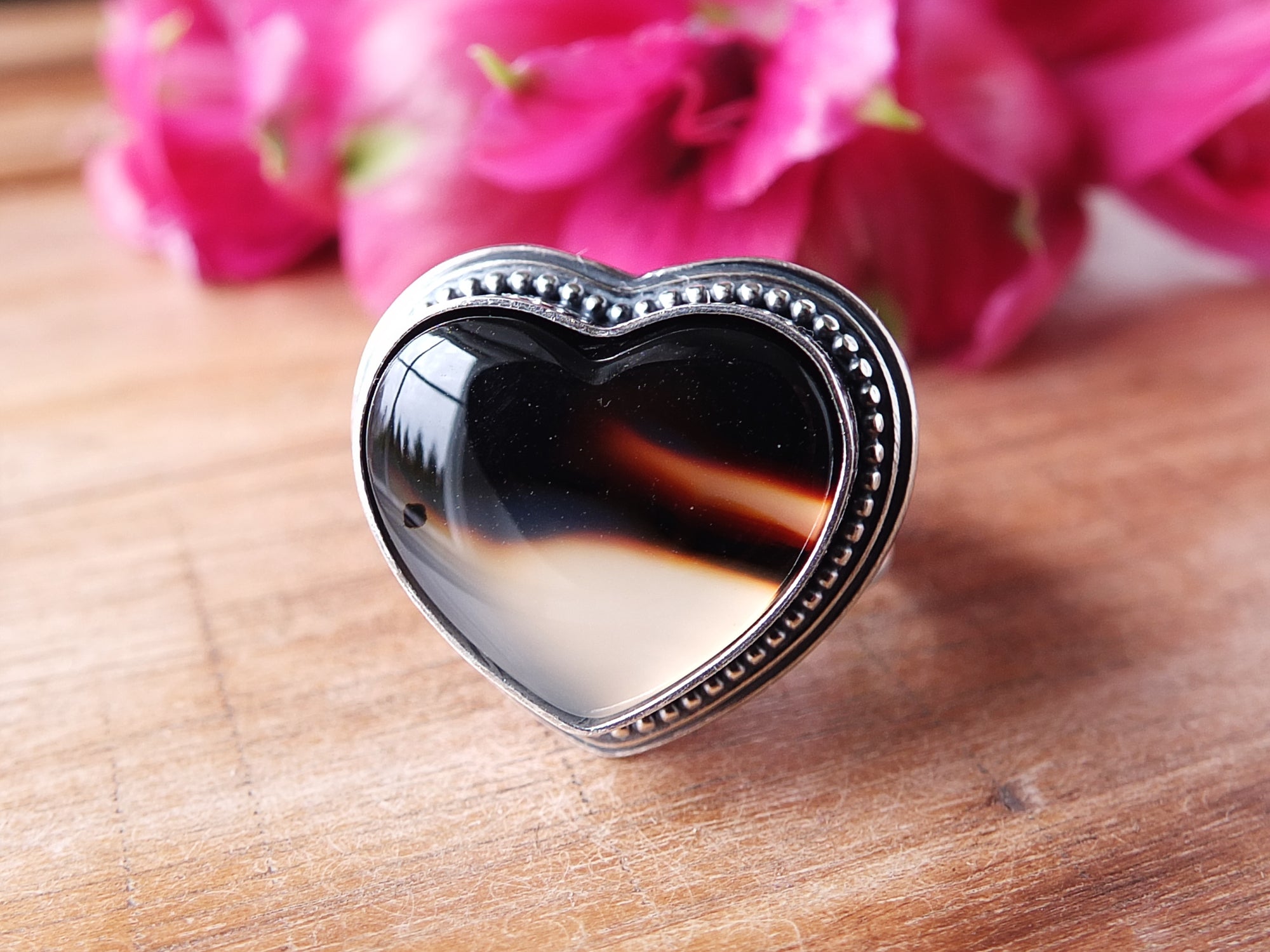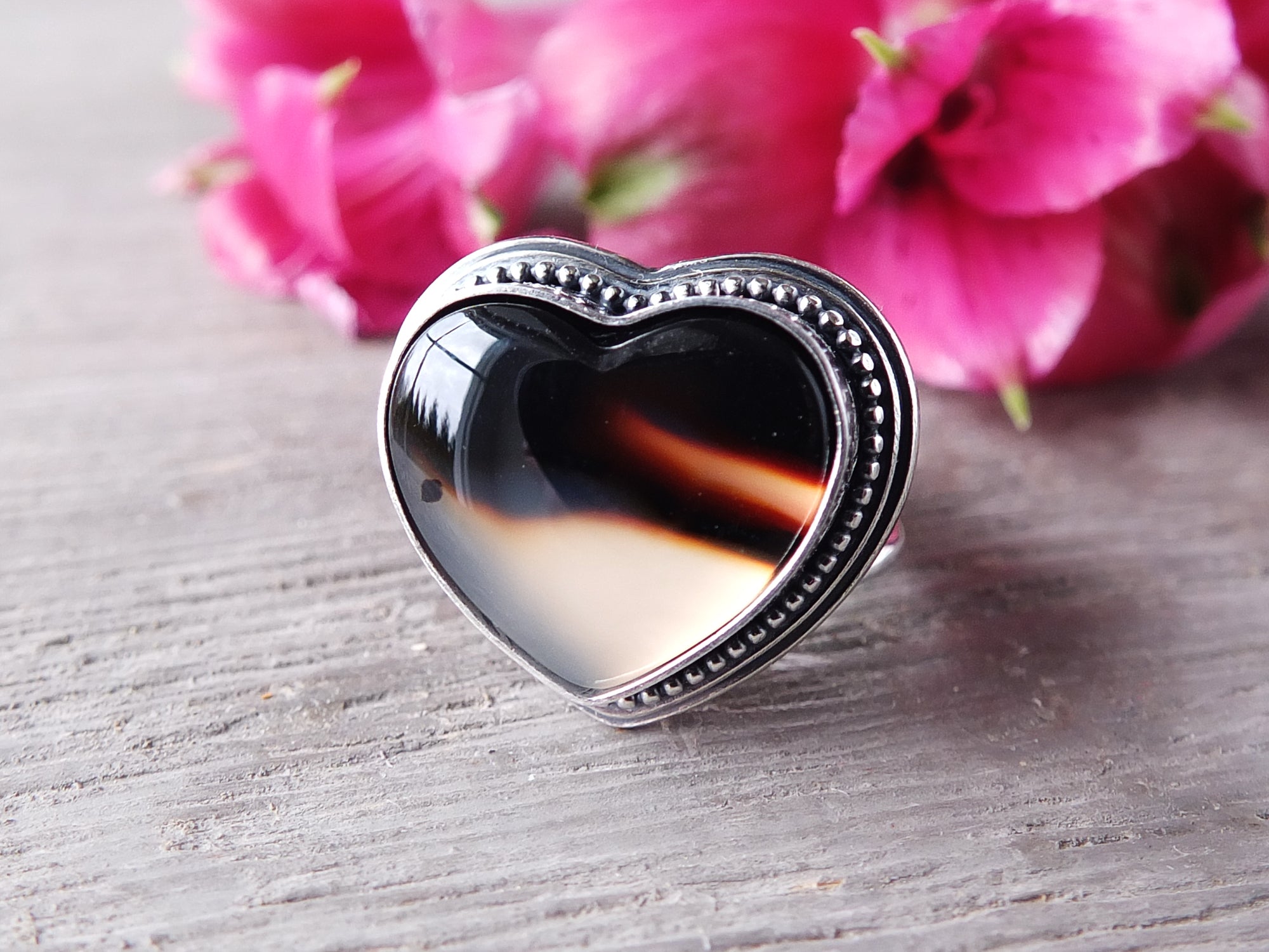 This artisan ring is available for custom sizing. The ring features a stunning heart shaped Montana agate cabochon. The ring photographed is a mock-up of the final design. The stone is currently floating in the setting. When finished and properly set, the ring will have a much cleaner look. Additionally, the band design can be modified to your preference.