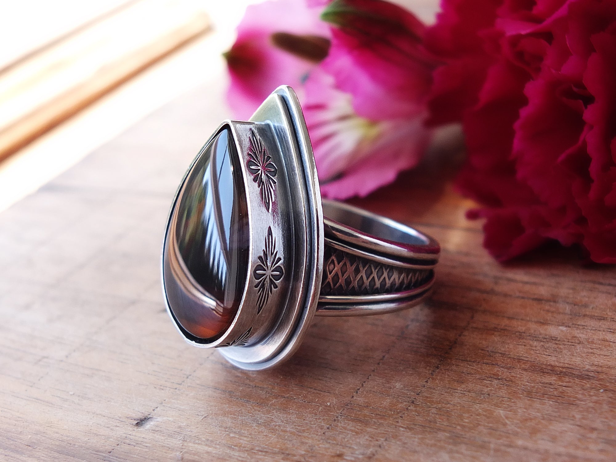 This design features a moderately sized stone previously mentioned nestled in an embellished setting of sterling silver. The band shown is a tapered style band with a minimum width of 6 mm. Overall, the setting and band have been lightly oxidized and polished to a gorgeous shine.