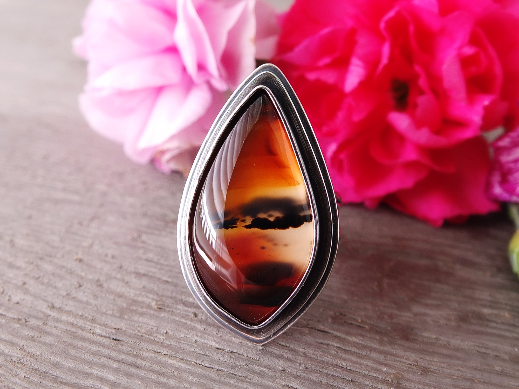 This artisan ring is available for custom sizing. The ring features a stunning Montana Agate cabochon. The ring photographed is a mock-up of the final design. The stone is currently floating in the setting. When finished and properly set, the ring will have a much cleaner look. Additionally, the band design can be modified to your preference.
