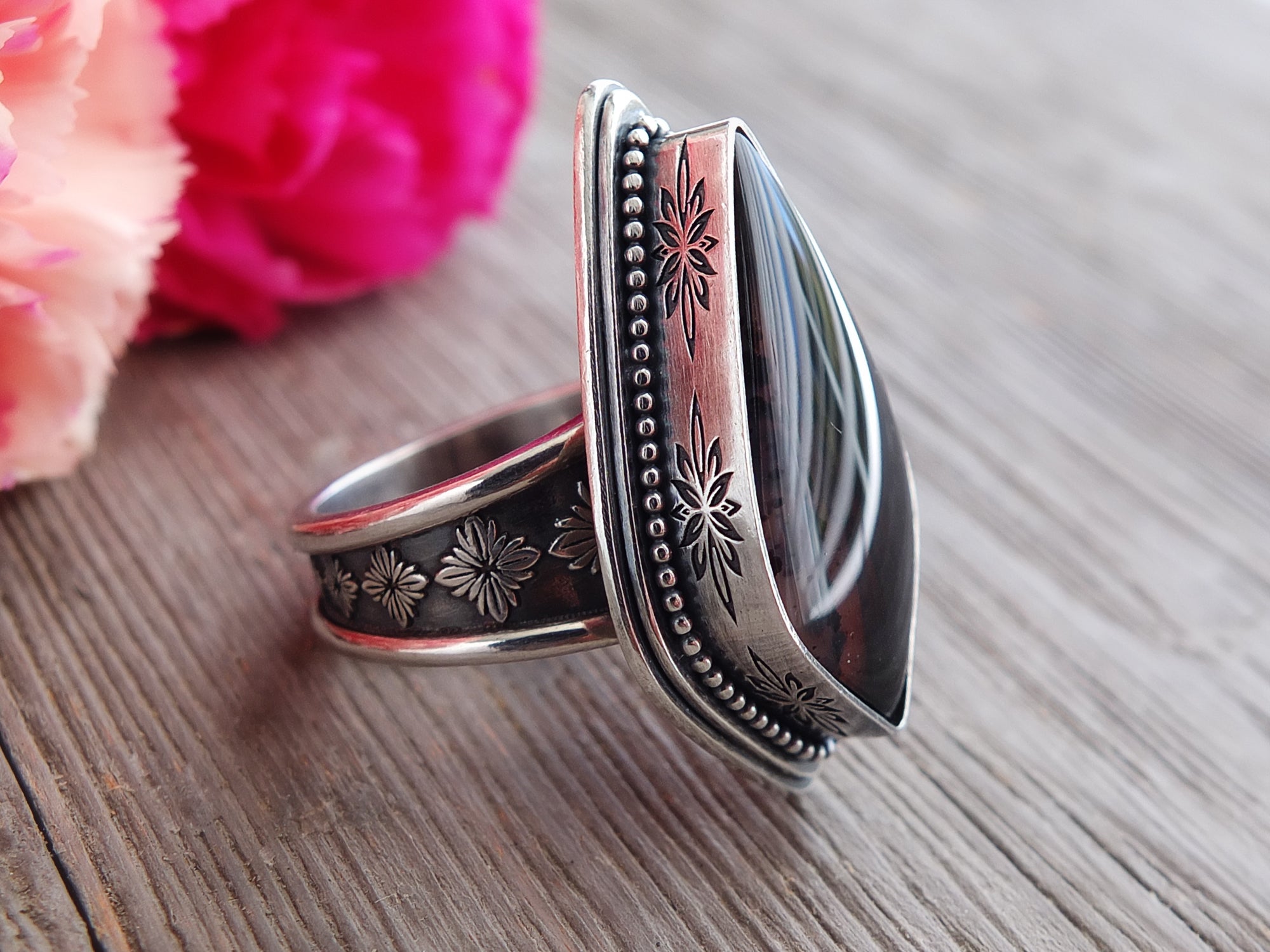 This artisan ring is available for custom sizing. The ring features a stunning Montana Agate cabochon. The ring photographed is a mock-up of the final design. The stone is currently floating in the setting. When finished and properly set, the ring will have a much cleaner look. Additionally, the band design can be modified to your preference.