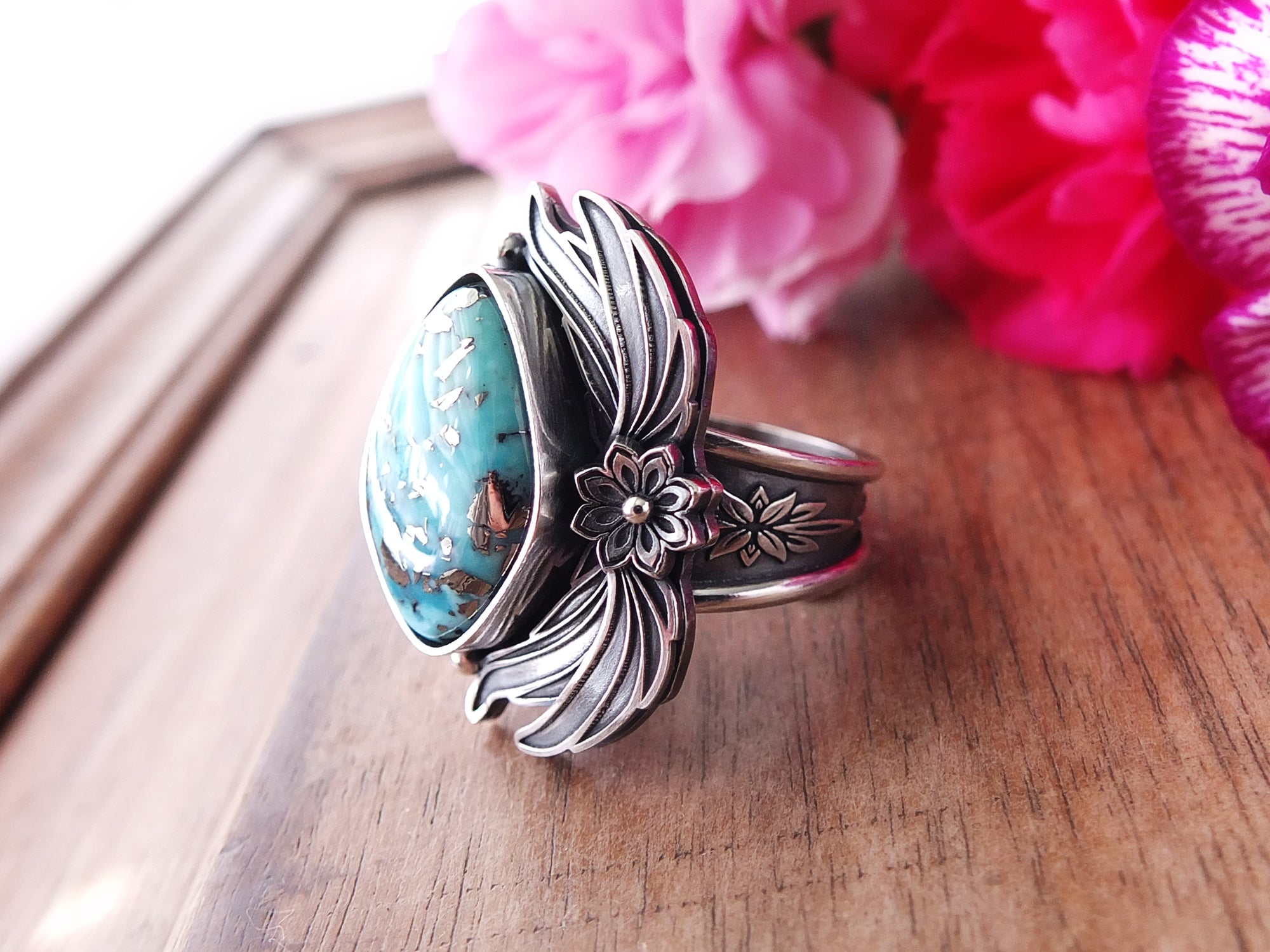 This artisan ring is available for custom sizing. The ring features a beautiful blue Persian Turquoise cabochon featuring shiny flecks of Pyrite. The ring photographed is a mock-up of the final design. The stone is currently floating in the setting. When finished and properly set, the ring will have a much cleaner look. Additionally, the band design can be modified to your preference.