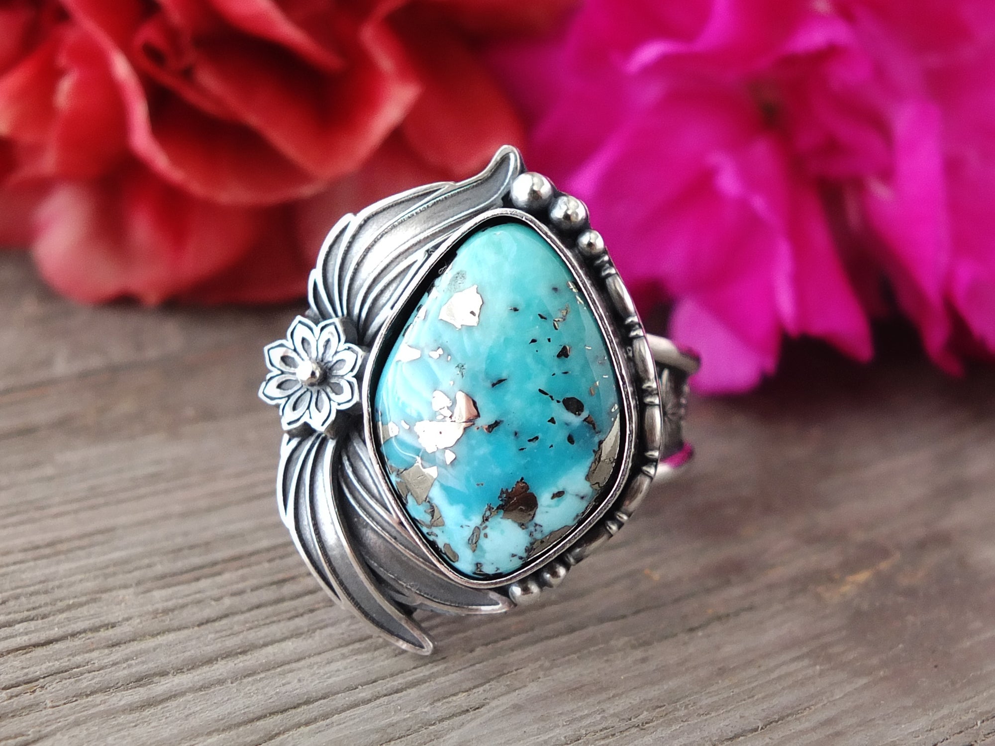 This artisan ring is available for custom sizing. The ring features a beautiful blue Persian Turquoise with Pyrite cabochon. The ring photographed is a mock-up of the final design. The stone is currently floating in the setting. When finished and properly set, the ring will have a much cleaner look. Additionally, the band design can be modified to your preference.