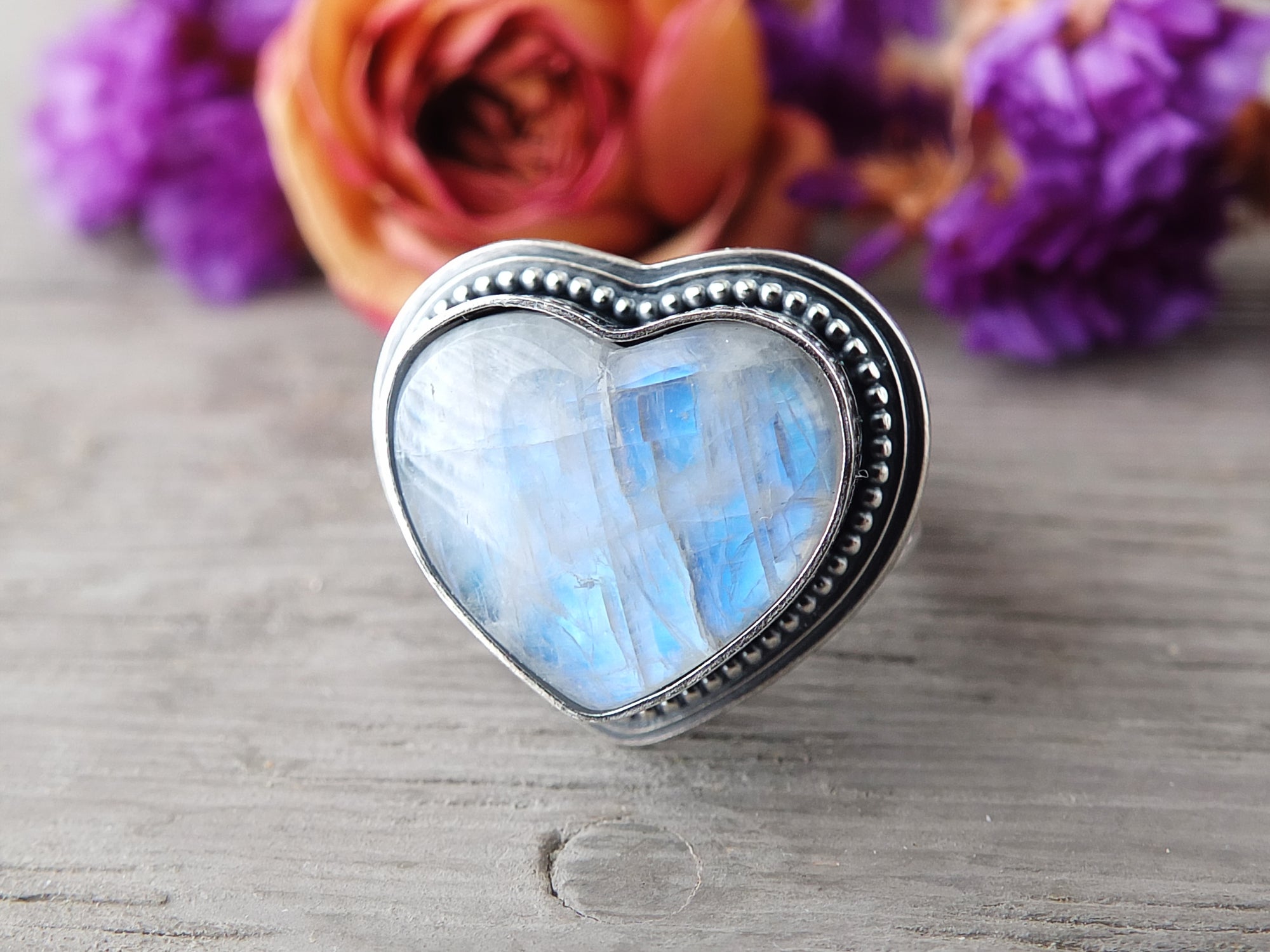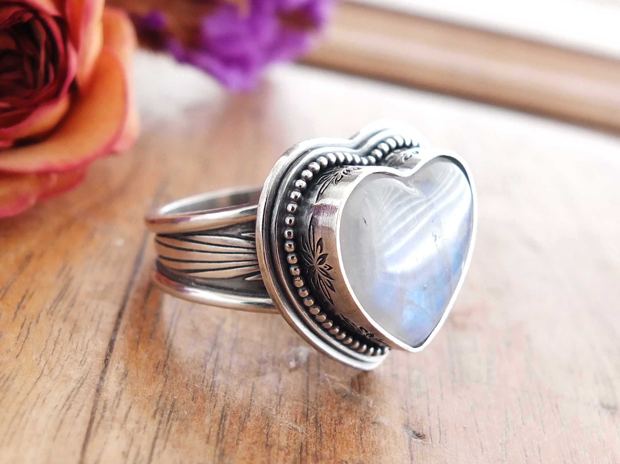 This artisan ring is available for custom sizing. The ring features a beautiful heart shaped Rainbow moonstone cabochon. The ring photographed is a mock-up of the final design. The stone is currently floating in the setting. When finished and properly set, the ring will have a much cleaner look. Additionally, the band design can be modified to your preference.