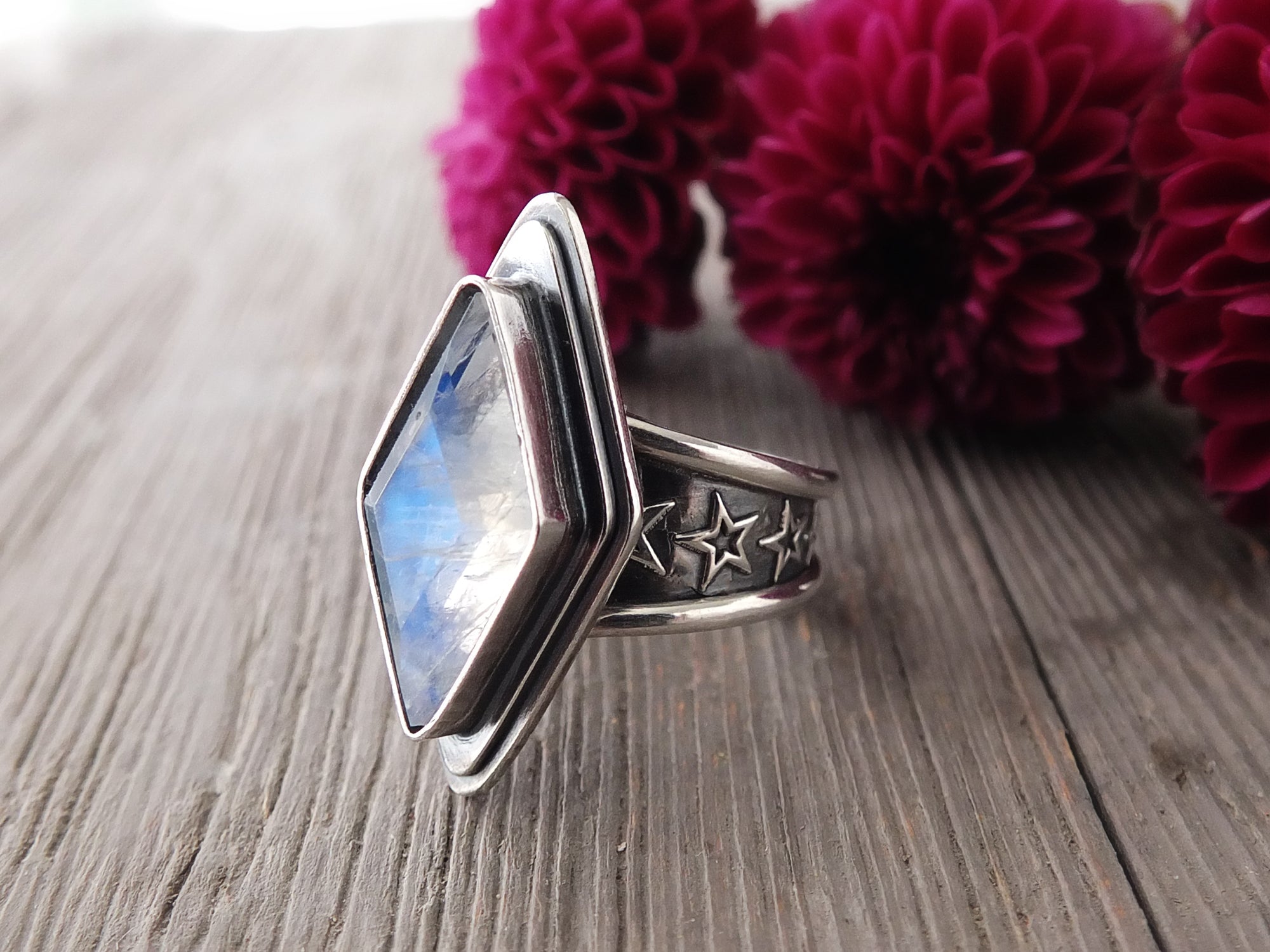 This artisan ring is available for custom sizing. The ring features a beautiful blue flashing Rainbow Moonstone cabochon. The ring photographed is a mock-up of the final design. The stone is currently floating in the setting. When finished and properly set, the ring will have a much cleaner look. Additionally, the band design can be modified to your preference.