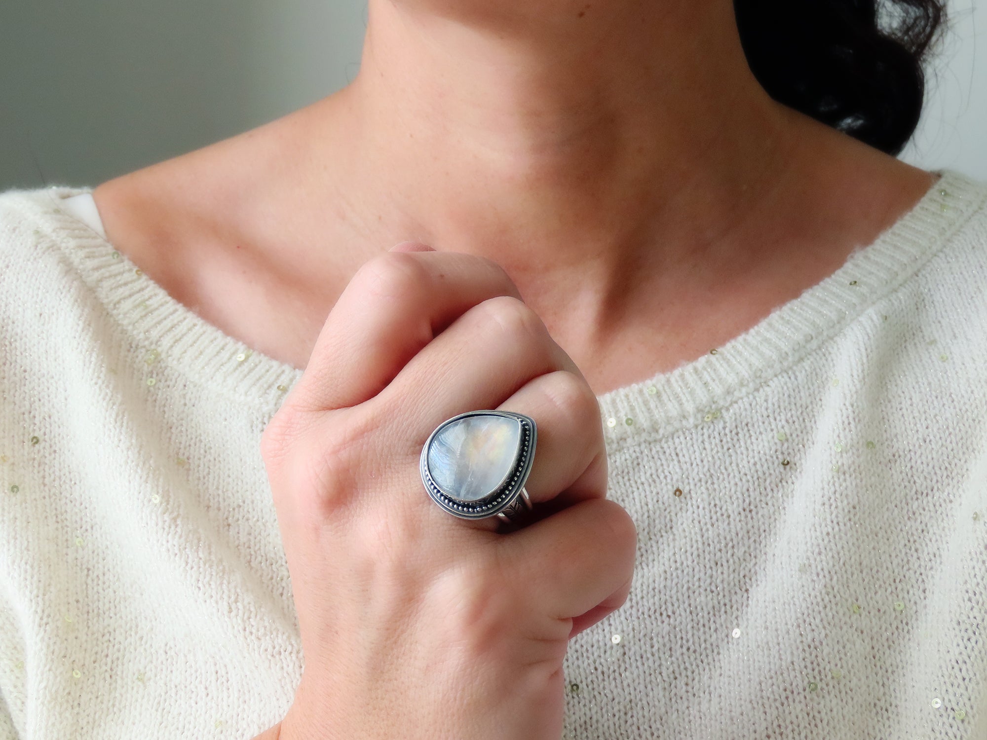 This artisan ring is available for custom sizing. The ring features a beautiful gold shimmering Rainbow Moonstone cabochon. The ring photographed is a mock-up of the final design. The stone is currently floating in the setting. When finished and properly set, the ring will have a much cleaner look. Additionally, the band design can be modified to your preference.