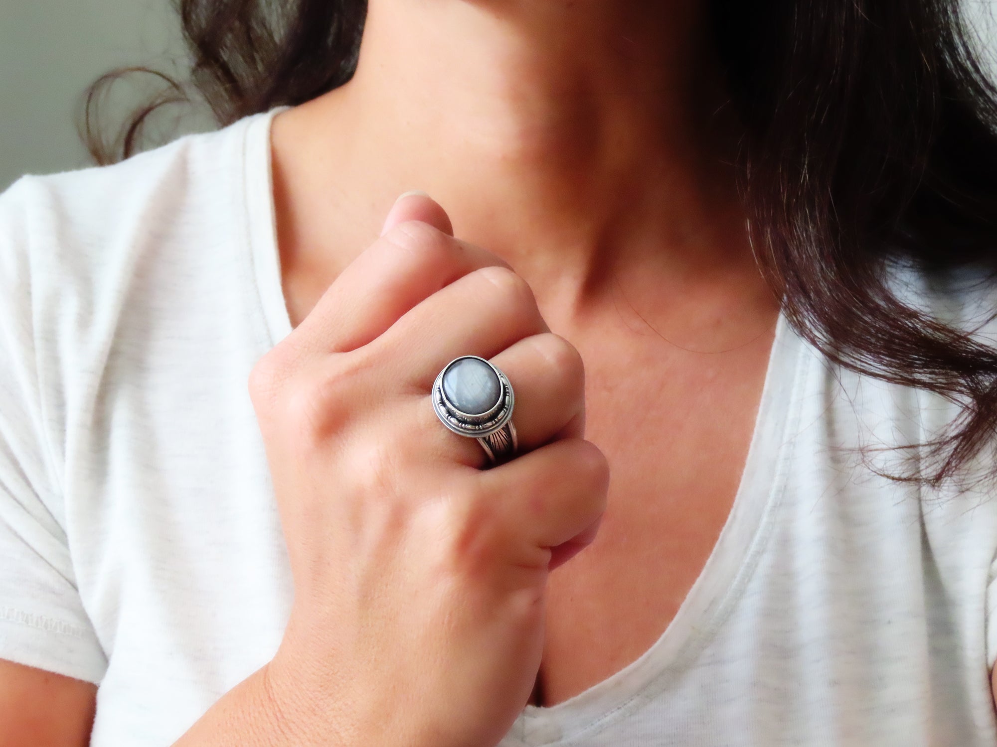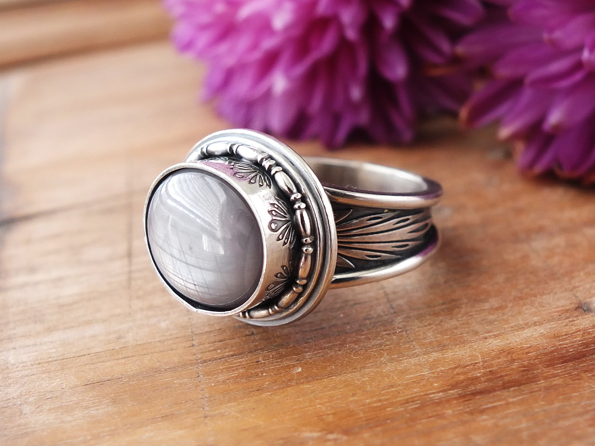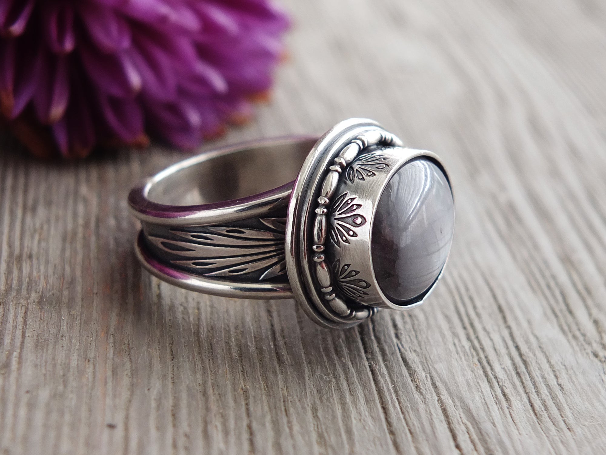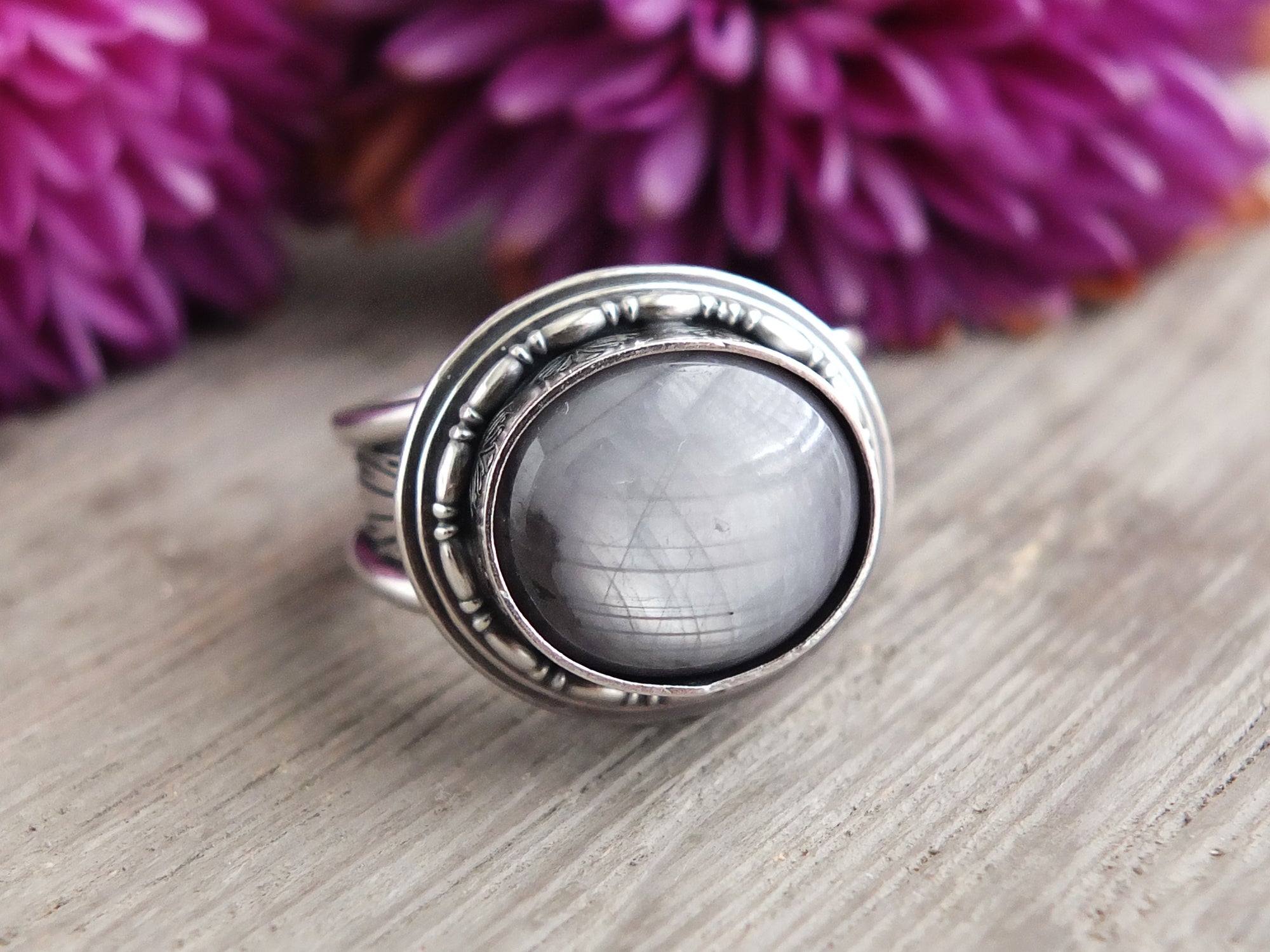 This artisan ring is available for custom sizing. The ring features a gorgeous silver gray Star sapphire cabochon. The ring photographed is a mock-up of the final design. The stone is currently floating in the setting. When finished and properly set, the ring will have a much cleaner look. Additionally, the band design can be modified to your preference.