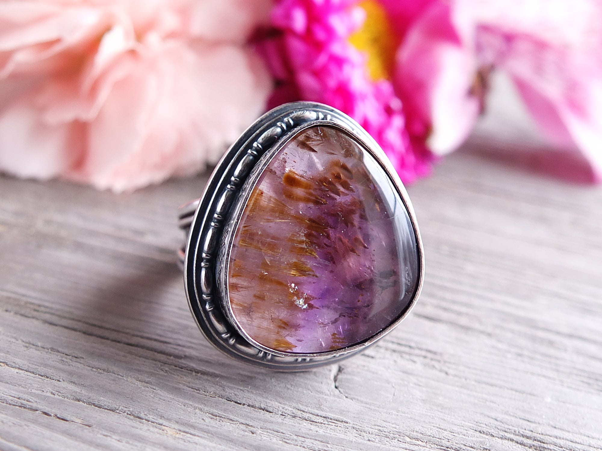 This artisan ring is available for custom sizing. The ring features a phenomenal Super 7 Quartz cabochon. The ring photographed is a mock-up of the final design. The stone is currently floating in the setting. When finished and properly set, the ring will have a much cleaner look. Additionally, the band design can be modified to your preference.