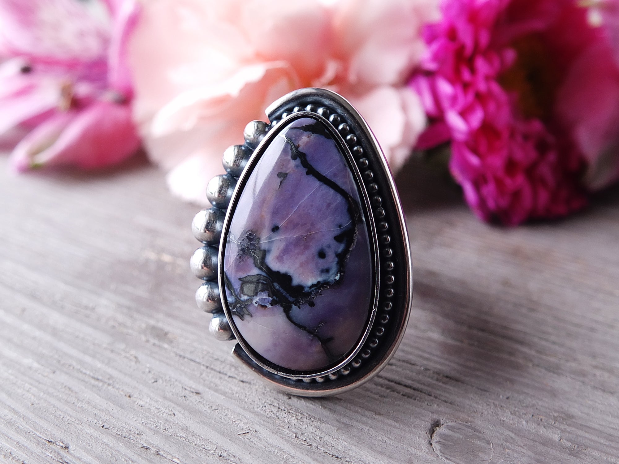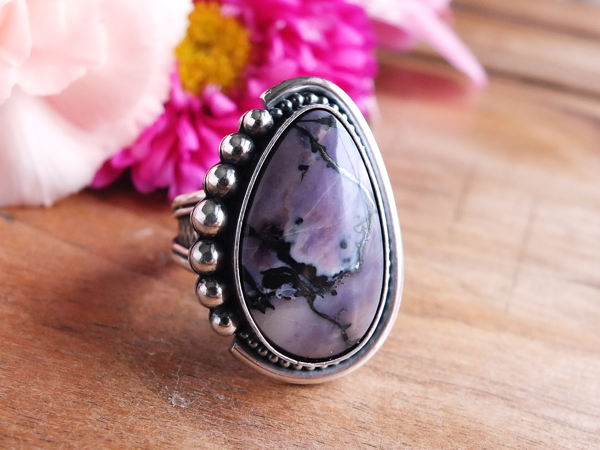 This artisan ring is available for custom sizing. The ring features a gorgeous Tiffany Stone cabochon. The ring photographed is a mock-up of the final design. The stone is currently floating in the setting. When finished and properly set, the ring will have a much cleaner look. Additionally, the band design can be modified to your preference.