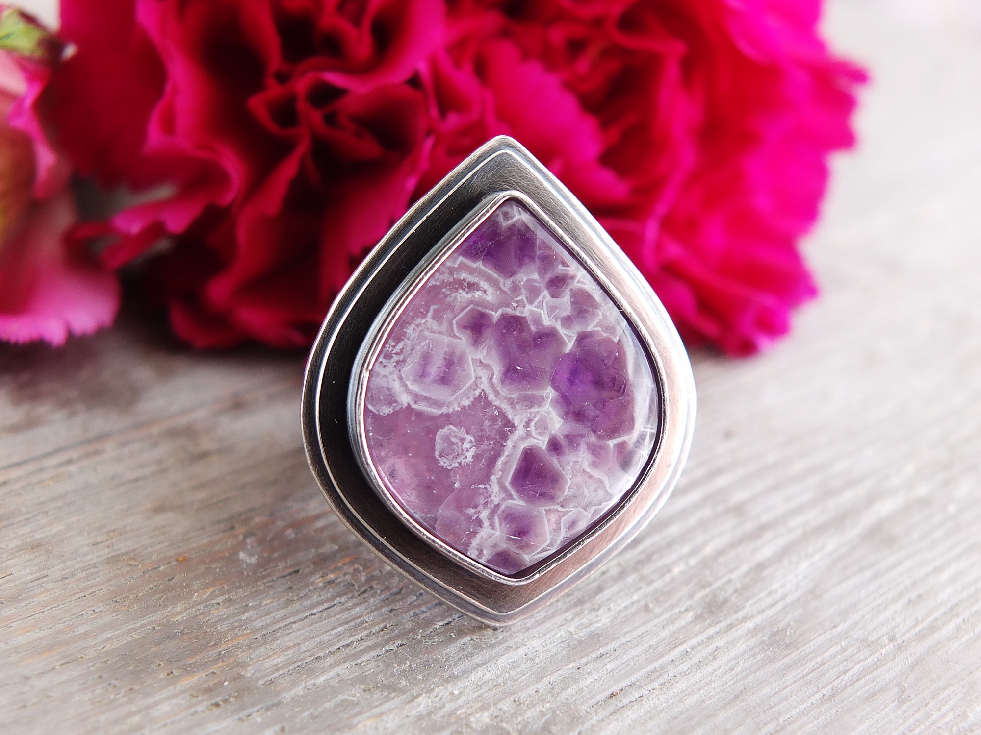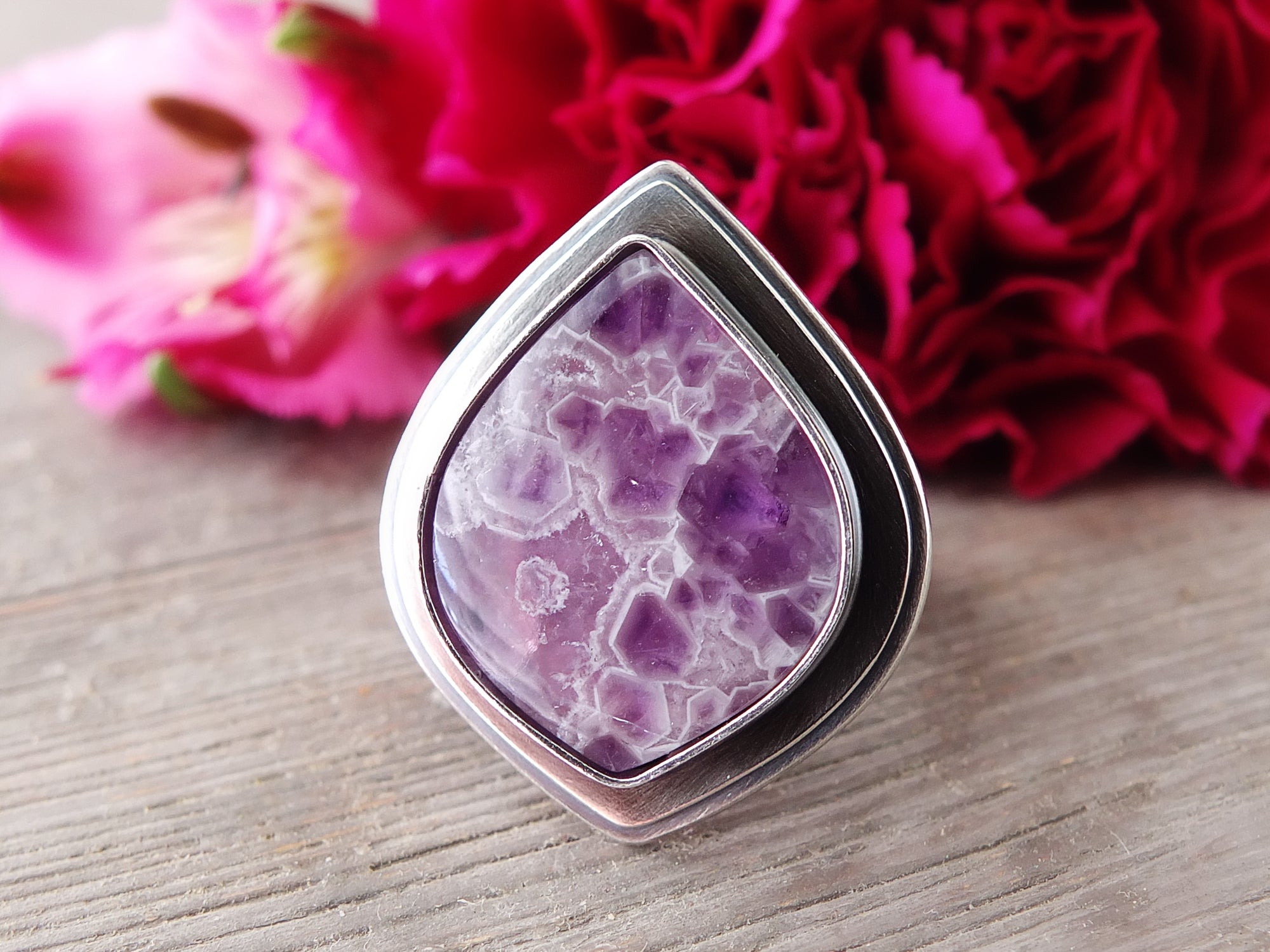 This artisan ring is available for custom sizing. The ring features a stunning purple Amethyst Lace agate cabochon. The ring photographed is a mock-up of the final design. The stone is currently floating in the setting. When finished and properly set, the ring will have a much cleaner look. Additionally, the band design can be modified to your preference.