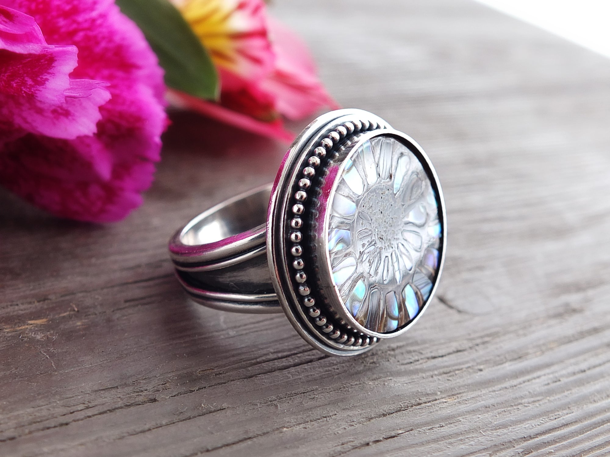 This artisan ring is available for custom sizing. The ring features an adorable little Ammonite cab featuring a colorful Abalone shell inlay. The ring photographed is a mock-up of the final design. The stone is currently floating in the setting. When finished and properly set, the ring will have a much cleaner look. Additionally, the band design can be modified to your preference.