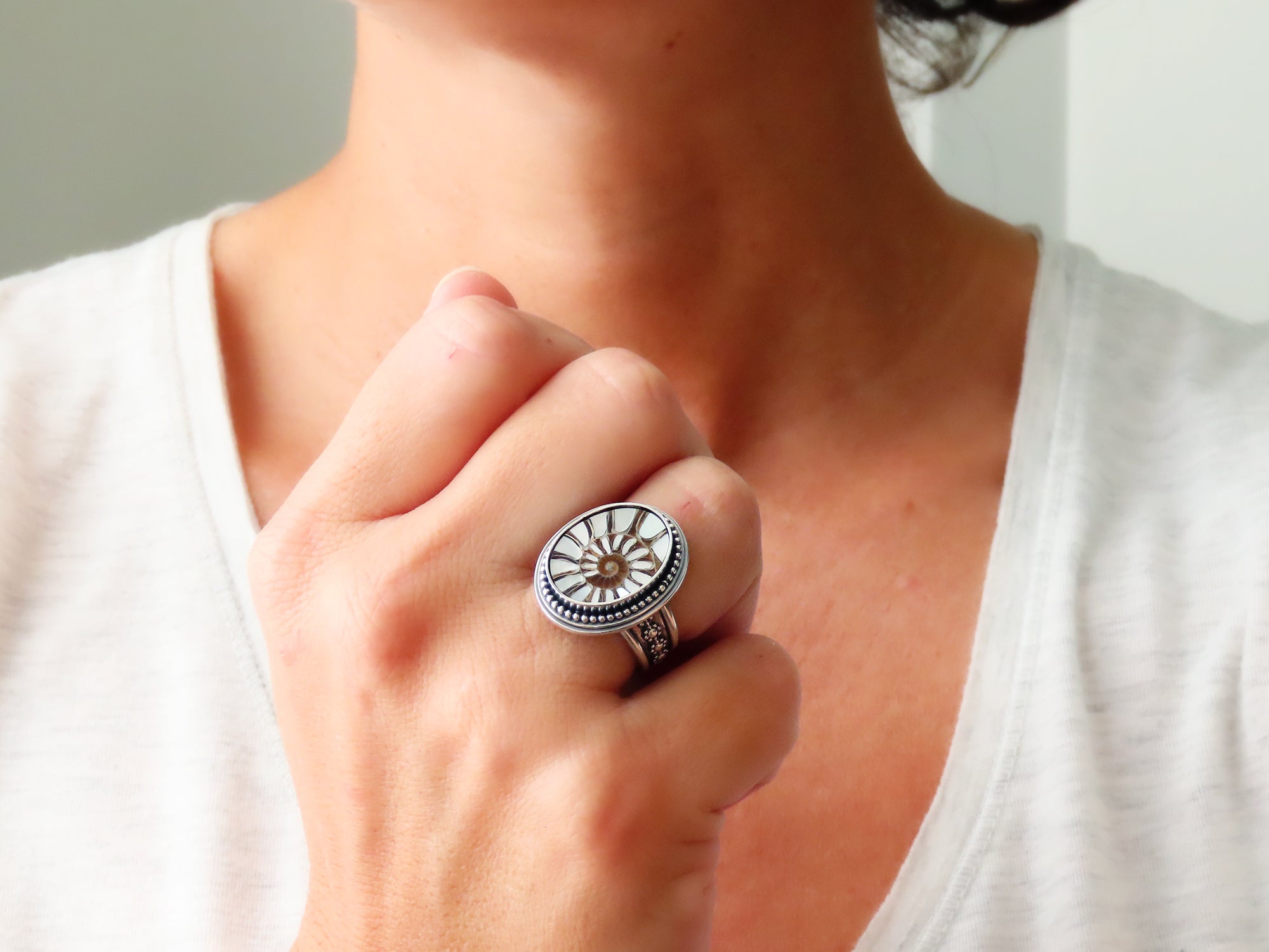 This artisan ring is available for custom sizing. The ring features an adorable little Ammonite cab featuring Mother of Pearl inlay. The ring photographed is a mock-up of the final design. The stone is currently floating in the setting. When finished and properly set, the ring will have a much cleaner look. Additionally, the band design can be modified to your preference.