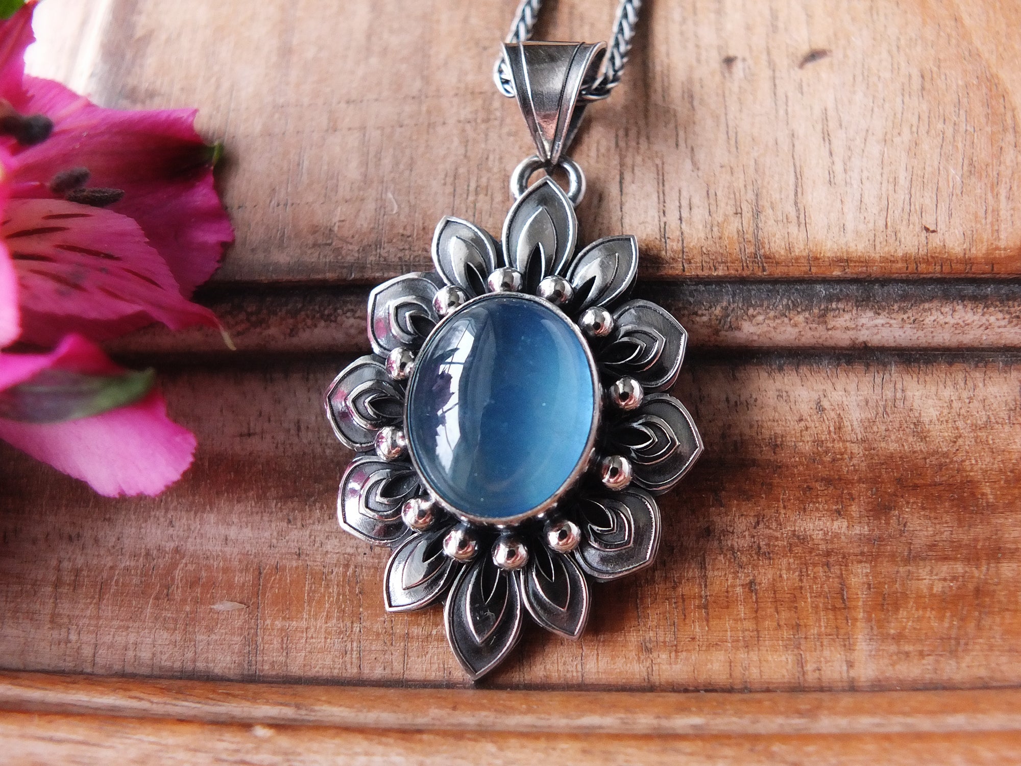 This necklace features a gorgeous blue Aquamarine cabochon. The stone is seated in an embellished setting of sterling silver. The reverse side has been textured and features my signature stamp with hallmarking. The pendant hangs from an 18" chain and has been oxidized then polished to a medium shine.