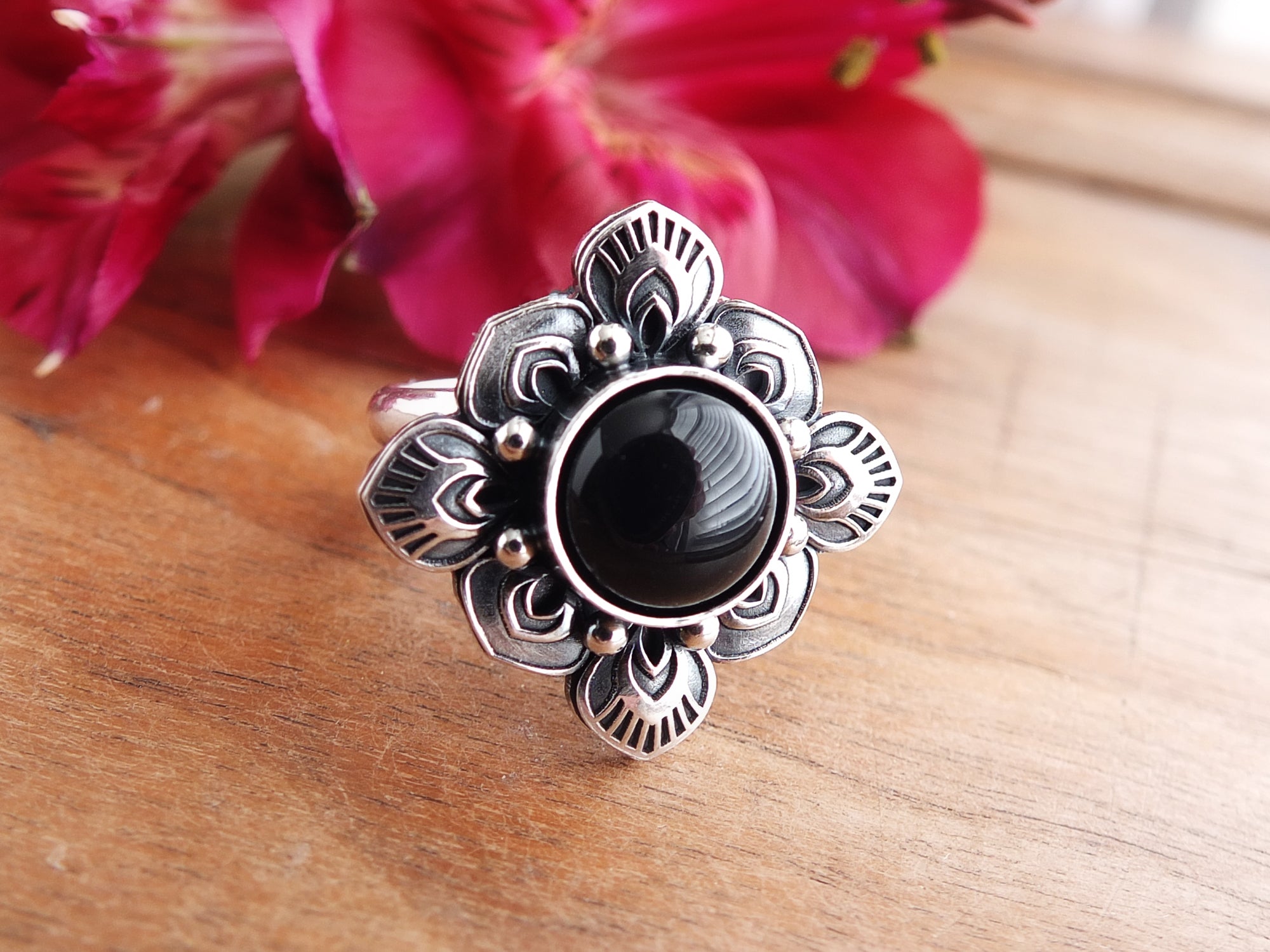 This artisan ring is available for custom sizing. The ring features a striking black Onyx cab. The ring photographed is a mock-up of the final design. The stone is currently floating in the setting. When finished and properly set, the ring will have a much cleaner look. Additionally, the band design can be modified to your preference.