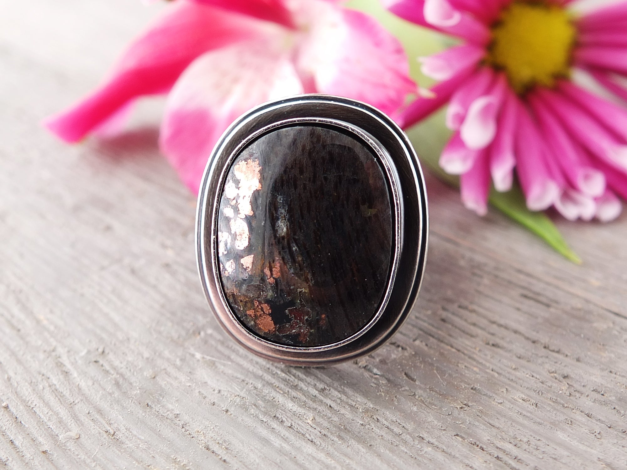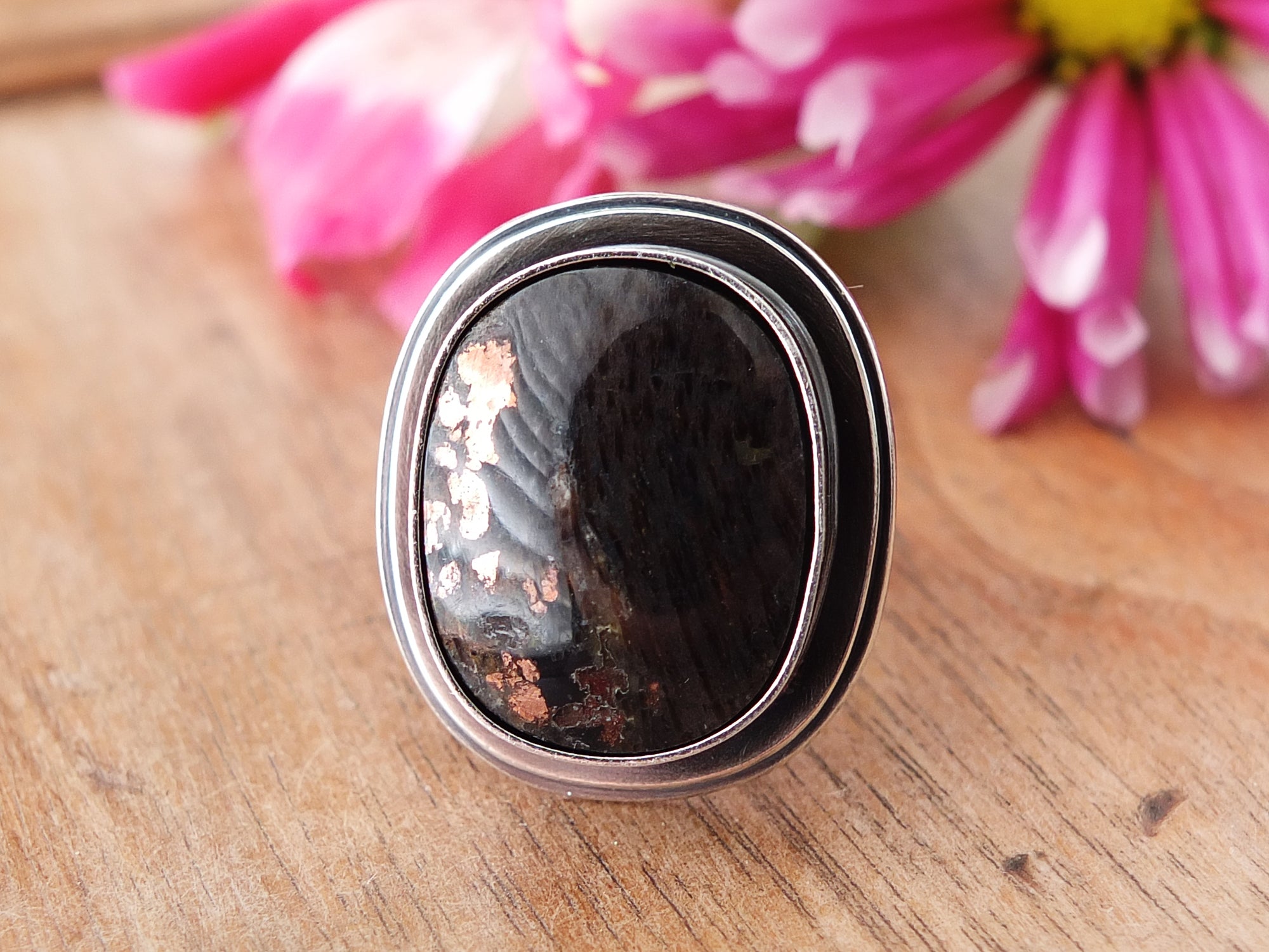 This artisan ring is available for custom sizing. The ring features a stunning little cabochon featuring copper plume in a dark petrified wood material. The ring photographed is a mock-up of the final design. The stone is currently floating in the setting. When finished and properly set, the ring will have a much cleaner look. Additionally, the band design can be modified to your preference.