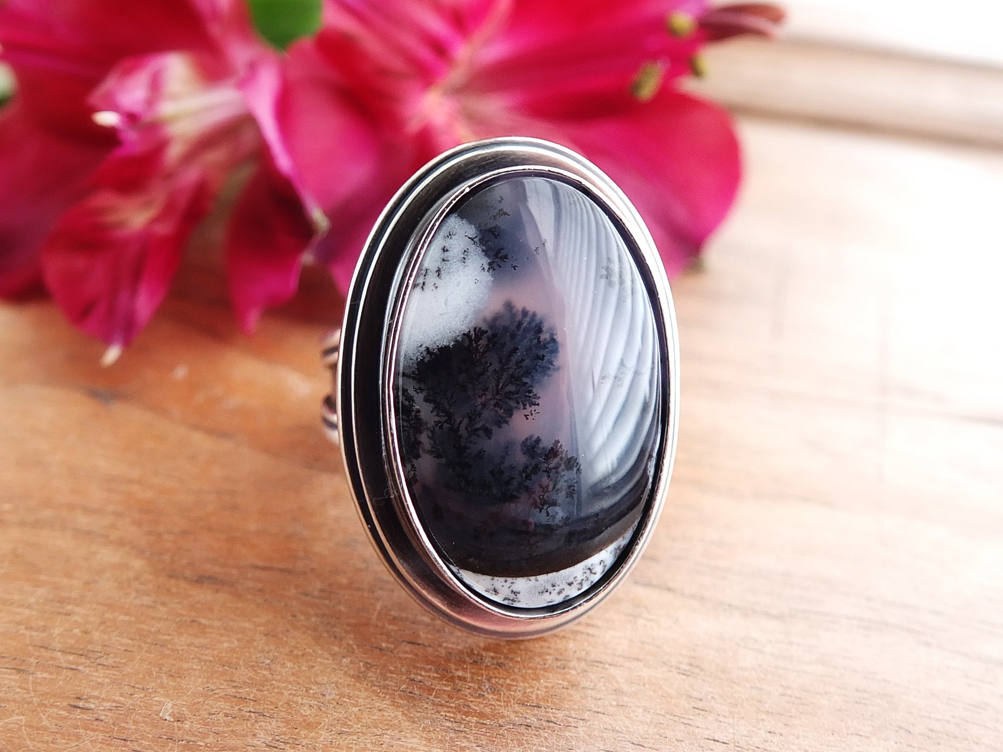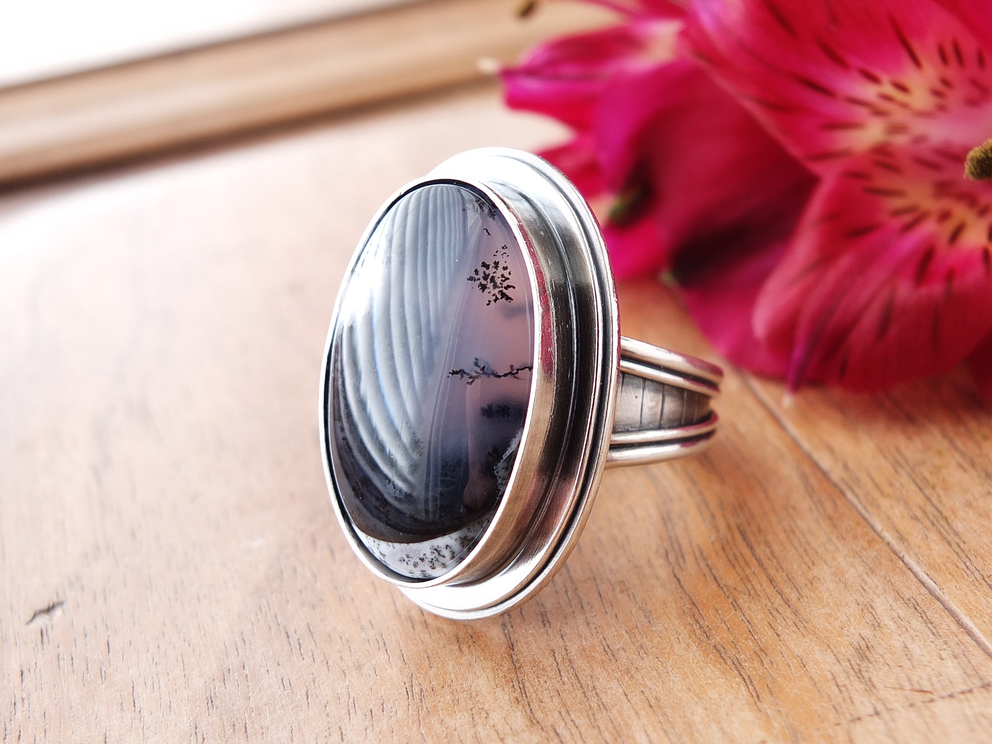 This artisan ring is available for custom sizing. The ring features a gorgeous semi-translucent Dendritic Opal cabochon. The ring photographed is a mock-up of the final design. The stone is currently floating in the setting. When finished and properly set, the ring will have a much cleaner look. Additionally, the band design can be modified to your preference.