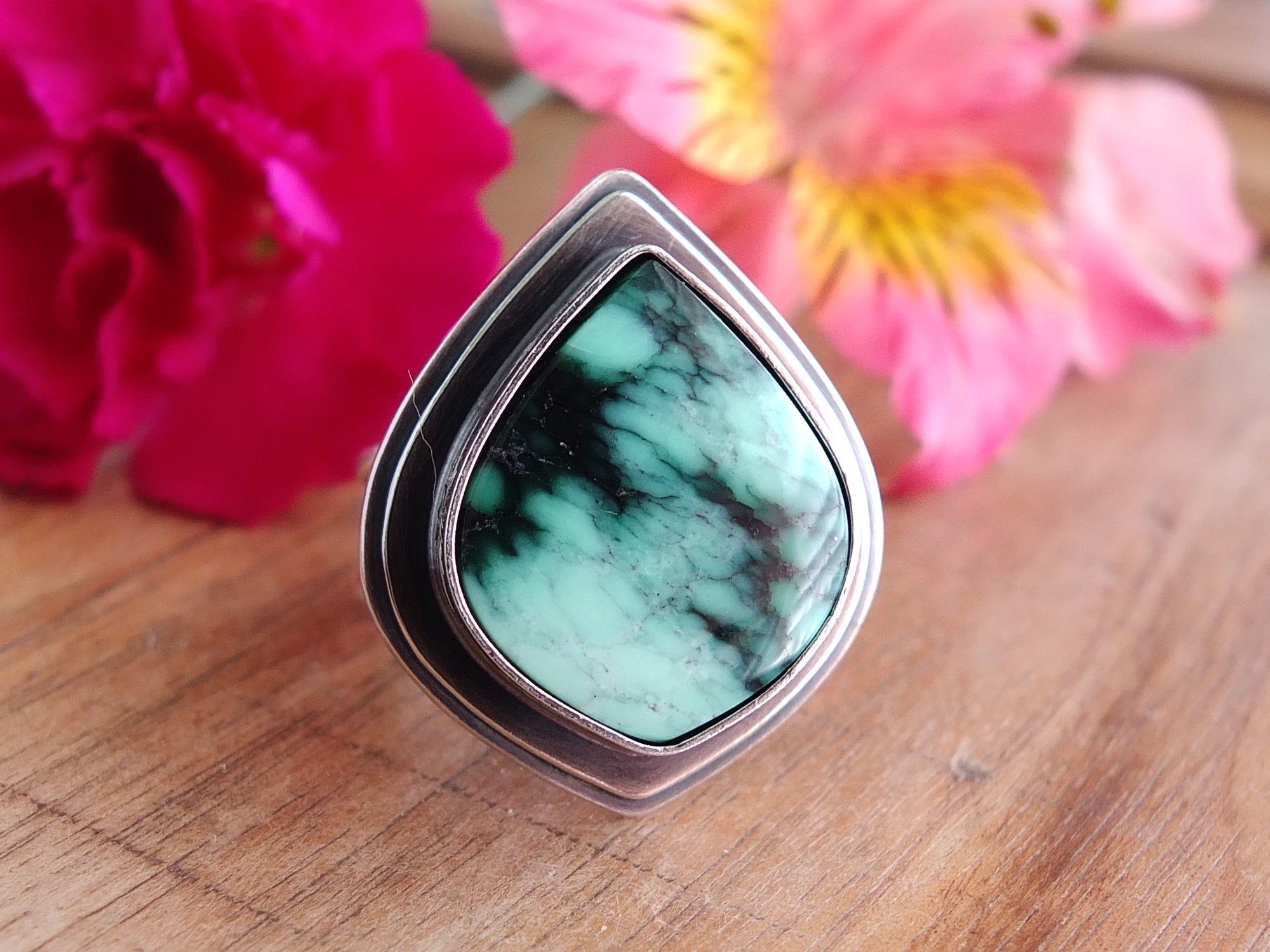 This artisan ring is available for custom sizing. The ring features a stunning green Emerald Rose Variscite cabochon. The ring photographed is a mock-up of the final design. The stone is currently floating in the setting. When finished and properly set, the ring will have a much cleaner look. Additionally, the band design can be modified to your preference.