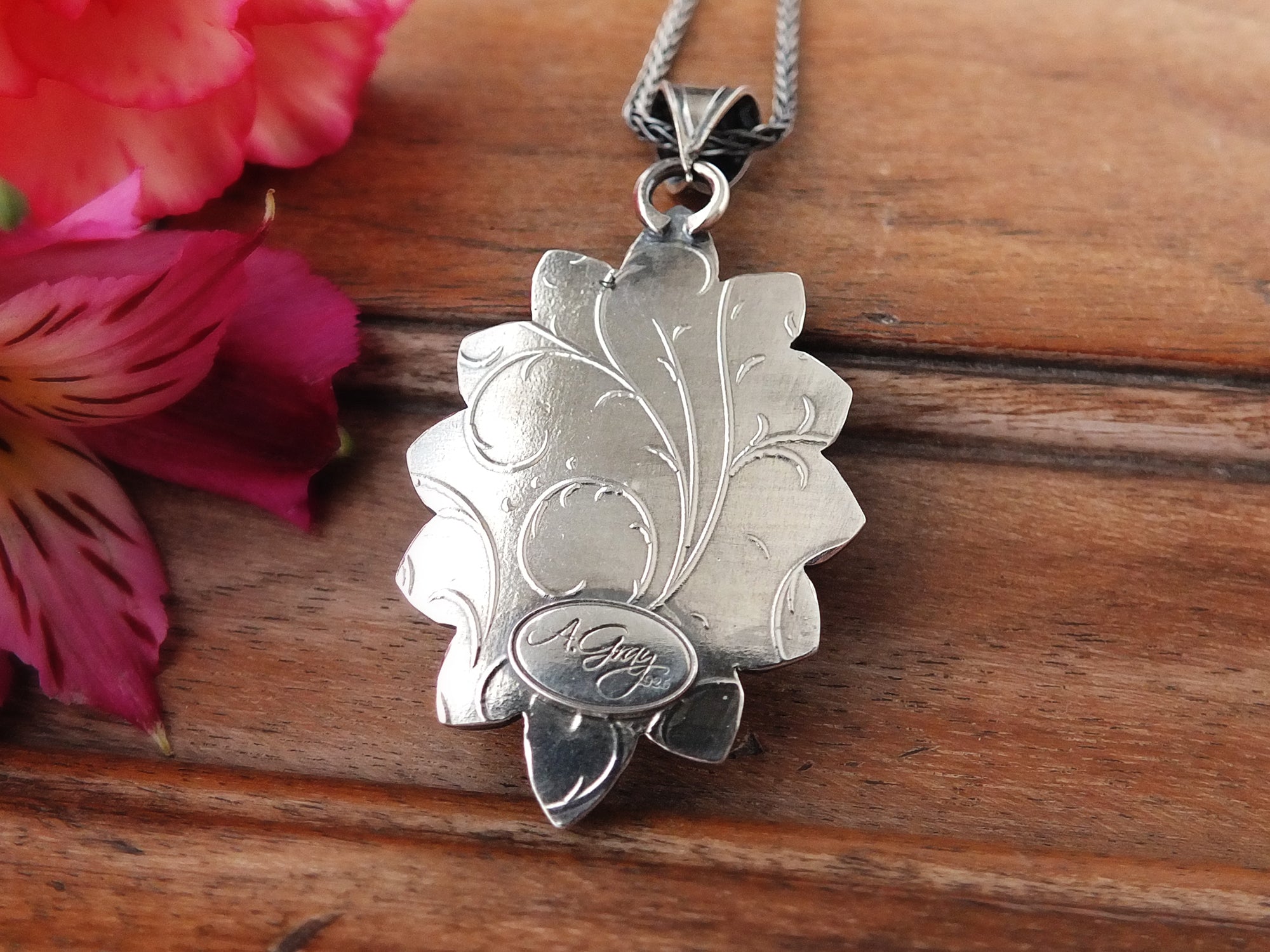 This necklace features a gorgeous Hubei Turquoise cabochon. The stone is seated in an embellished setting of sterling silver. The reverse side has been textured and features my signature stamp with hallmarking. The pendant hangs from an 18" chain and has been oxidized then polished to a medium shine.