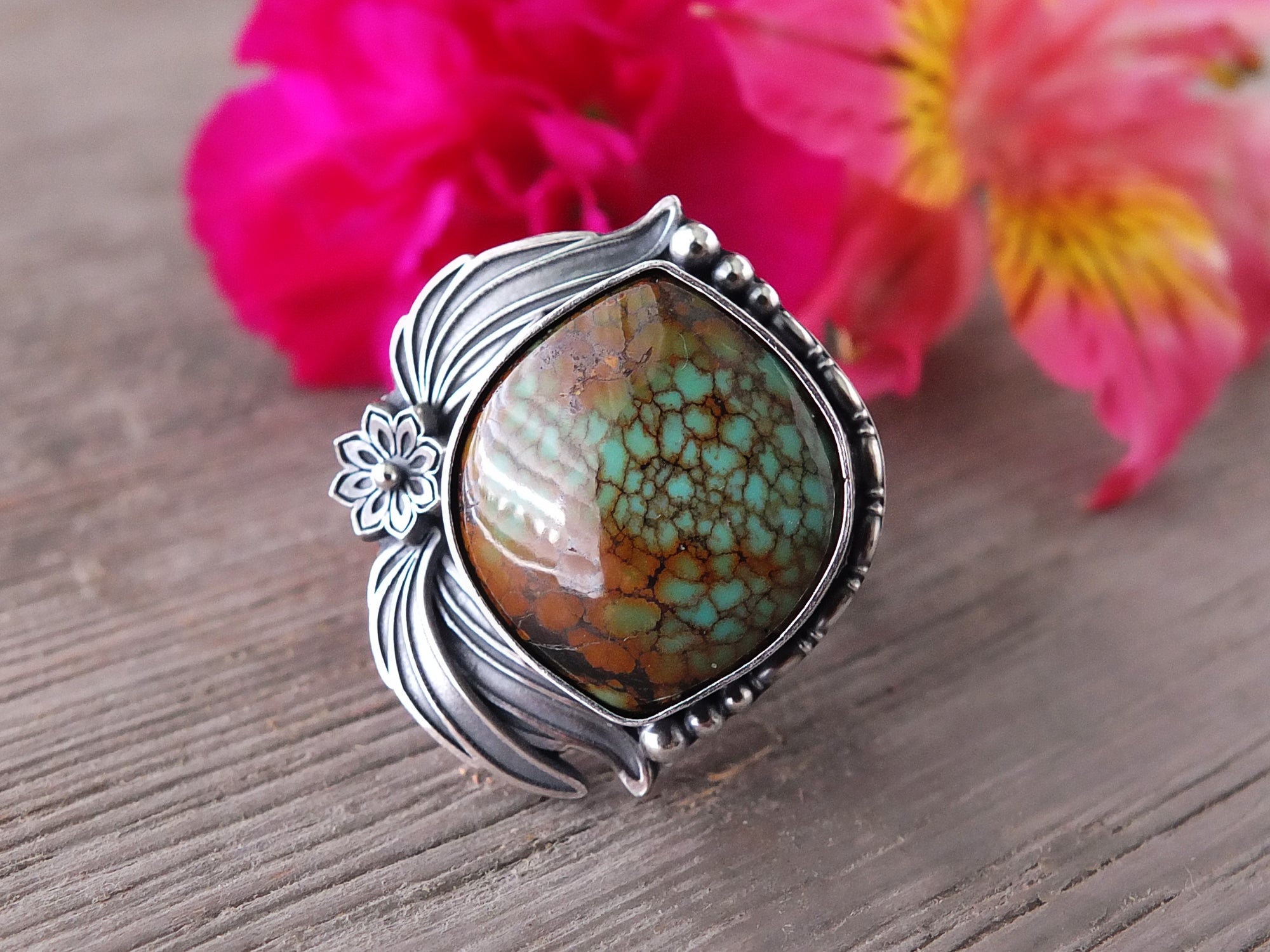 This artisan ring is available for custom sizing. The ring features a gorgeous Hubei Turquoise cabochon. The ring photographed is a mock-up of the final design. The stone is currently floating in the setting. When finished and properly set, the ring will have a much cleaner look. Additionally, the band design can be modified to your preference.