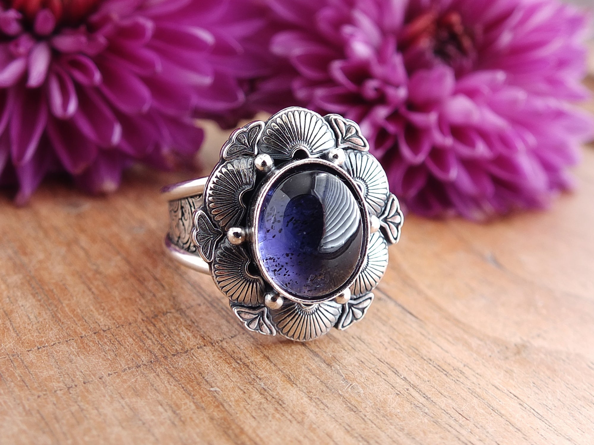 This artisan ring is available for custom sizing. The ring features a beautiful Iolite cabochon. The ring photographed is a mock-up of the final design. The stone is currently floating in the setting. When finished and properly set, the ring will have a much cleaner look. Additionally, the band design can be modified to your preference.