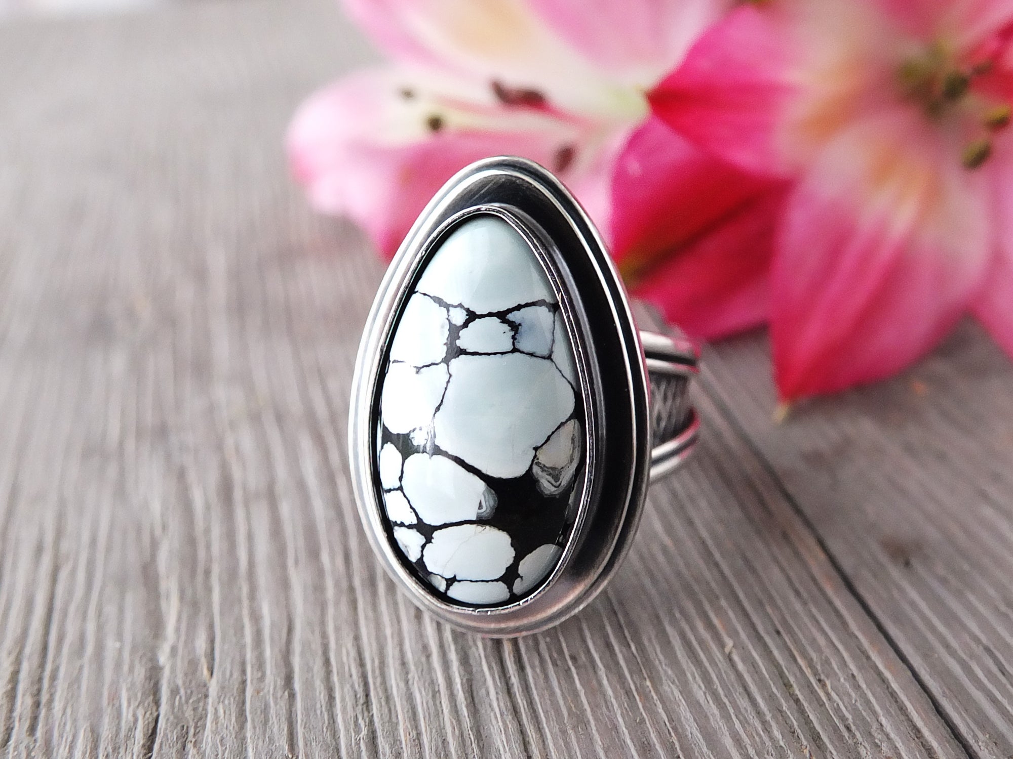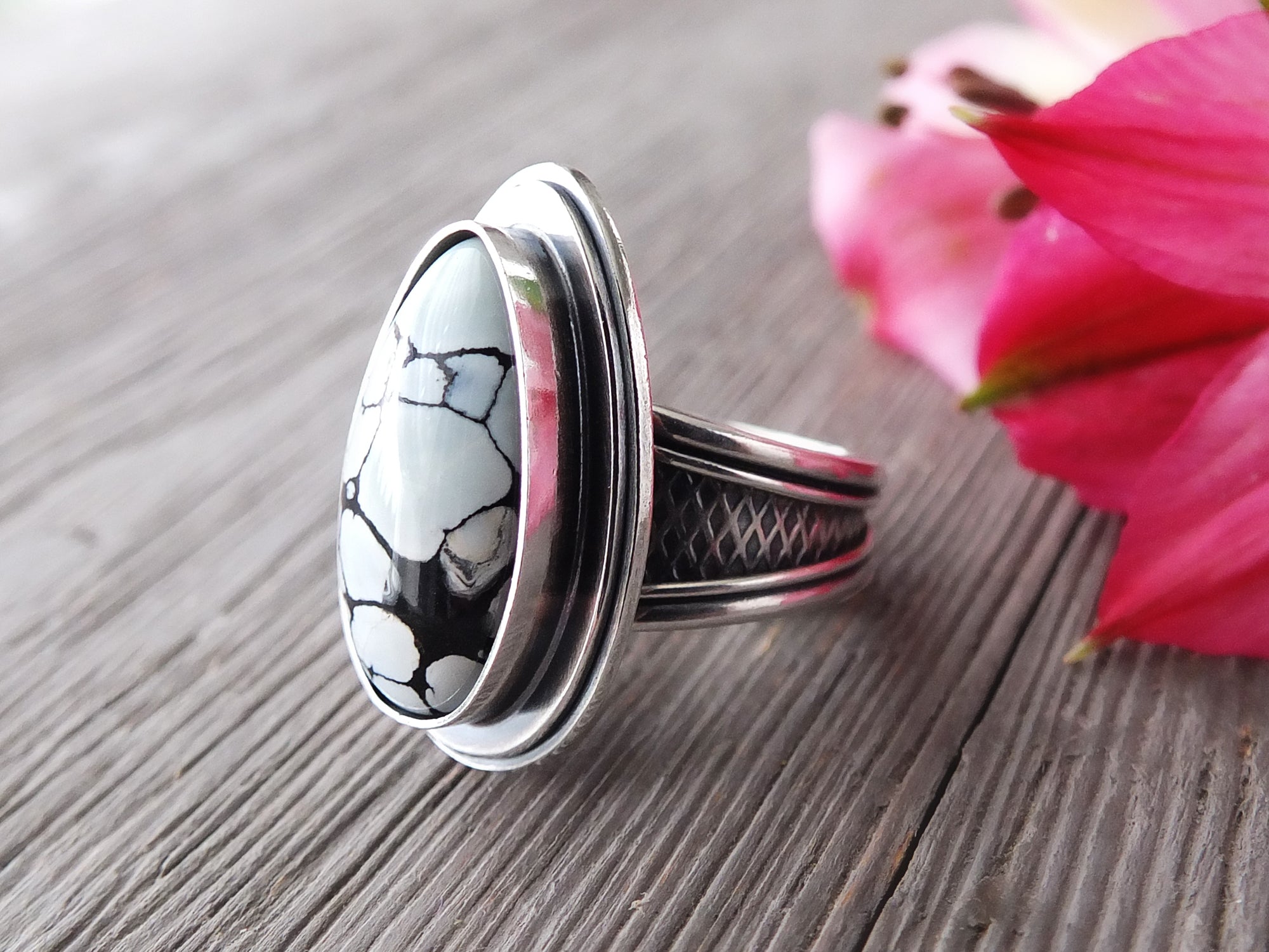 This artisan ring is available for custom sizing. The ring features a gorgeous Ivory Creek variscite cabochon. The ring photographed is a mock-up of the final design. The stone is currently floating in the setting. When finished and properly set, the ring will have a much cleaner look. Additionally, the band design can be modified to your preference.