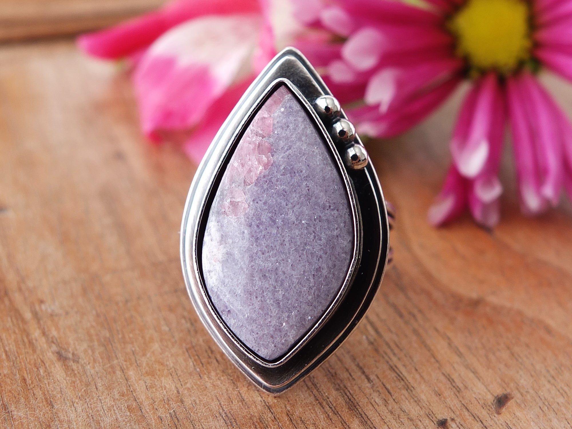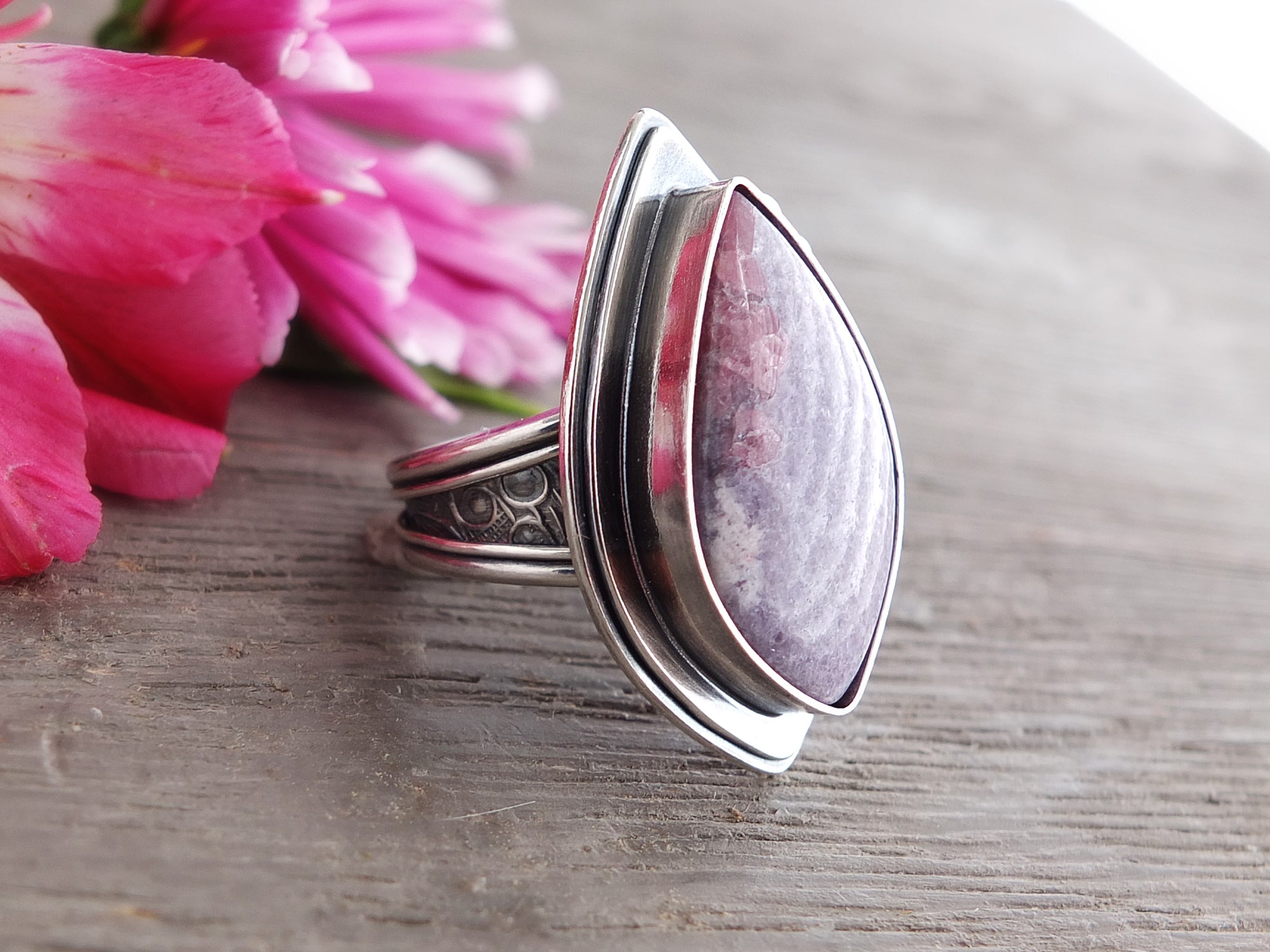 This artisan ring is available for custom sizing. The ring features a beautiful Lepidolite with a strip of pink Tourmaline. The ring photographed is a mock-up of the final design. The stone is currently floating in the setting. When finished and properly set, the ring will have a much cleaner look. Additionally, the band design can be modified to your preference.